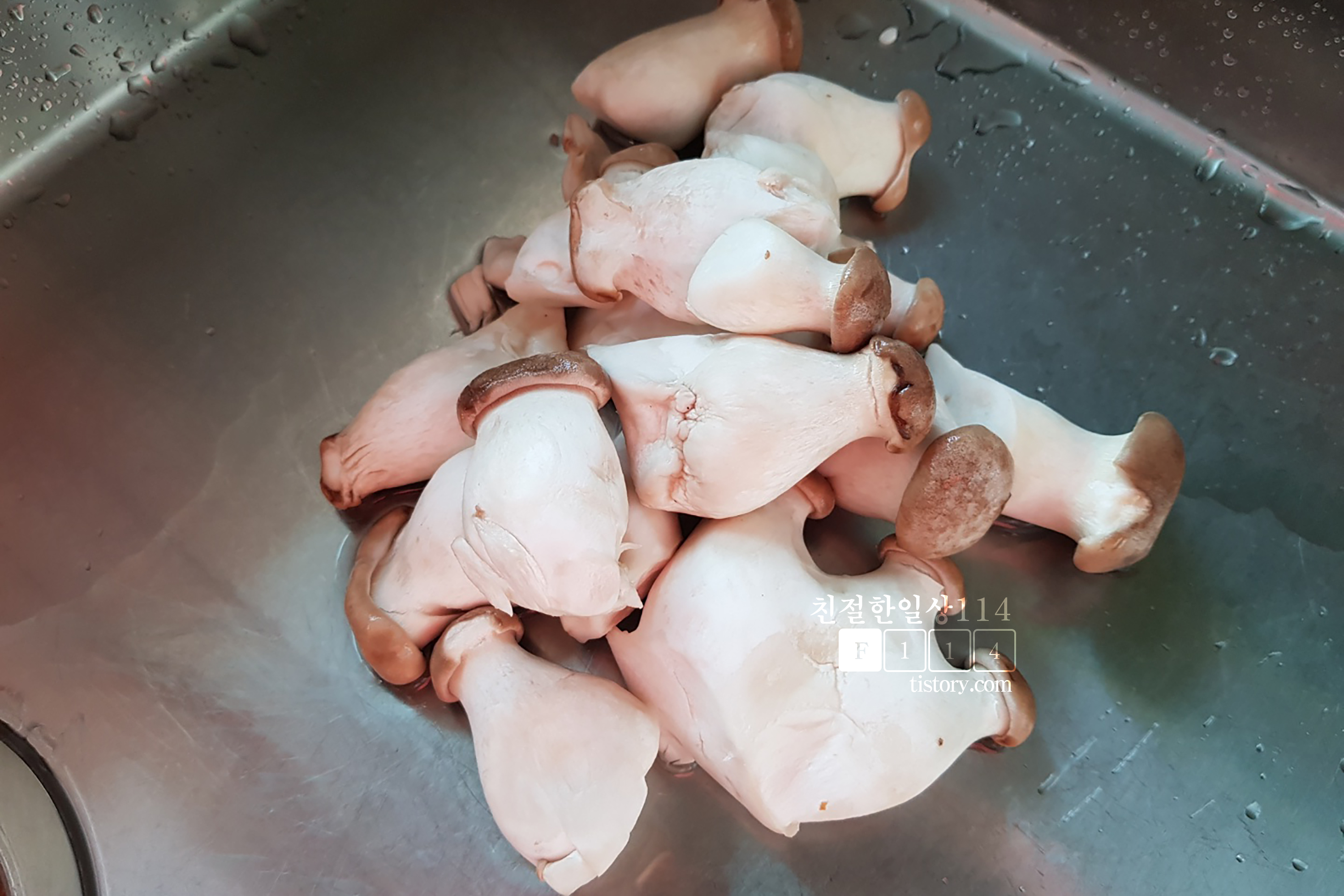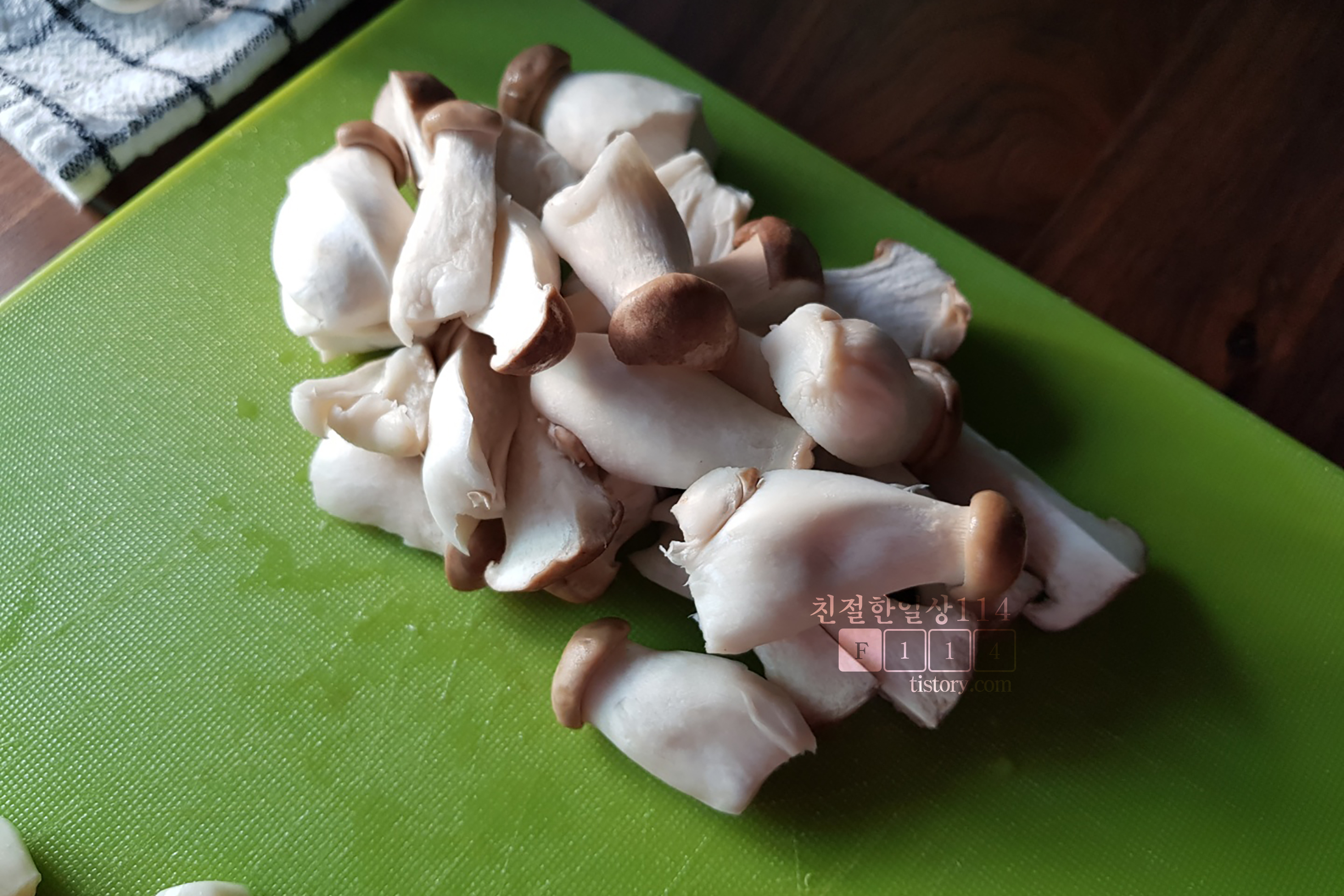 새송이버섯은 구매할때 되도록 작은 것으로 사는 것이 좋다. 작은 크기의 새송이버섯은 밑부분만 잘라내고 바로 요리해도 된다. 이번에는 크고 못생긴것밖에 없어서 어쩔 수 없이 데려와 잘 씻겨서 먹기 좋은 크기로 잘라준다.