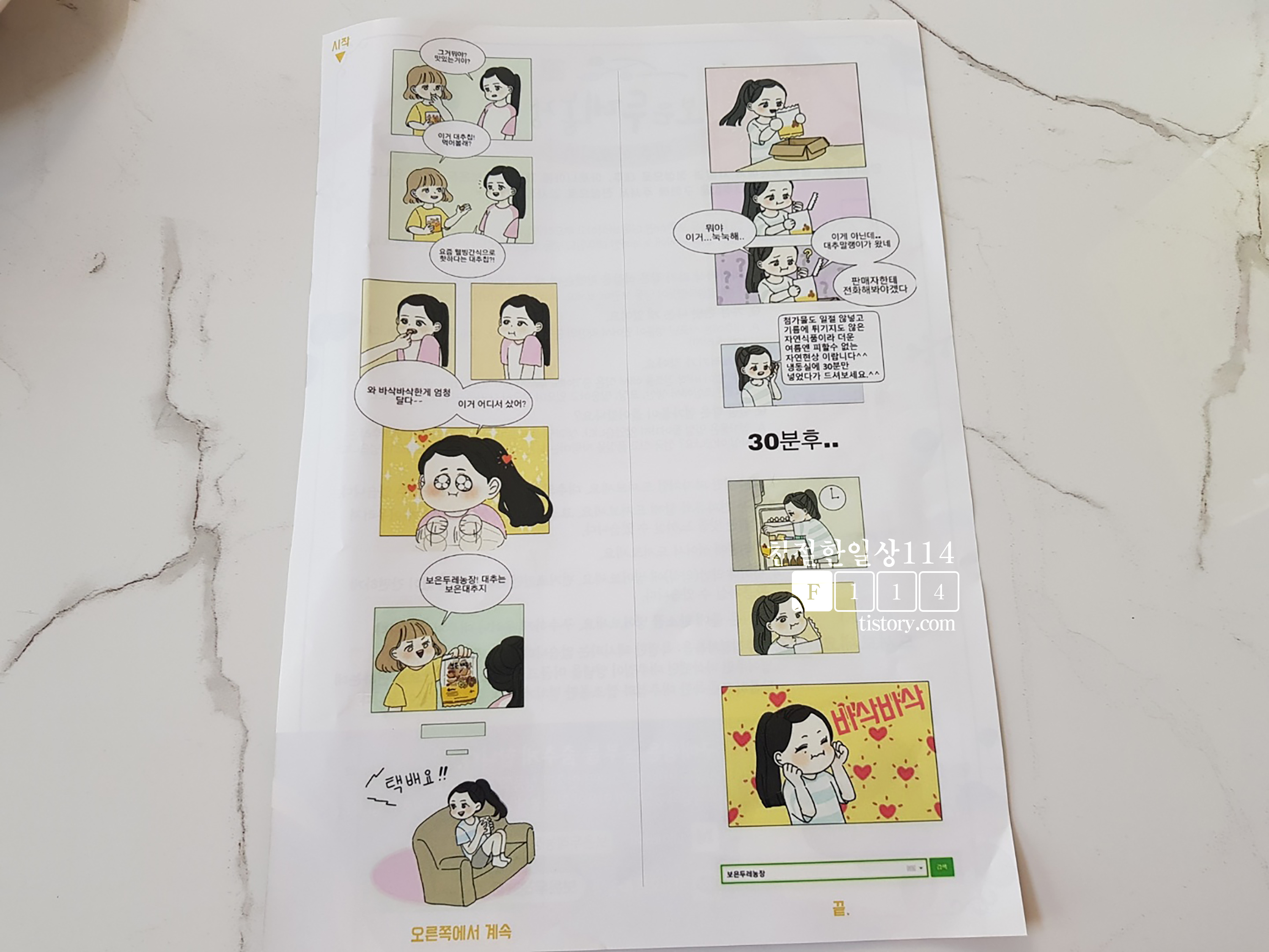 들어있는 종이에는 보은두레농장에 대한 간단한 소개와 대추칩 보관방법, 제품의 대한 Q&A 그리고 다양하게 먹는 방법이 소개되어 있다. 뒷장에는 여름에 눅눅해 질 수 밖에 없는 이유와 바삭하게 먹을 수 있는 방법을 재밌게 만화로 설명해 놓았다.