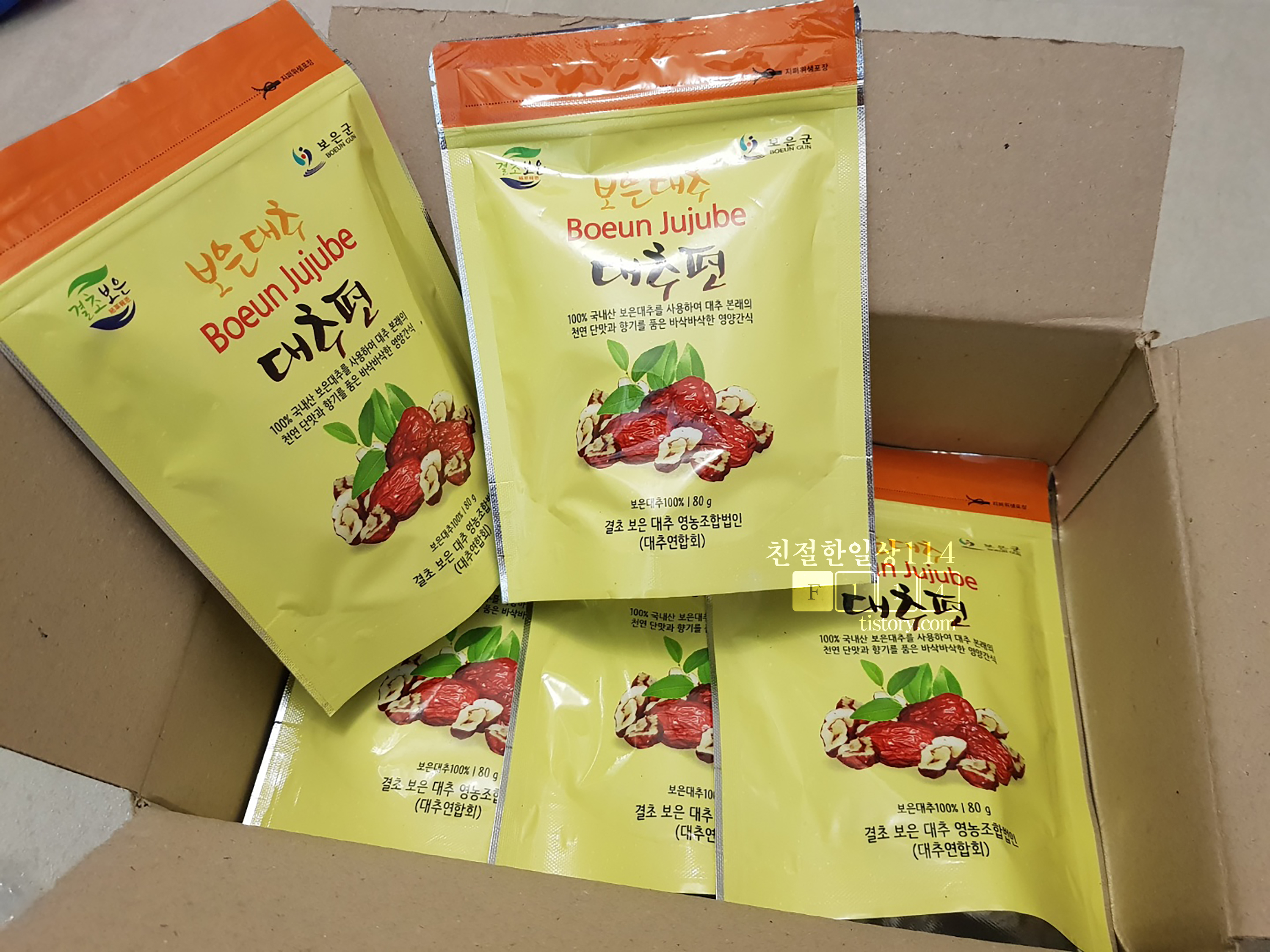 한날 외출 후 집으로 들어오는데 문앞에 택배하나가 있다. 택배 올게 없는데 잘 못 왔나 싶어서 주문인을 자세히 보니 어머니께서 보내신 택배였다. 상자에 대추라고 쓰여있어서 아이와 같이 먹으라고 생대추를 보내셨구나 싶었다. 초콜릿과 젤리, 사탕, 아이스크림 같이 달달한 걸 좋아하는 아이인데 신기하게도 대추를 그렇게 맛있게 잘 먹어서 매년 가을이 되면 어머니께서 대추를 사서 보내주신다. 대추나는 철이 아닌데 보내셔서 이상하다 싶어 열어보니 생대추가 아닌 봉투에 들은 말린 대추다. 봉지를 꺼내서 열어 맛을 보니 대추의 달근한 맛과 바사삭한 식감이 조화롭다. 바삭한 과자 같다. 먹어보고 맛있어서 바로 아내와 아이에게도 줘보니 다들 맛있다고 한다. 어머니께 전화를 걸어 잘 받았다고 말씀드리고서 아이와 같이 먹으며 맛있는 후기를 작성해 본다.