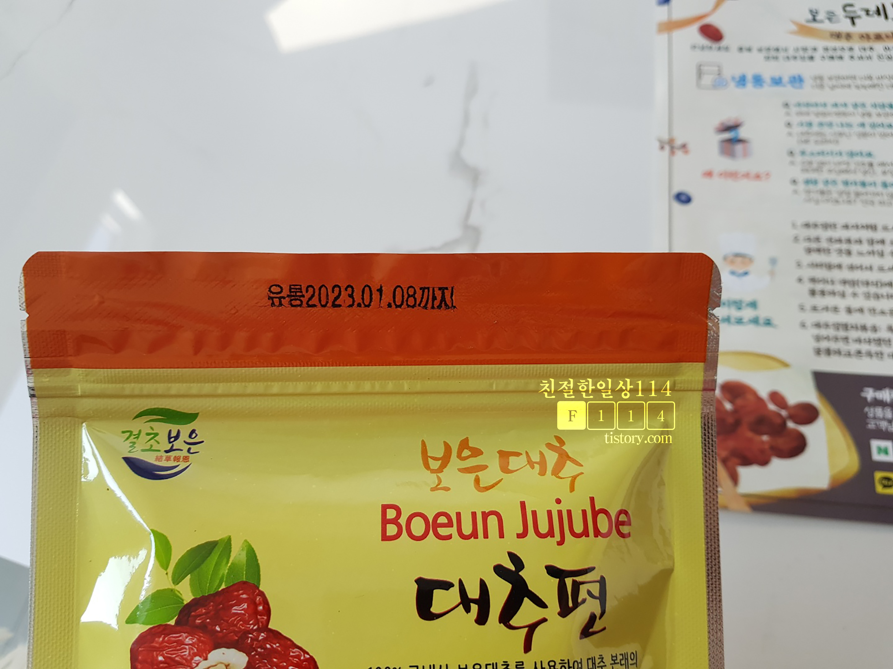 포장용 봉투 뒤에 보관방법이 나와있다. 실온보관하면 되고 개봉 후에는 밀봉하여 냉장 또는 냉동 보관하라고 되어있다. 그리고 대추씨가 간혹 있을 수 있으니 주의 하란다. 한봉을 먹는 도중 3~4번 정도 딱딱한 씨를 씹은것 같다. 방심하다가 세게 씹을때 씨가 걸리면 턱과 이가 상당히 아플것이다. 맛있게 먹다가 한번씩 이러니 참 불편하다.