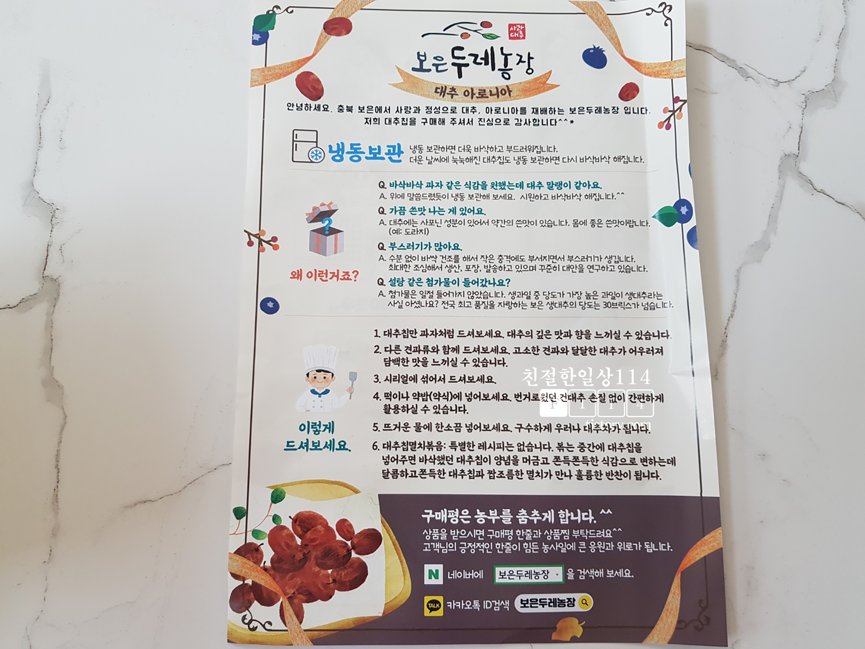 상자를 열어보니 해당 제품을 만들어 보내온 농장의 이름이 프린트된 종이가 보인다. 읽어보니 '보은두레농장' 보은두레농장에서는 대추와 아로니아를 전문적으로 재배하는 농장이다.