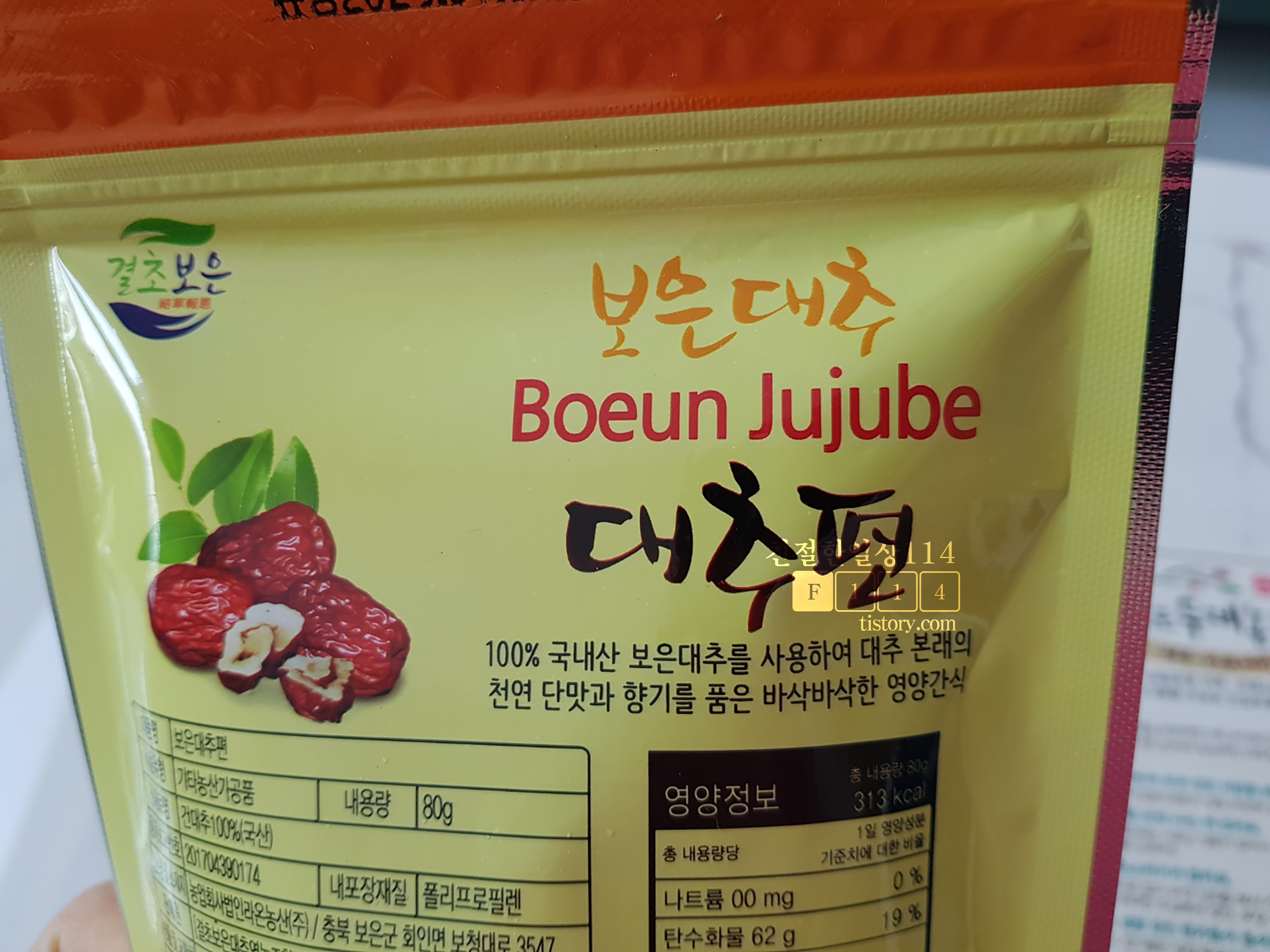 포장용 봉투 뒤에 보관방법이 나와있다. 실온보관하면 되고 개봉 후에는 밀봉하여 냉장 또는 냉동 보관하라고 되어있다. 그리고 대추씨가 간혹 있을 수 있으니 주의 하란다. 한봉을 먹는 도중 3~4번 정도 딱딱한 씨를 씹은것 같다. 방심하다가 세게 씹을때 씨가 걸리면 턱과 이가 상당히 아플것이다. 맛있게 먹다가 한번씩 이러니 참 불편하다.