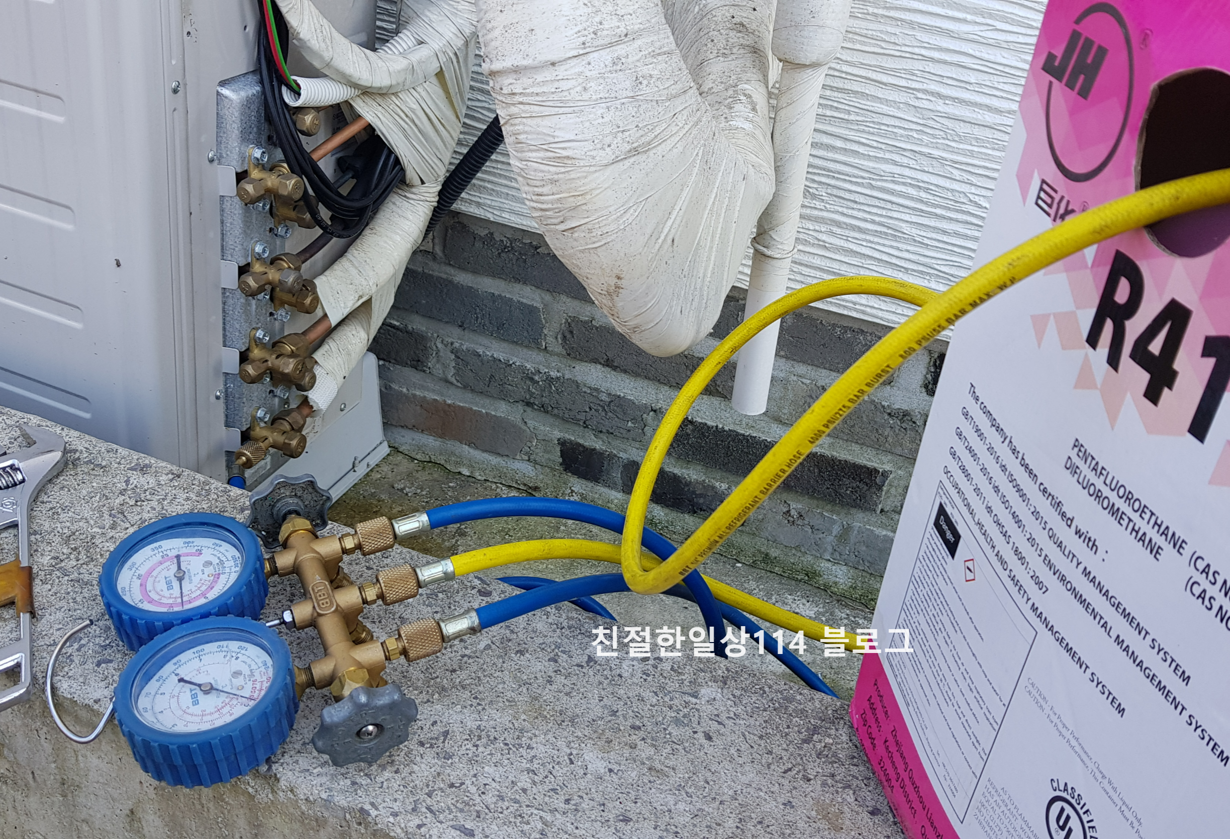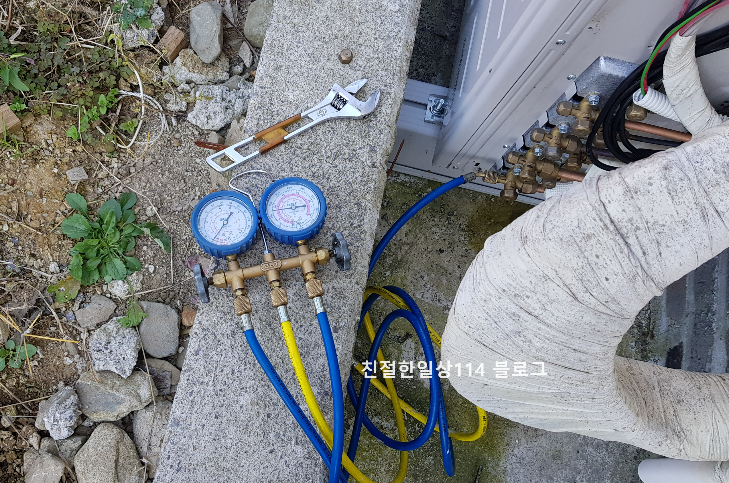 그리고 과충전된 냉매를 배출해 적정하게 맞춰놓고 다른 고장은 없는지도 체크해 주었다. 다른 이상은 없었으며 수리를 완료하고 간단한 에어컨 사용방법과 관리법에 대해서 설명해주었다.