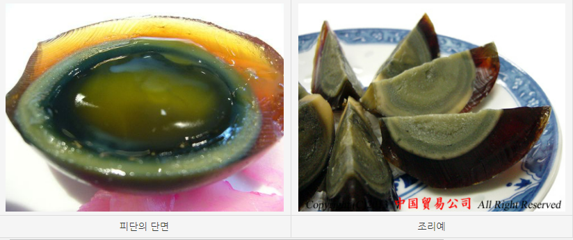 사진으로 보니 예전 중국 여행갔을때 현지식당에서 피단 요리가 나왔던 것이 생각난다. 계란으로 했는지 오리알로 했는지는 모르겠지만 흰자위가 상당히 탱글한 식감과 노른자의 고소한 맛이 강하게 났던 기억이 난다.