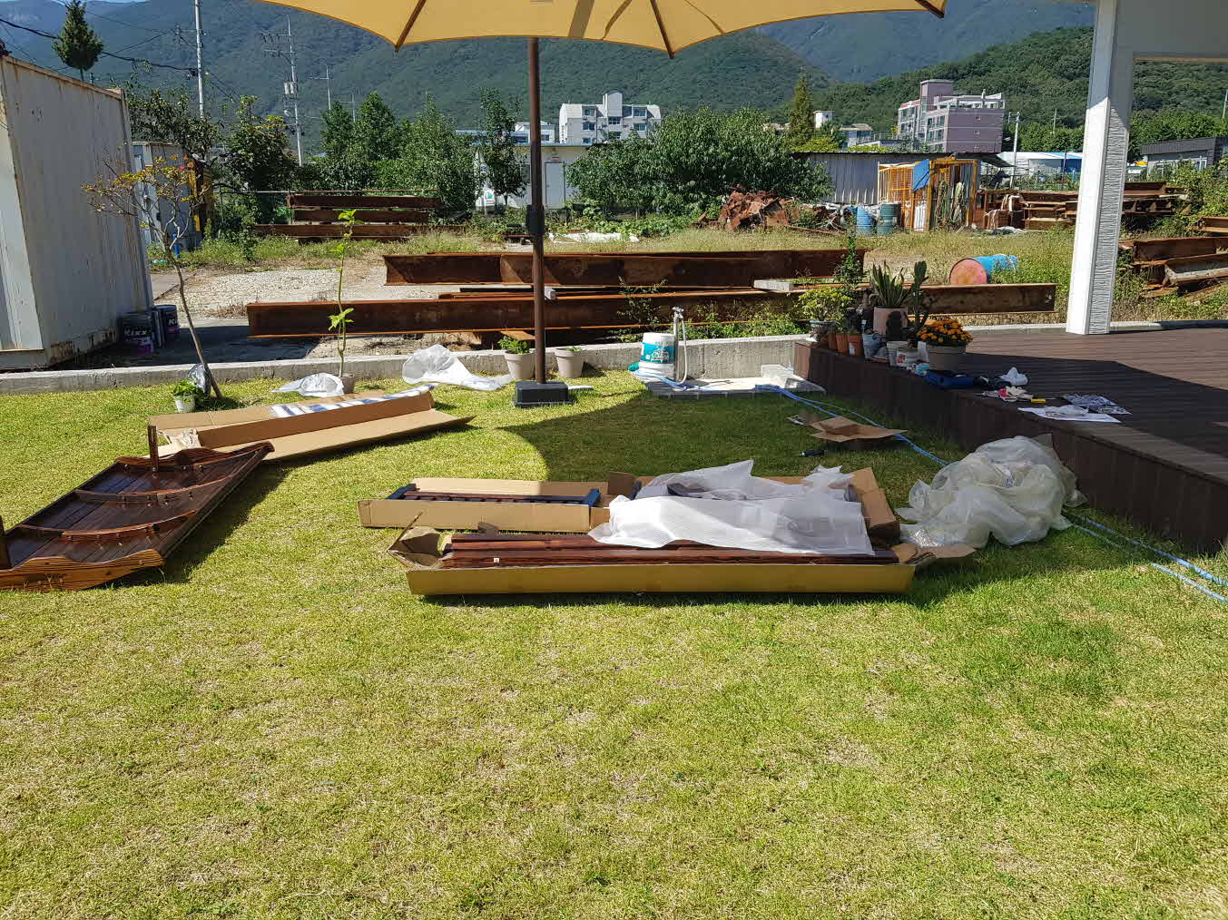 그리고 마당에 먼저 설치한 커피색상의 데크와 아카시아 원목의 야외 테이블과도 잘 어울릴 수 있도록 나무 재질로 좁혀 들어간다.