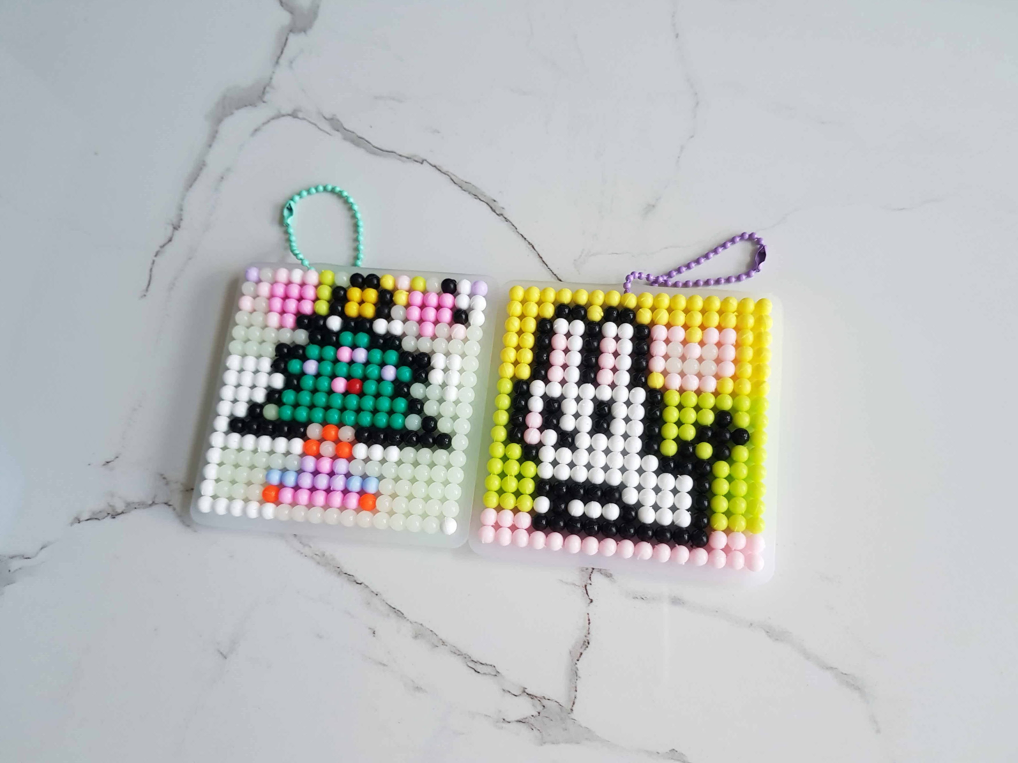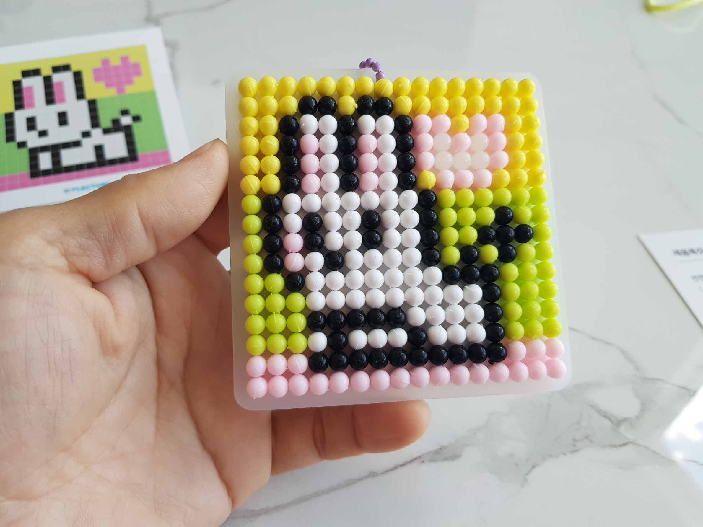 완성한 블록은 위 사진과 같이 고리를 걸어서 가방에 걸고 다닐 수도 있고 집안에 장식용으로 걸수도 있다. 오른쪽의 토끼는 집에서 완성한 블록이고 왼쪽의 크리스마스트리는 축제 체험장에서 배경만 빼고 조립한걸 집에와서 나머지 배경을 야광으로 조립했다. 야광은 조금 더 비싸지만 어두울때 보면 은은하게 보여 방에 걸어두기에 좋다.