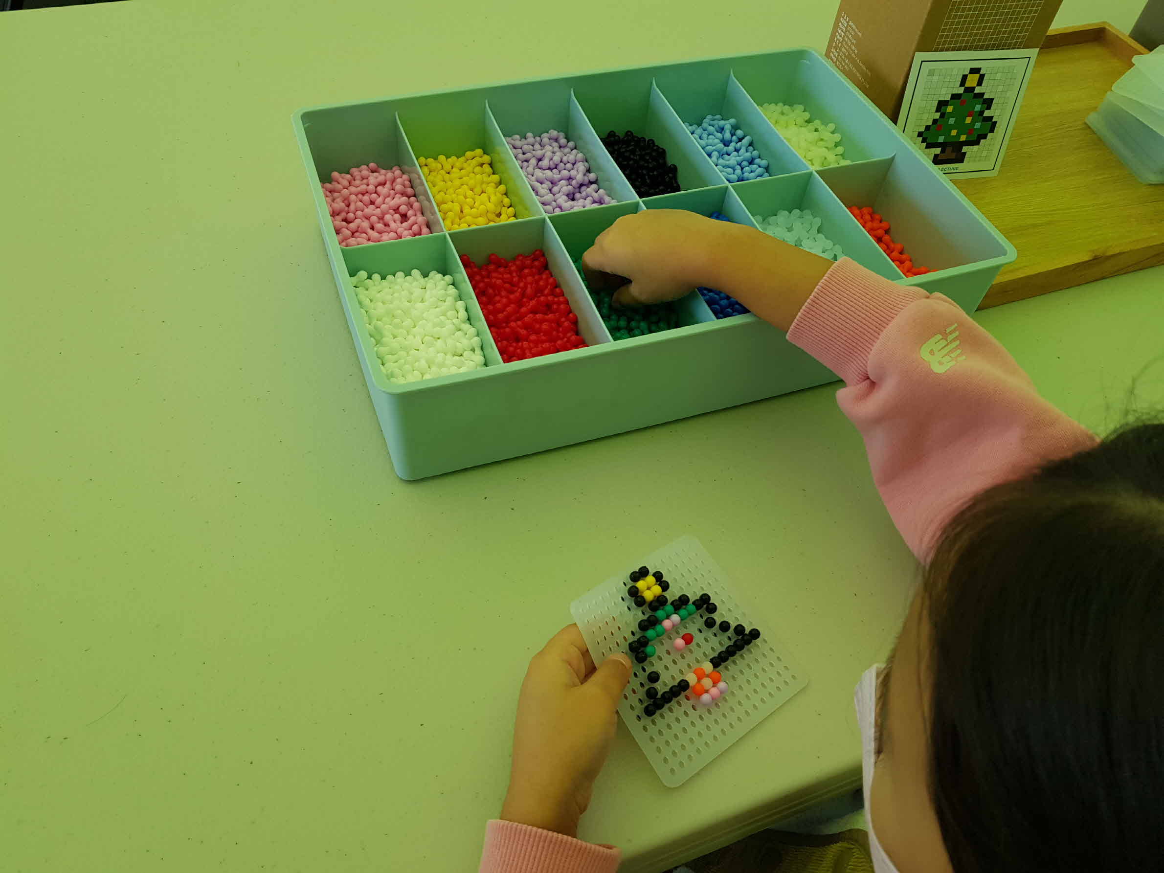 딸아이가 하고 싶다고해서 어떤걸 할까 고르면서 기존 플라스틱 블록과는 다른 블록인걸 알게 되었다. 여러 도안중에서 크리스마스트리로 선택하고는 자리에 앉아서 하는 방법을 듣는다.