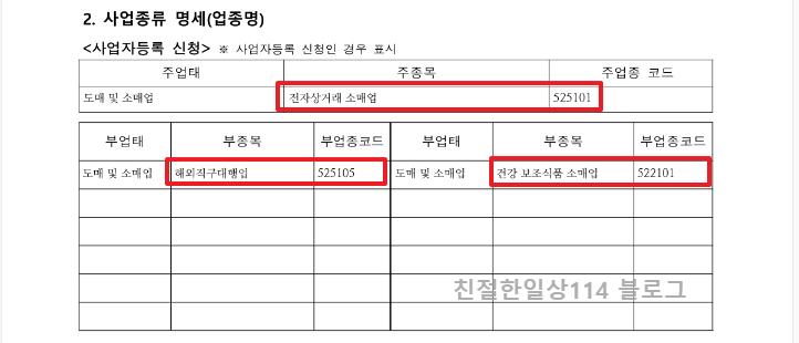 필자는 여기에 해외 물건을 판매할 수 있는 가능성을 열어 두고자 해외직구대행업 업종코드(525105)도 추가해서 3가지 업종코드를 넣고 신청을 했다.