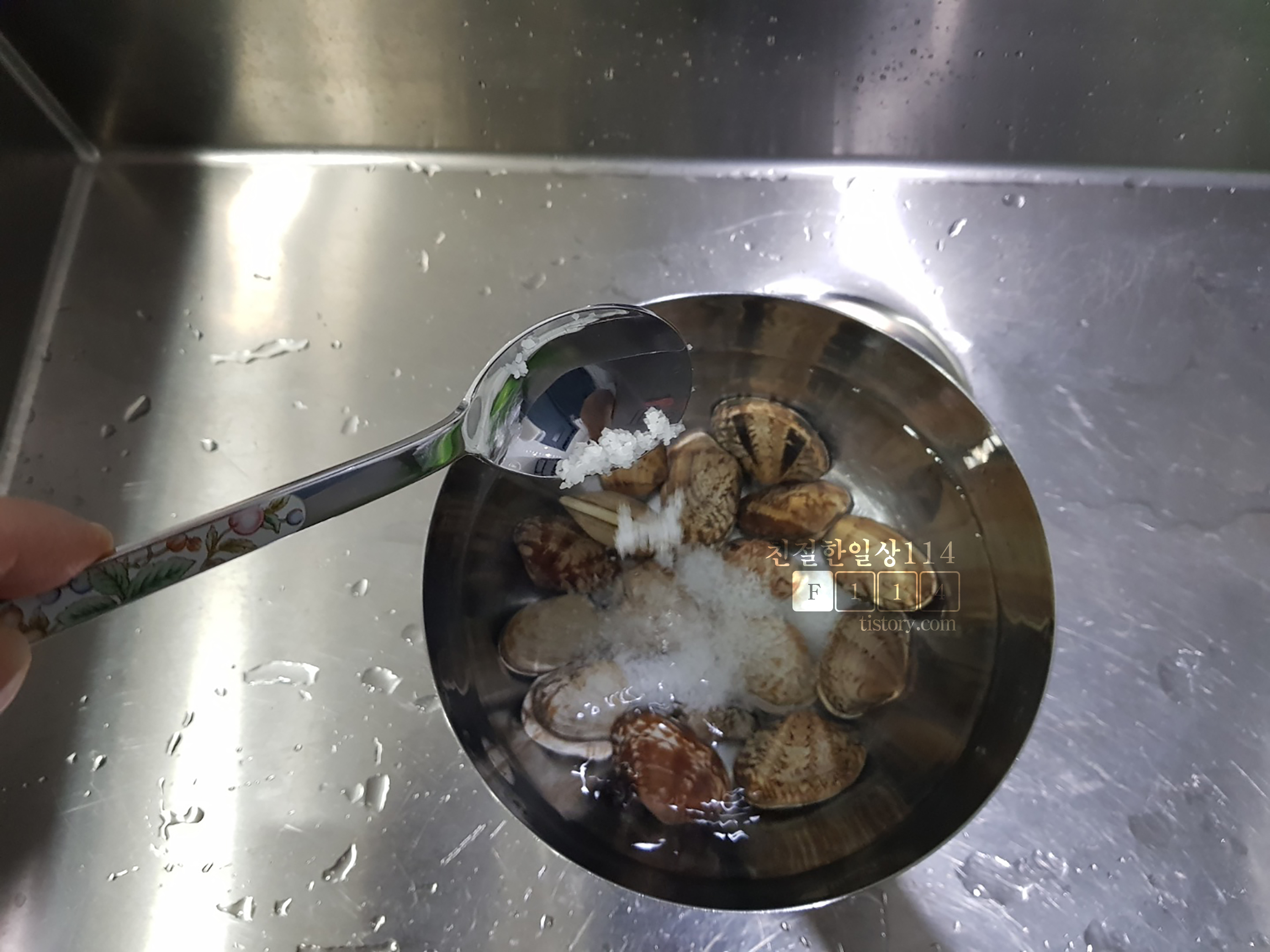 세척한 바지락을 물에 담그고 소금을 조개 양에 따라 1스푼~2스푼 넣는다.