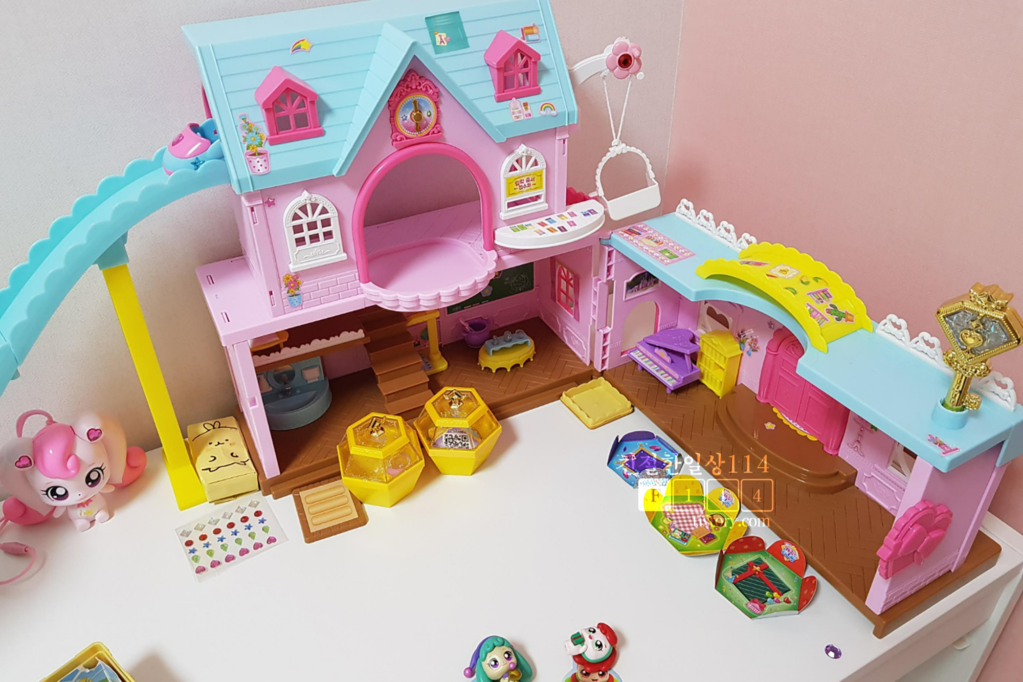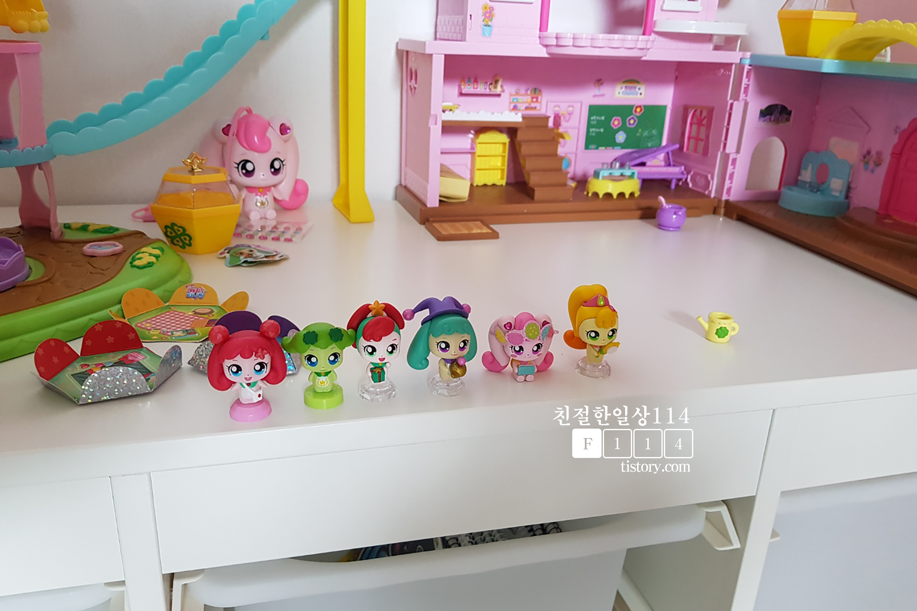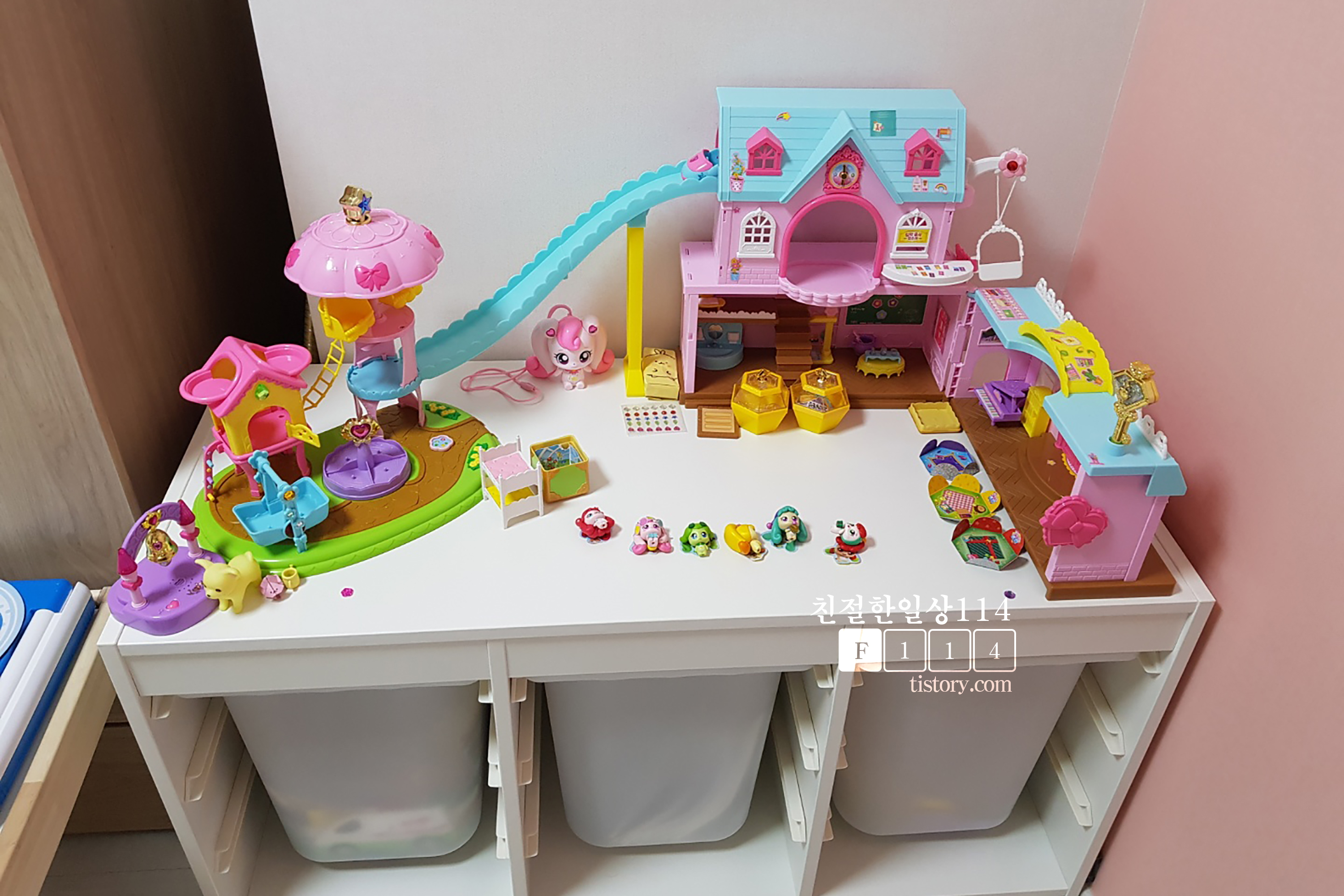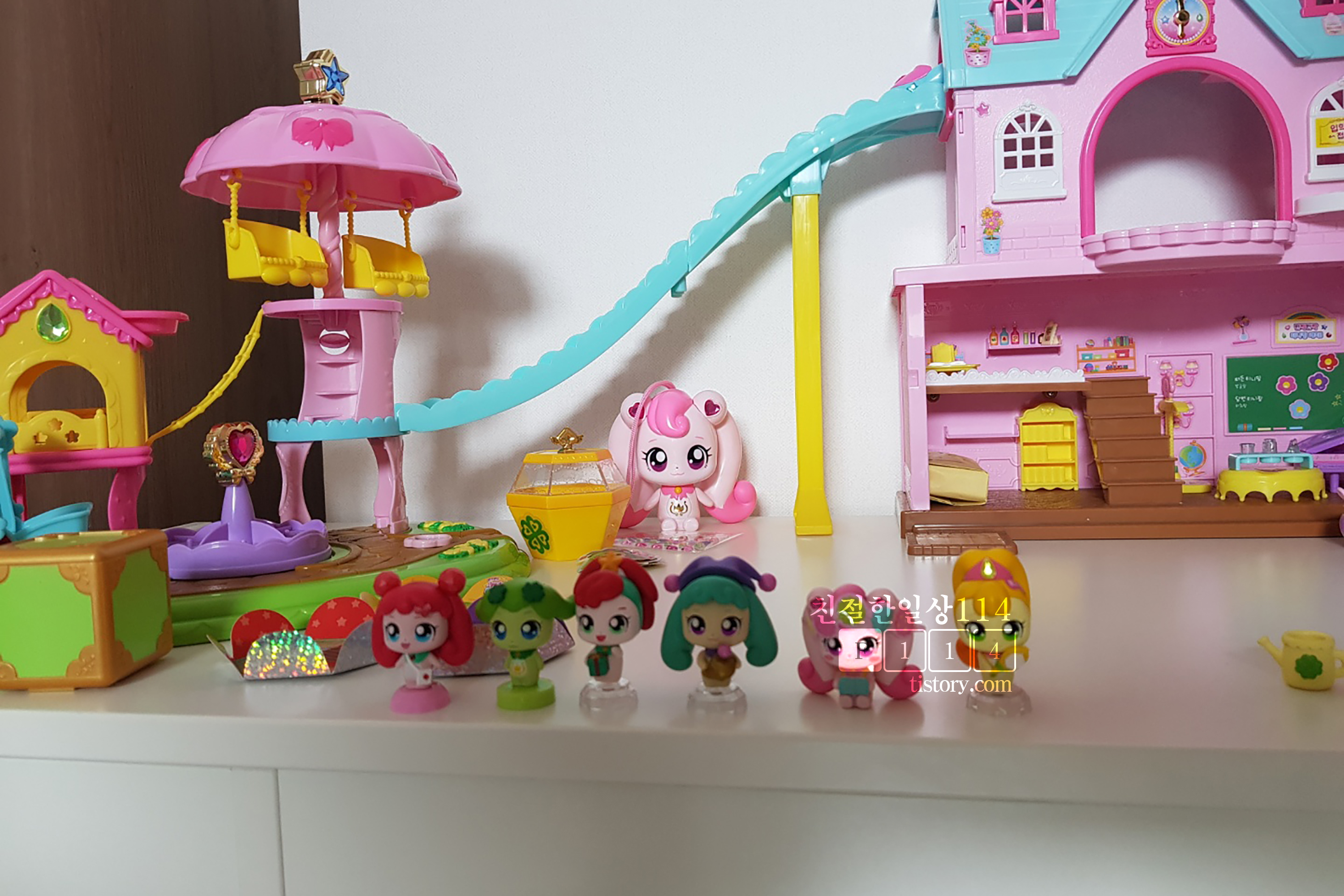 그리고 덩치가 크고 가격도 그만큼 비싼 티니핑 스쿨이나 티니핑 놀이터, 하우스 같은 장난감이 있다. 이 장난감은 서로 연결하고 호환해서 가지고 놀 수 있도록 만들어 졌다. 먼저 티니핑 스쿨이 집에 있었는데 딸아이는 스쿨에 놀이터가 호환이 되는 건줄 이미 알고 있었고 얼마전 삼촌과 마트에 가서 놀이터를 골라서 가지고 왔다.