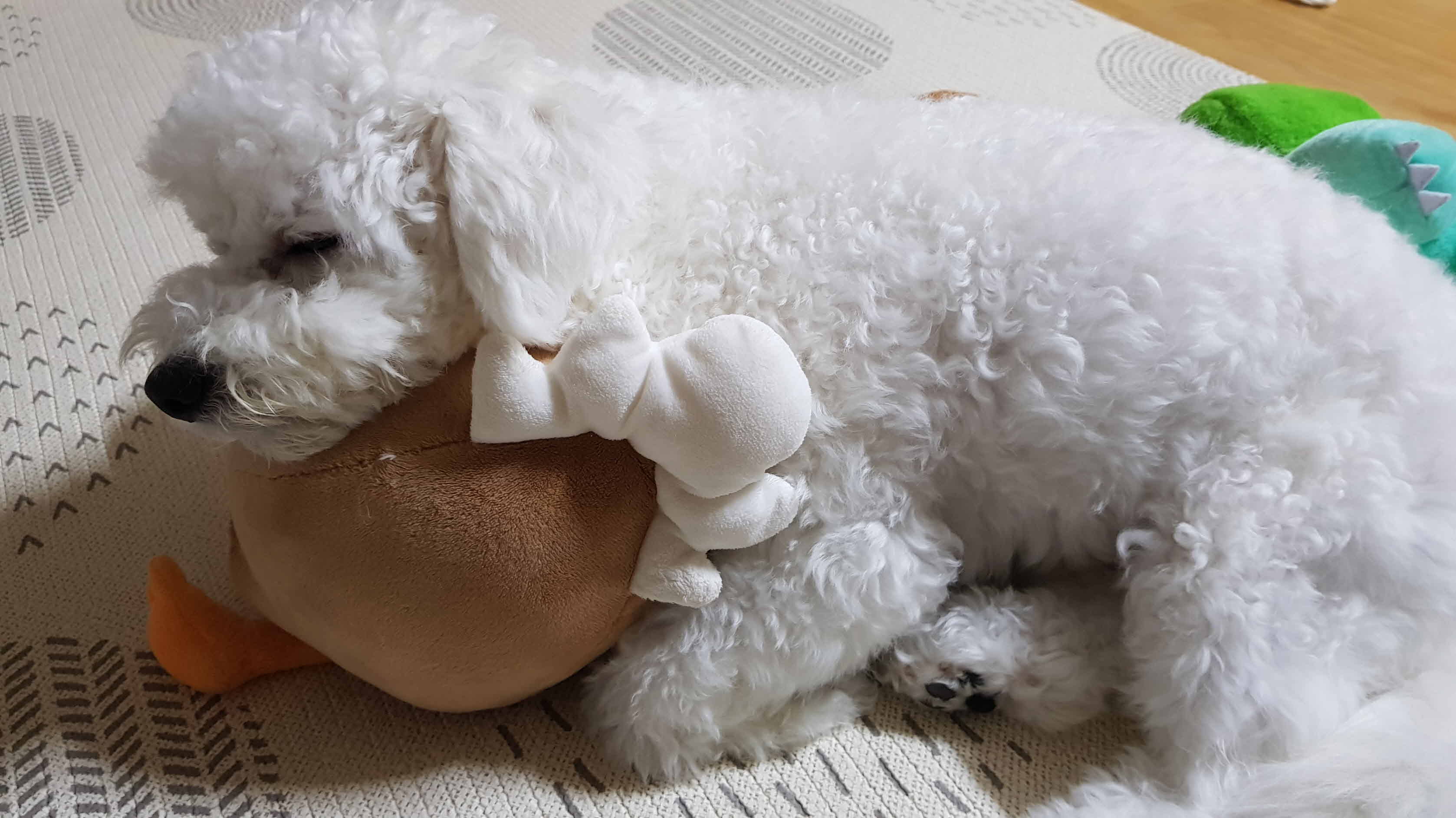 이렇게 사람을 좋아해서 매번 옆에 붙어 있는 녀석이 눈에 안보여 찾아보면 인형을 끌어안고 자고 있다.