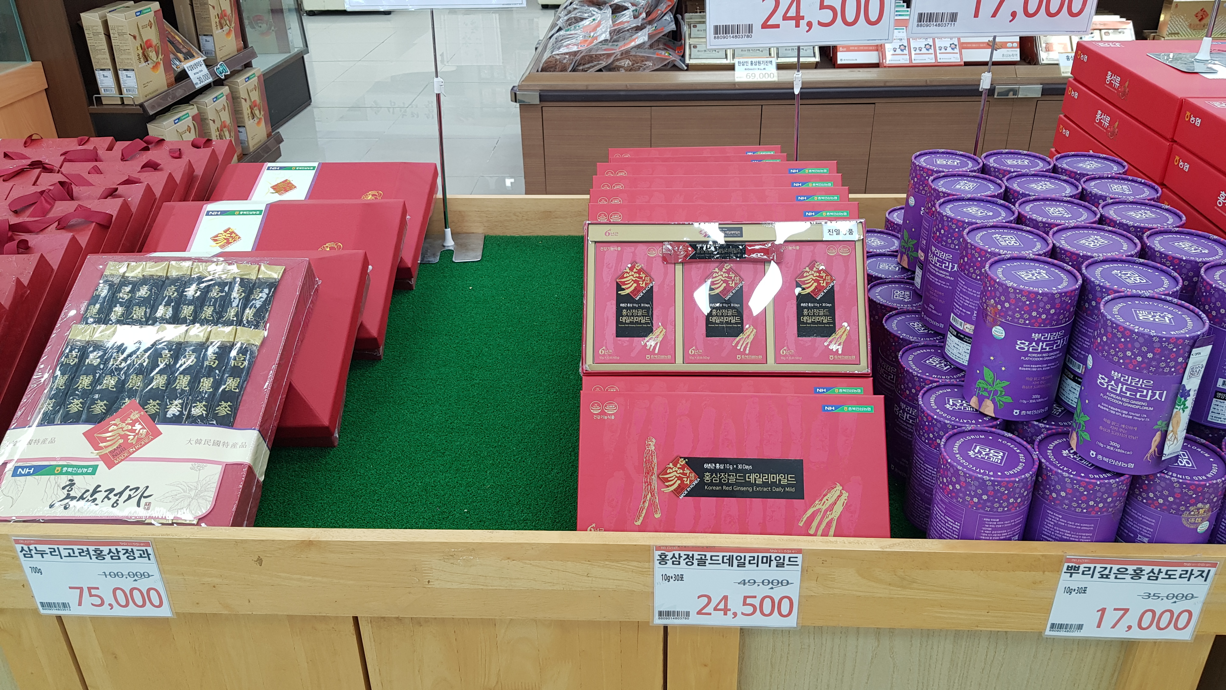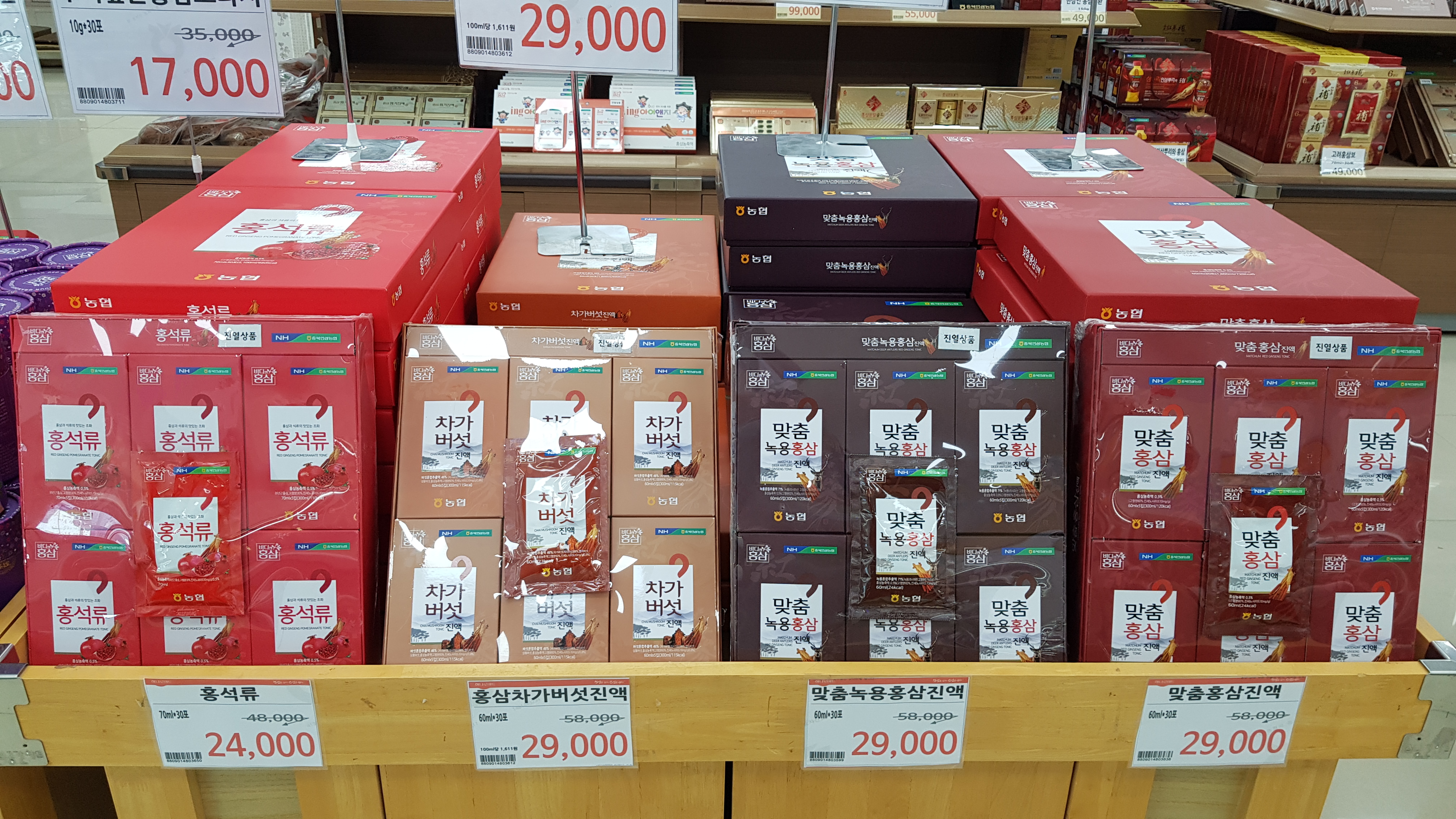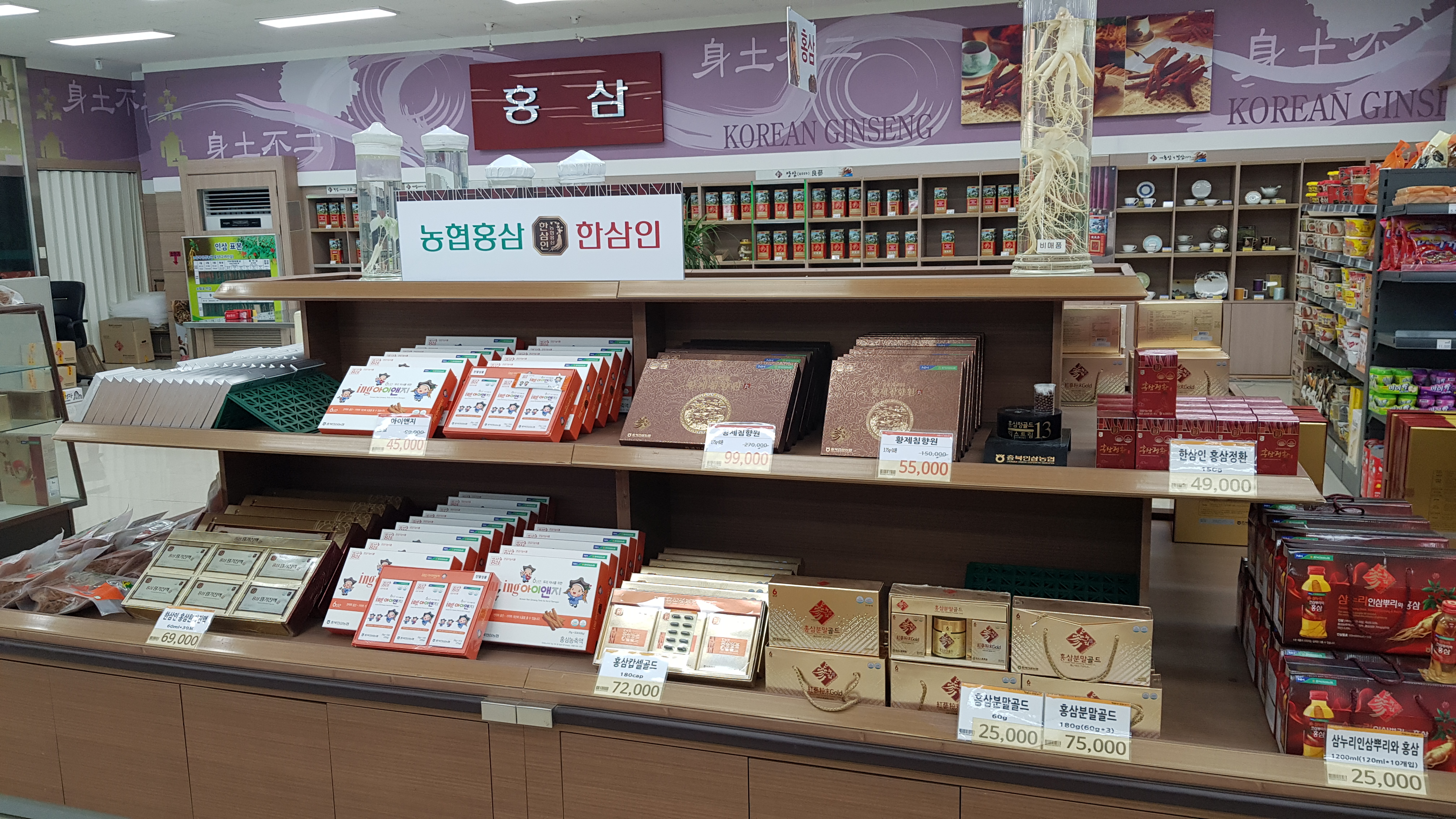 매장 내부 중앙는 가공한 제품이 진열되어있다. 인삼으로 만들 수 있는 제품 종류가 정말 많다.