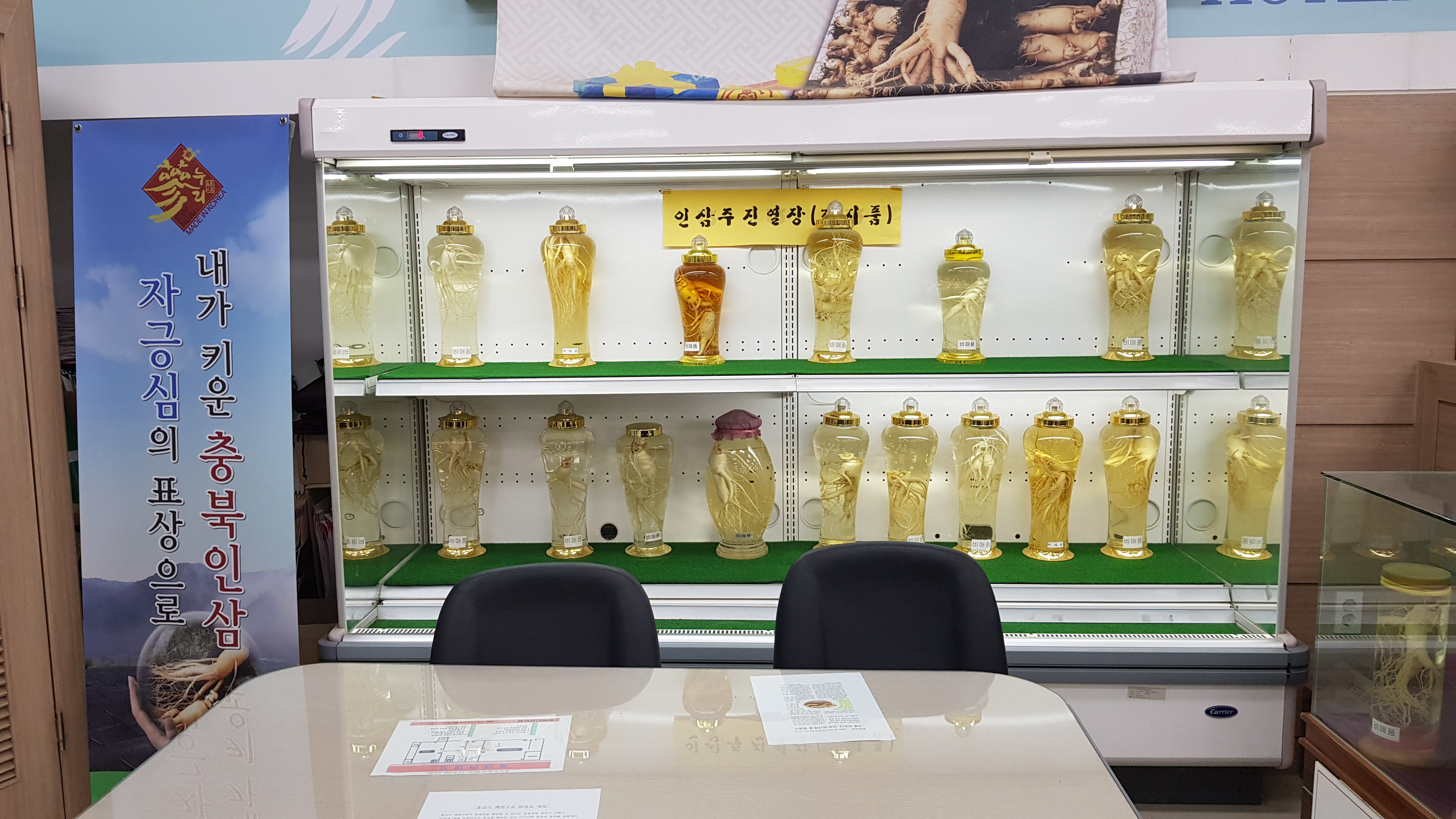 출입문과 카운터 쪽에 있는 인삼주 진열장이다. 판매되는건 아니니 눈으로만 구경해본다.