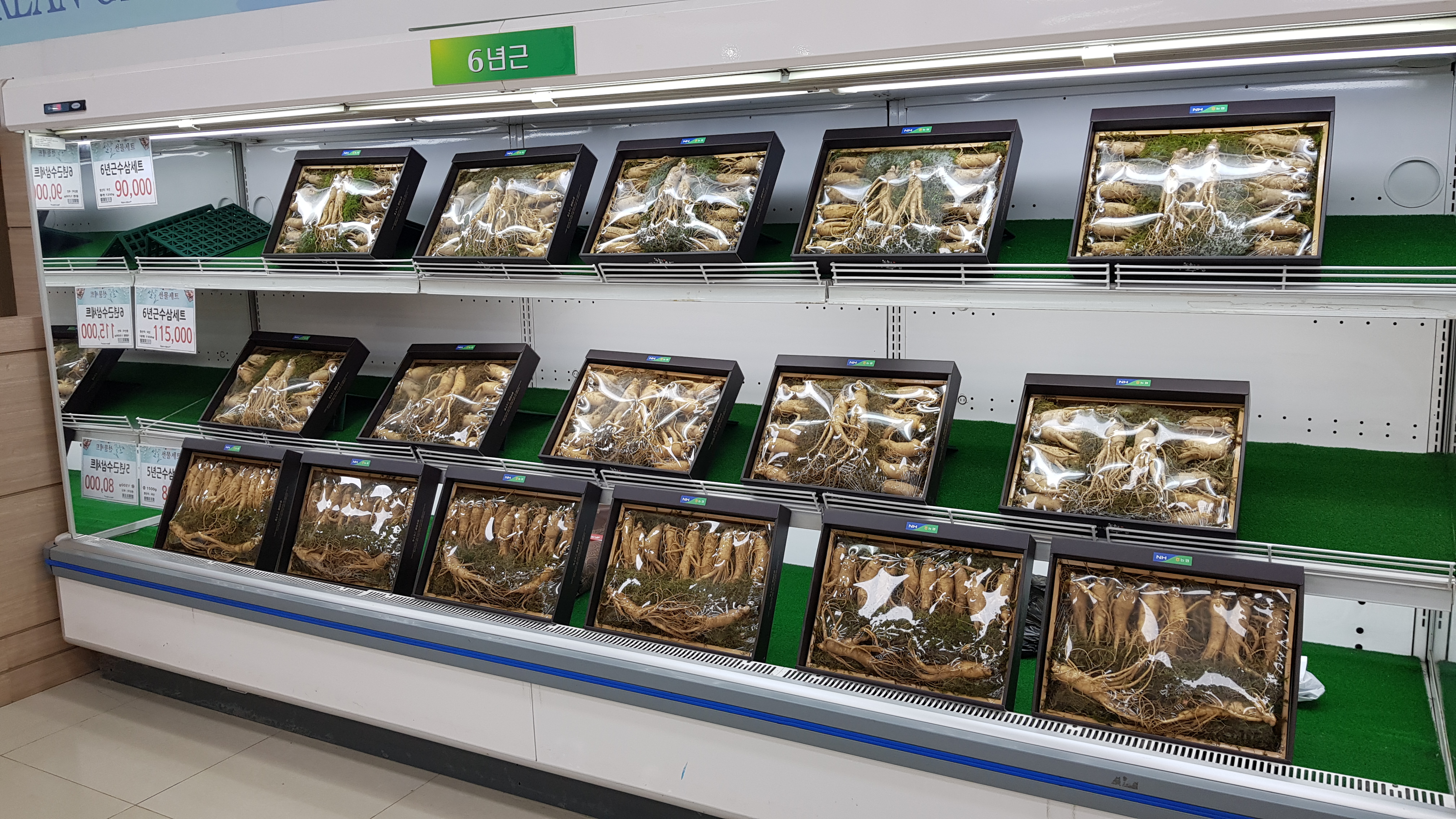 건물로 들어가면 왼쪽편에 수삼이 진열되어있고 몇년산인지와 g당 가격이 붙어있다.