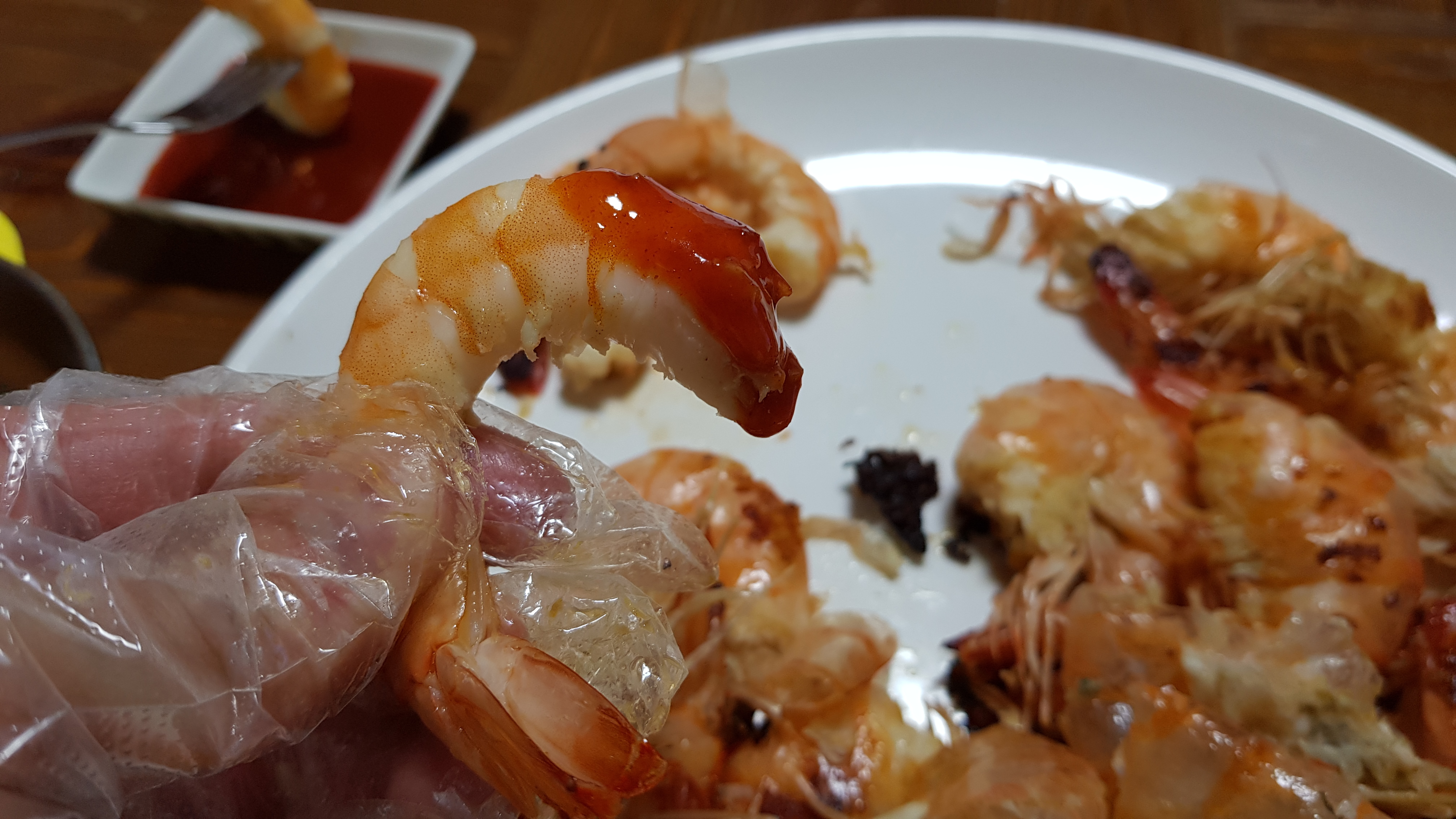 접시에 옮겨 담고 먹을 본격적으로 먹을 준비를 한다. 필자는 껍질을 까서 줘야하기 때문에 비닐 장갑을 준비한다.