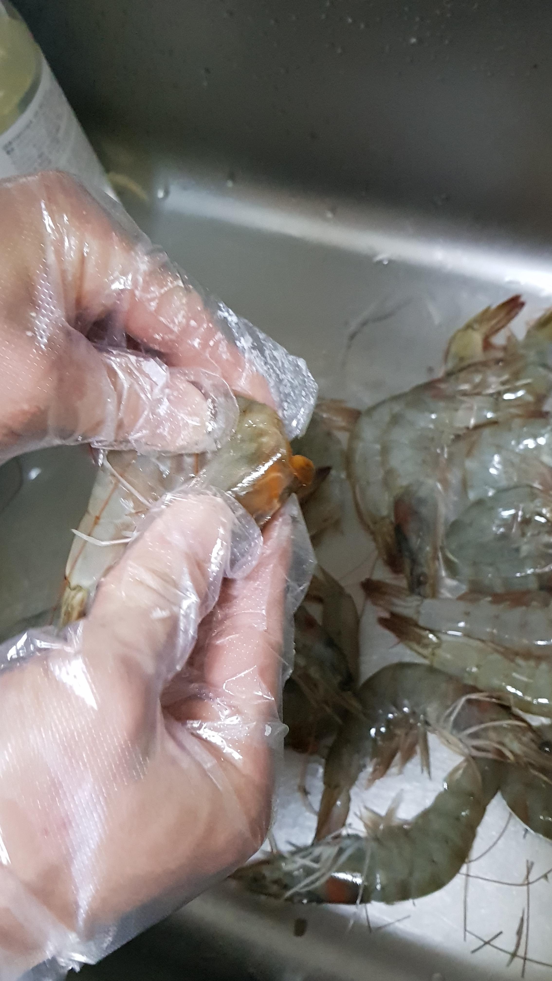 새우머리를 고개숙이듯이 아래로 꺽으면 주황색깔의 액체가 나온다. 꺽은 다음 머리를 눌러주면 깨끗하게 빼낼 수 있다.