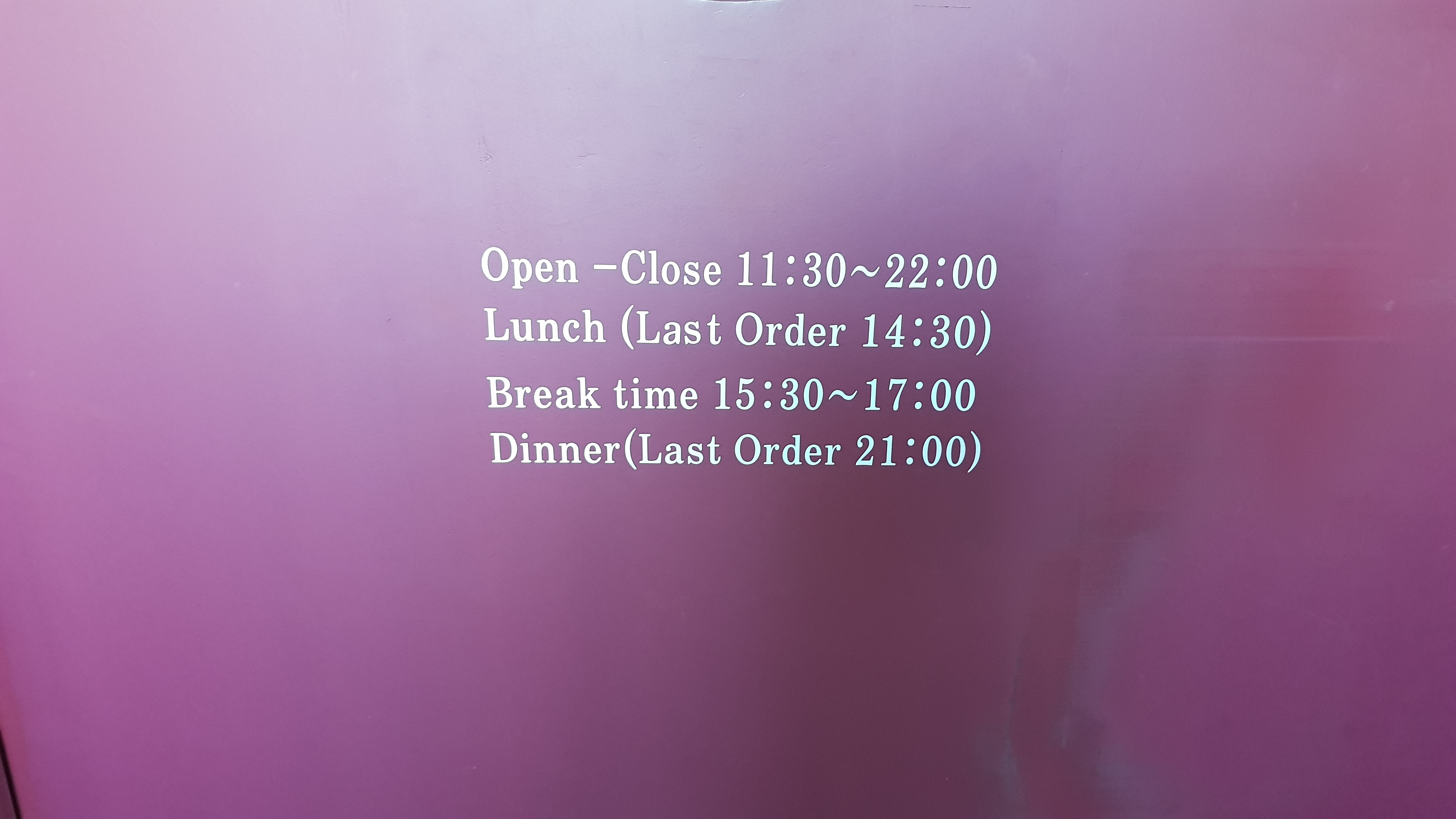 엘레베이터를 타고 올라가면 보이는 보라색 슬라이딩 도어에 영업시간이 쓰여있다. 사람이 몰리는 식사시간을 피해서 갈때는 브레이크타임에 걸려서 낭패보지 않도록 미리 확인하고 가는 센스가 필요하겠다.