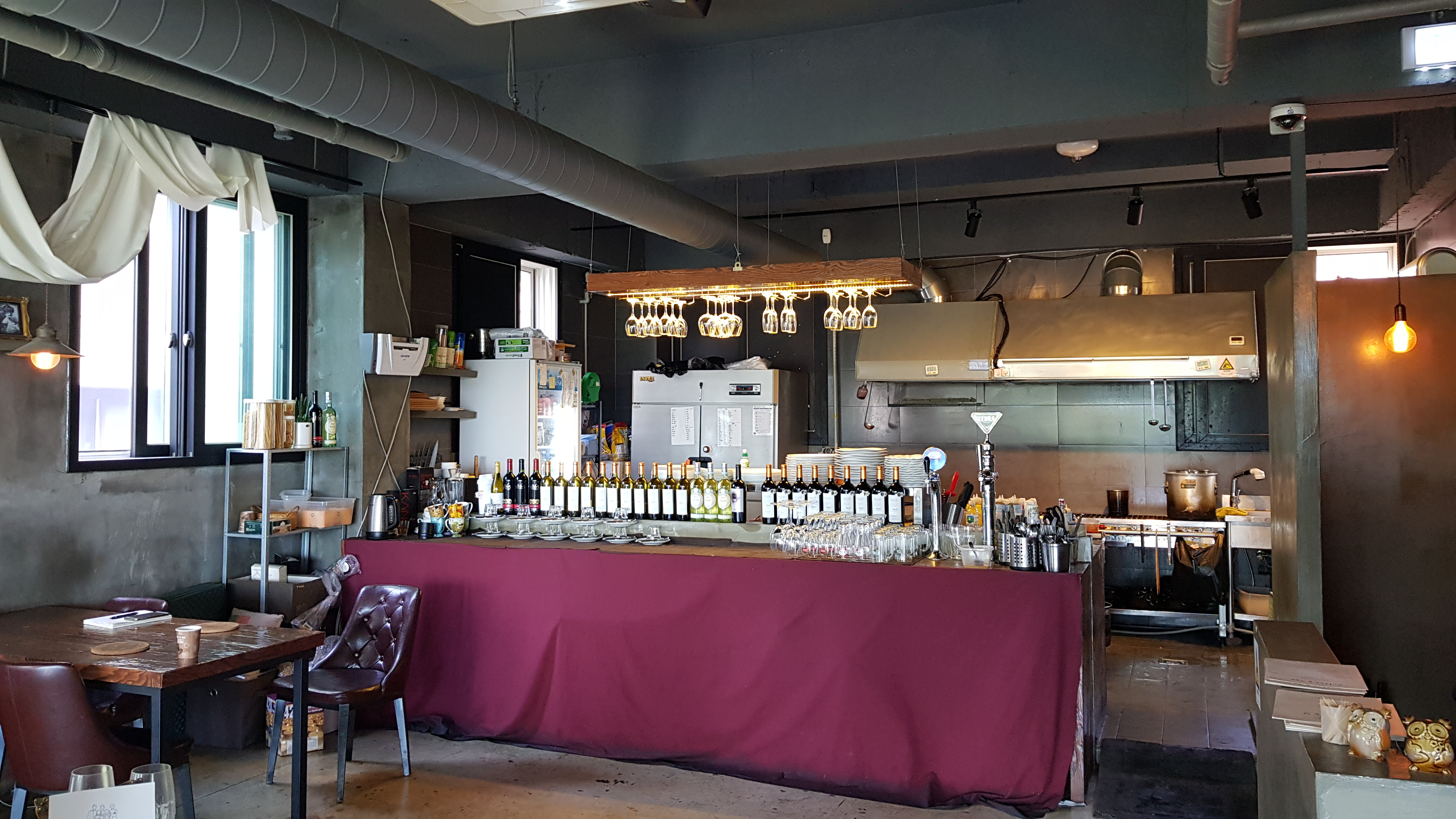 오른편으로 보이는 오픈 주방과 그 앞 테이블 위에 놓인 와인들이 어울리며 빈티지한 느낌을 준다.