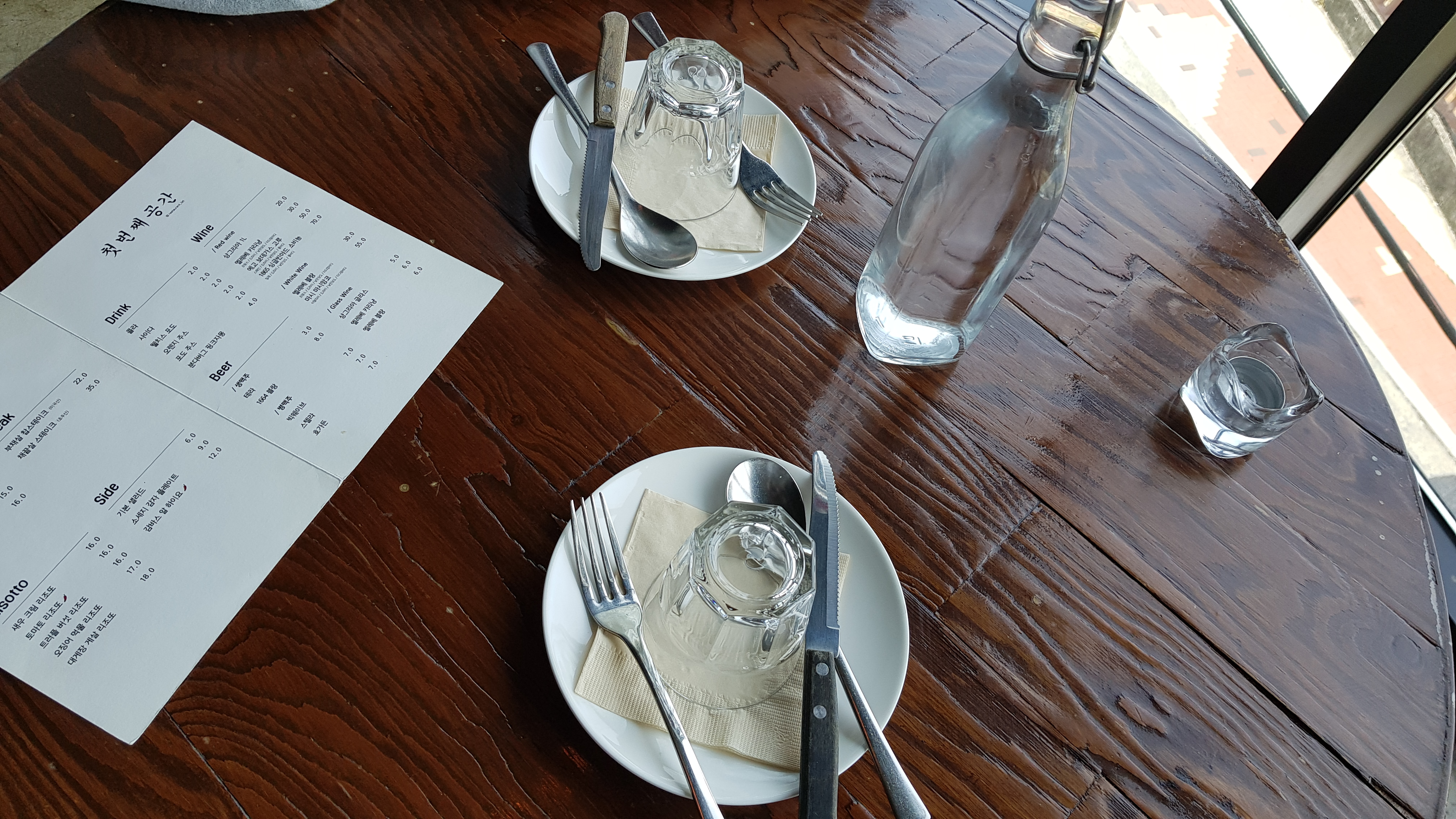 사람이 많은 시간을 피해 브레이크타임 직전에 온 보람이 있다. 창가쪽 테이블에 자리를 잡고 앉으니 메뉴판을 가져다 준다. 종류별로 한가지씩 시키고 싶지만 먹을것 앞에서 욕심부리면 안되기에 몸에 좋은 오징어 먹물 리조또와 새우 오일 파스타를 주문한다. 그리고 함께 곁들일 생맥주와 샹그리아 한잔을 같이 주문한다.