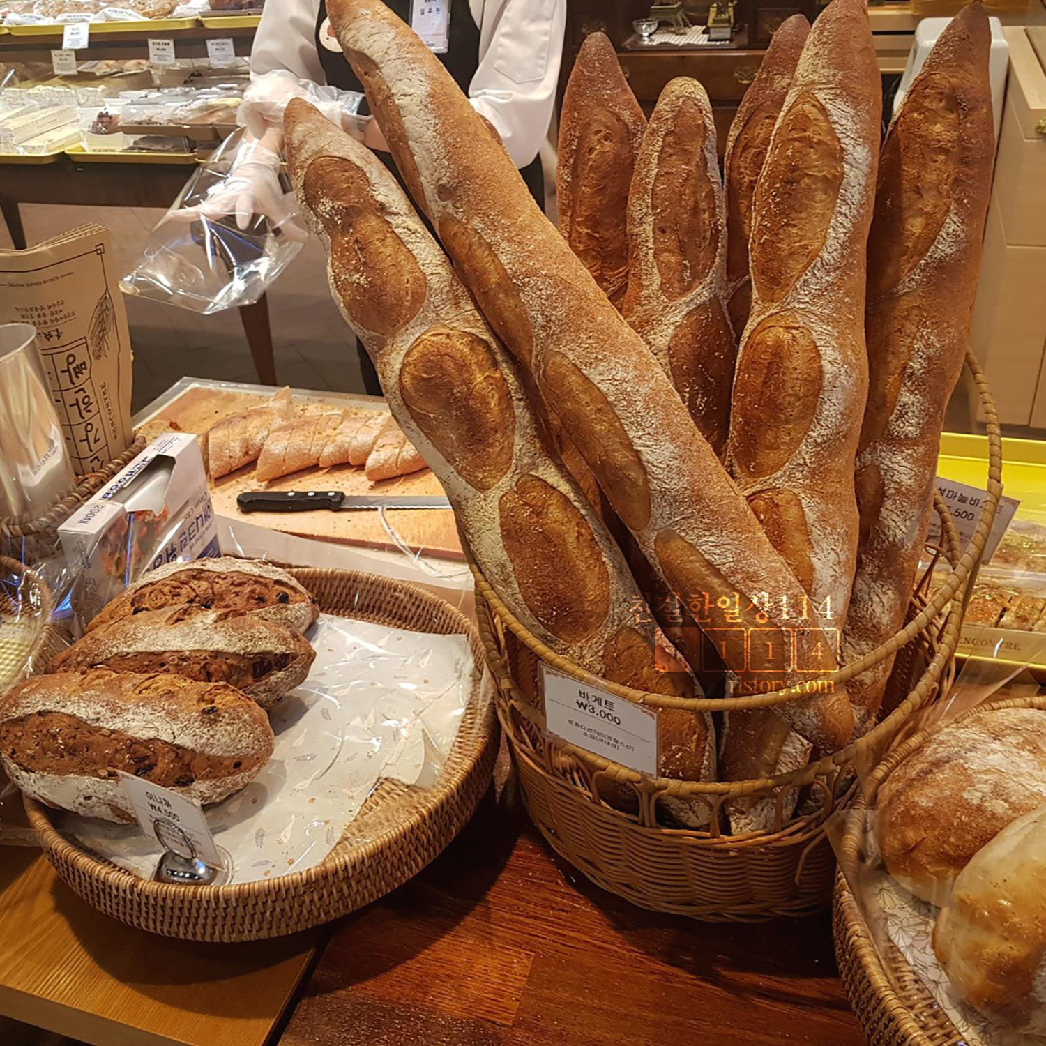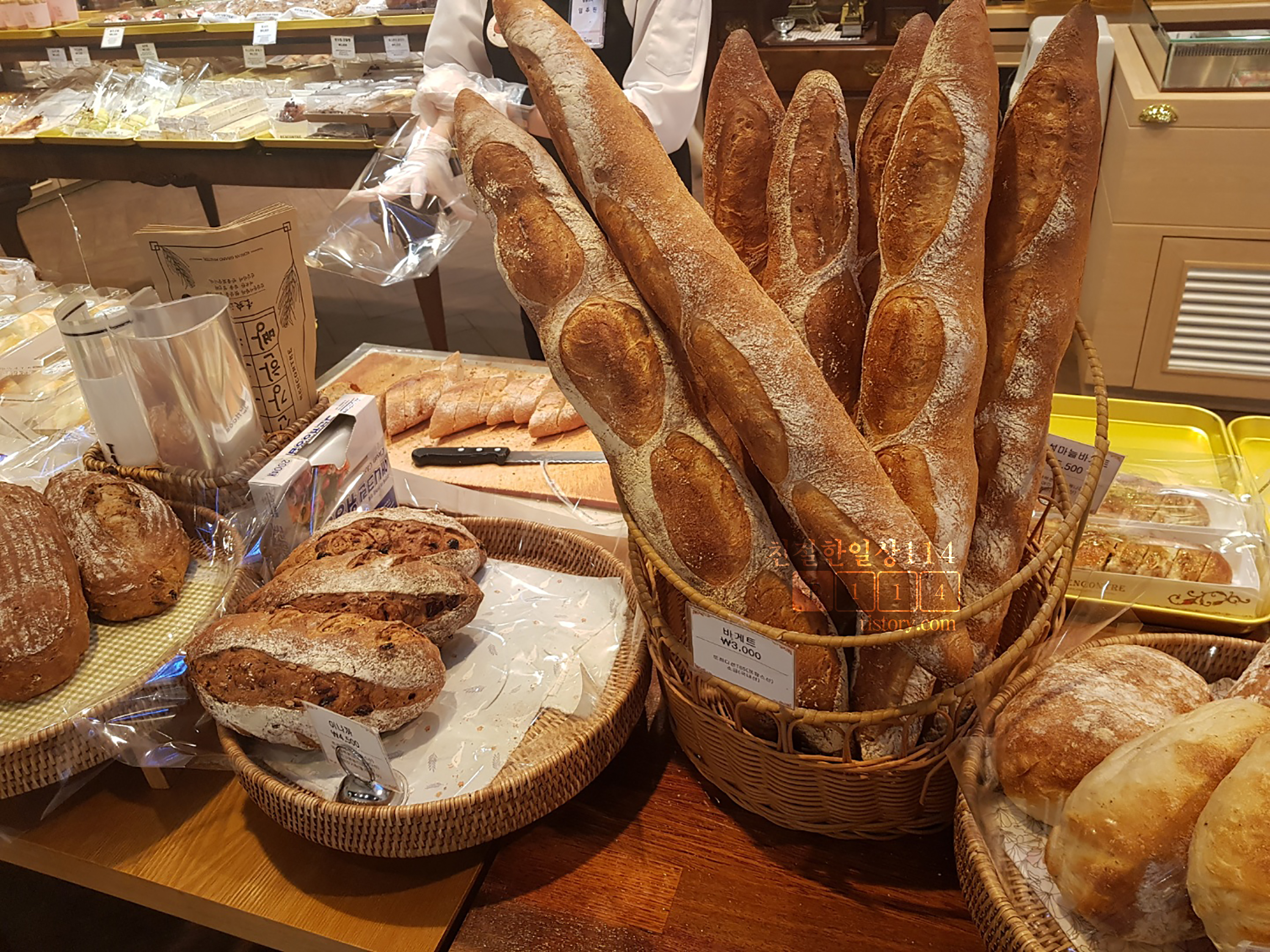 주문한 바게트를 직원이 커팅해주고 있다. 해월당에서는 기계로 커팅을 해주는데 랑콩뜨레는 빵칼로 직접 잘라준다. 그래서 크기가 불규칙하긴 하지만 맛이 변하는게 아니니 상관은 없다.