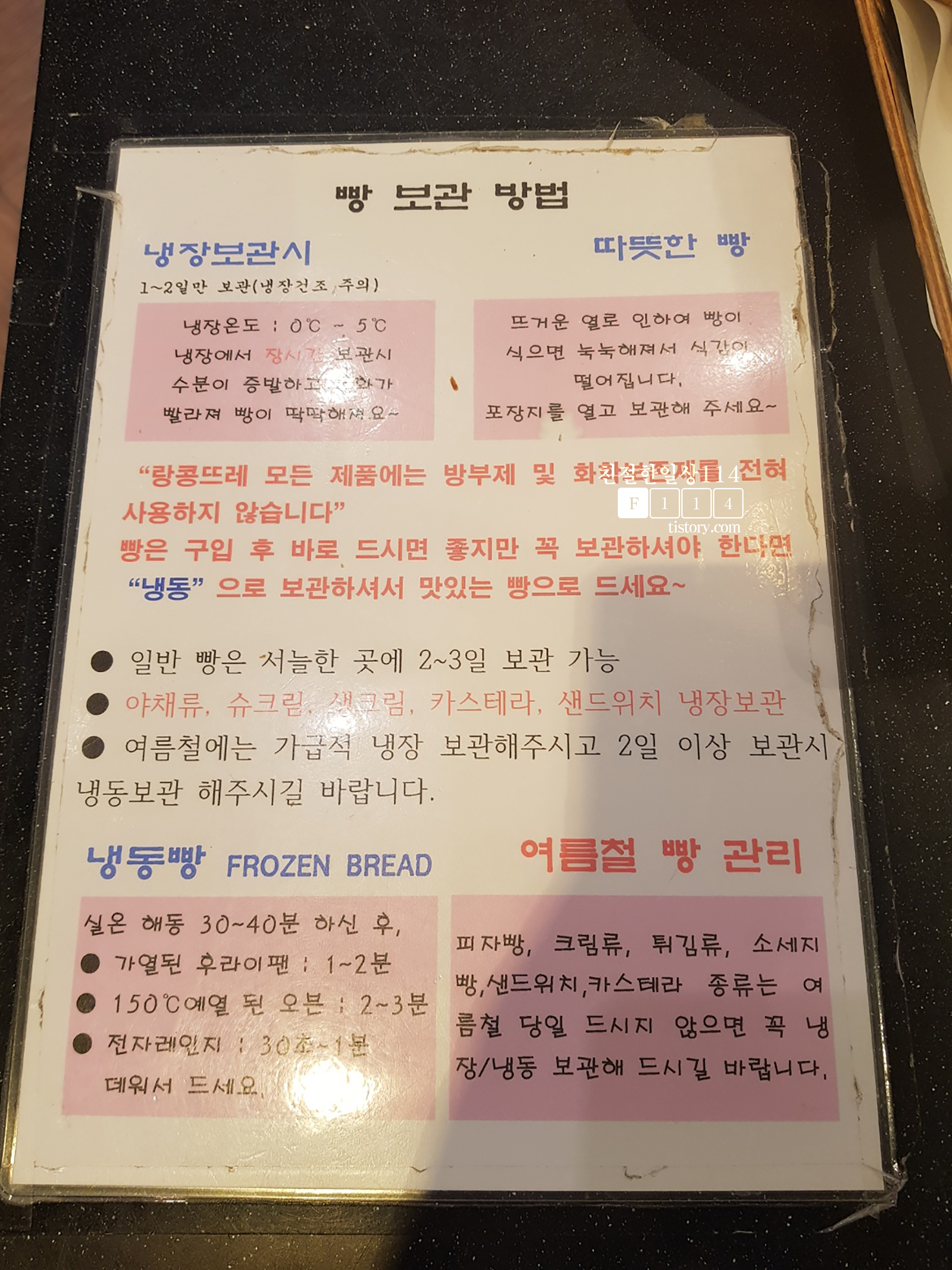 랑콩뜨레 카운터쪽에 붙어있는 빵 보관 방법을 찍어봤다. 다른 집에서는 어떻게 보관하지는 모르겠지만 대부분 필자의 경우에는 상온에 뒀다가 그때 그때 먹고 많이 굳거나 상했다 싶으면 버리기도 한다. 빵을 보관할때는 따뜻한 빵과 오래 보관해야 하는 경우를 구분해야 한다는데 아래 방법을 참고해서 보관해 먹으면 굳거나 상하지 않고 맛있게 먹을 수 있겠다.