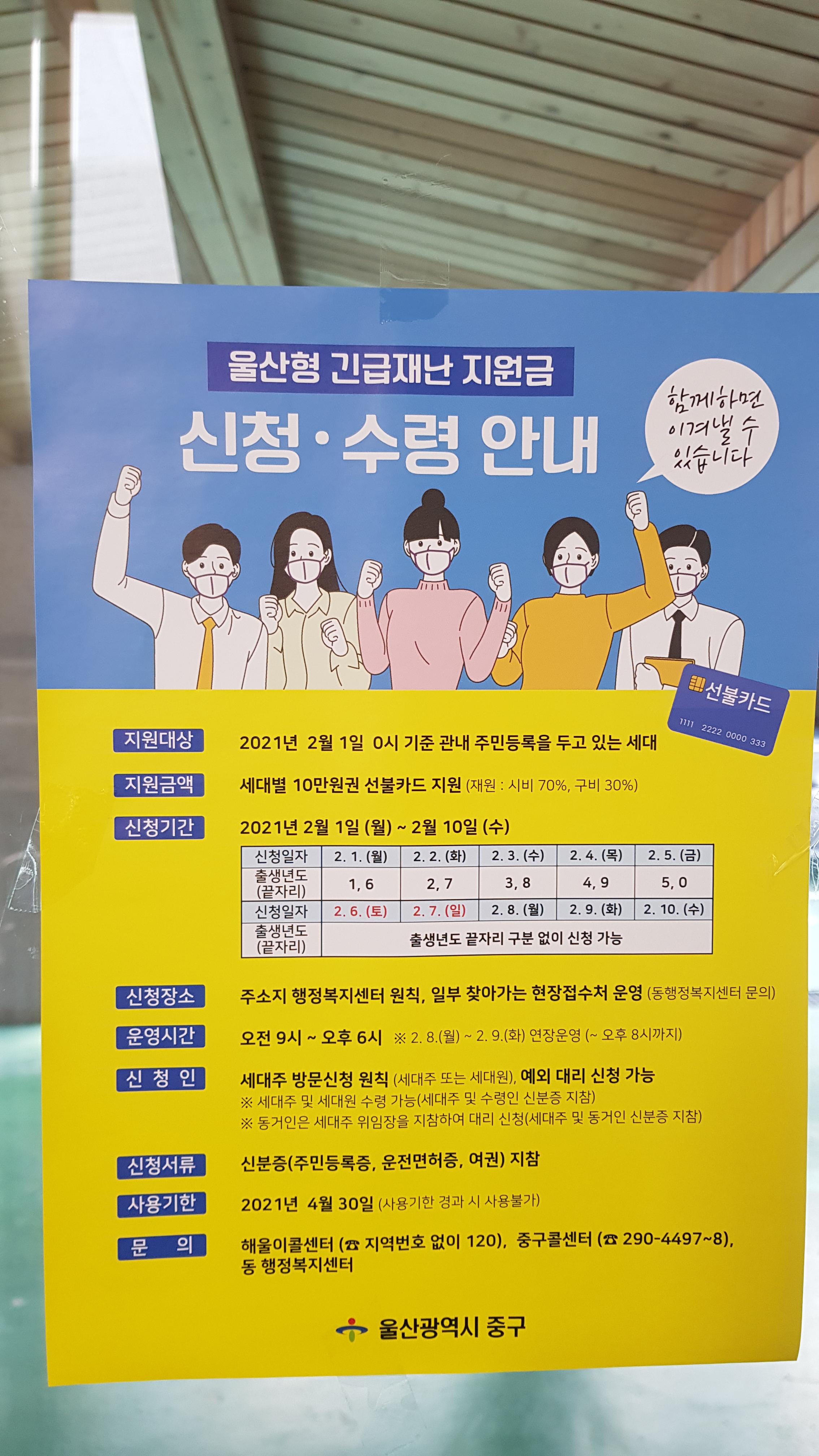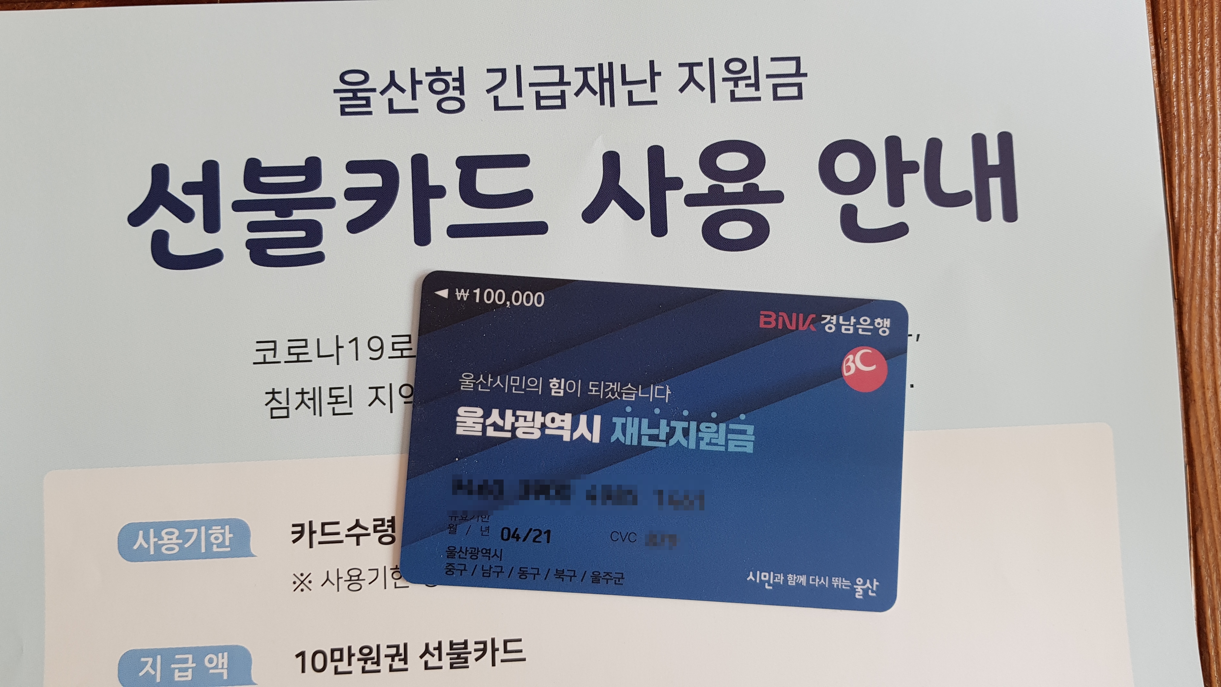 세대당 10만원 선불카드로 지급되는 울산형 긴급재난 지원금 신청이 이루어지고있다.
