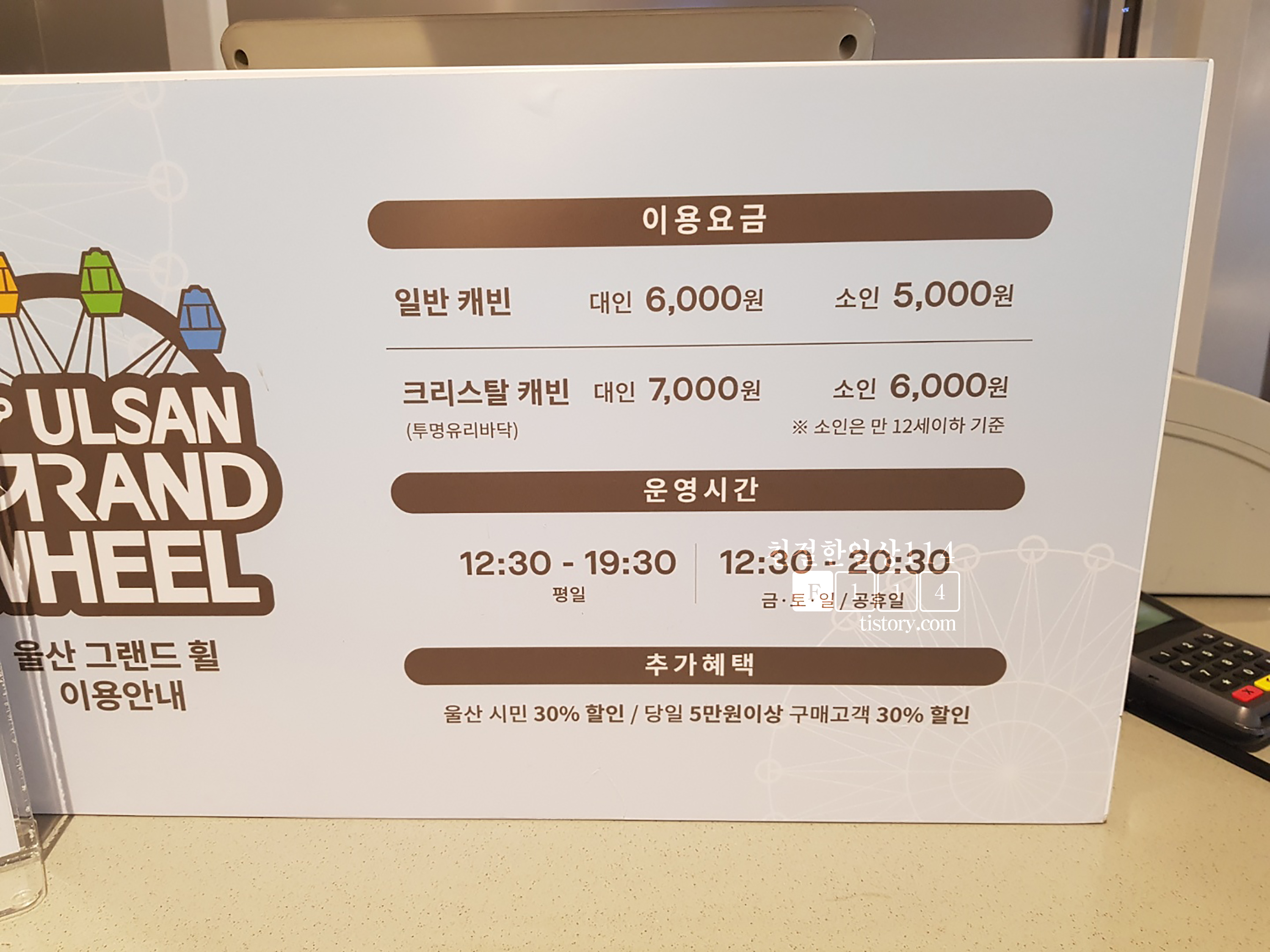 티켓가격은 일반캐빈 성인 6,000원, 소아 5,000원 / 크리스탈캐빈 성인 7,000원, 소아 6,000원 이다. 높은곳을 무서워하지 않는 6살 아이라서 크리스탈 캐빈을 타기로 한다. 그리고 미취학아동(초등학교 입학전)은 요금을 받지 않는다. 성인 2명 울산시민으로 30% 할인 받아서 9,800원 결제했다. 울산시민 확인은 구두상으로 했다. Q "울산에 사나요?" A "네" 할인적용 ok. 쿨하다.