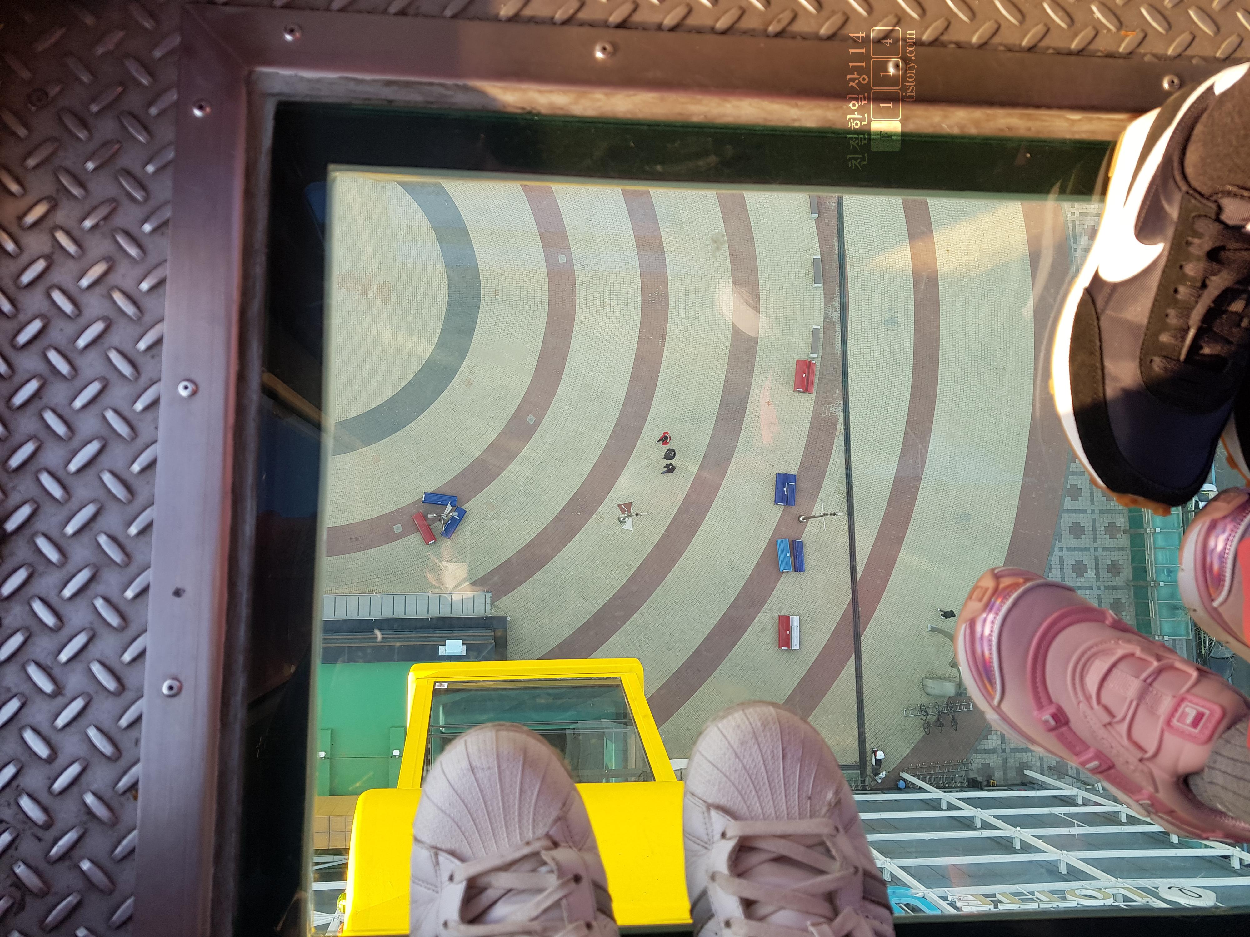 크리스탈 캐빈은 바닥이 투명 플라스틱으로 되어있어서 아래를 내려다 볼 수 있다. 광장을 지나다니는 사람은 작은 점처럼 보이고 벤치는 레고블럭 처럼 보인다. 이제부터 관람차에서 바라본 울산 시내 전경을 감상해보자.