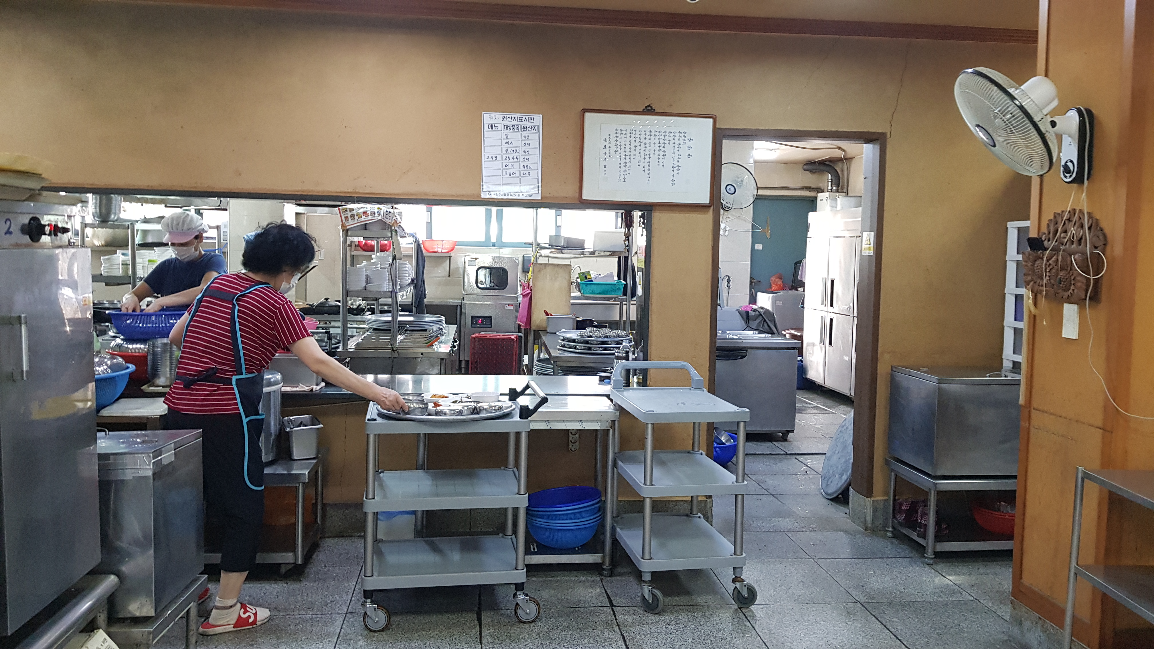 경기식당 내부로 들어서자 왼쪽으로 카운터와 주방이 보인다. 식당 건물 외관을 봤을때도 꽤나 규모가 크게 느껴졌는데 역시나 시원하고 넓직한 홀이 마련되어 있다.