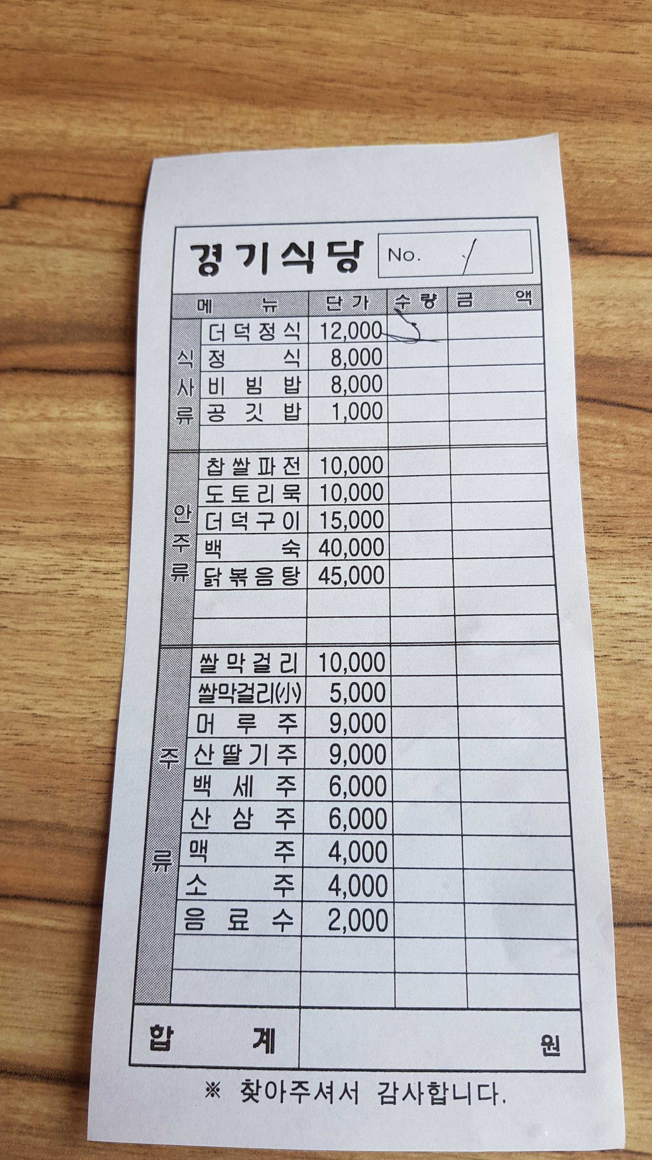 자리에 앉자 아주머니께서 주문서를 들고 주문을 받아가신다. 비빔밥 1개 더덕정식 1개 맛보고 싶었지만 정식은 2인 이상 주문 할 수가 있어서 더덕정식 2인분으로 주문했다. 산채비빔밥도 도토리묵도 먹어보고 싶지만 더덕구이가 괜찮다면 다음에 재방문때 다른 메뉴도 맛 볼 예정이다.