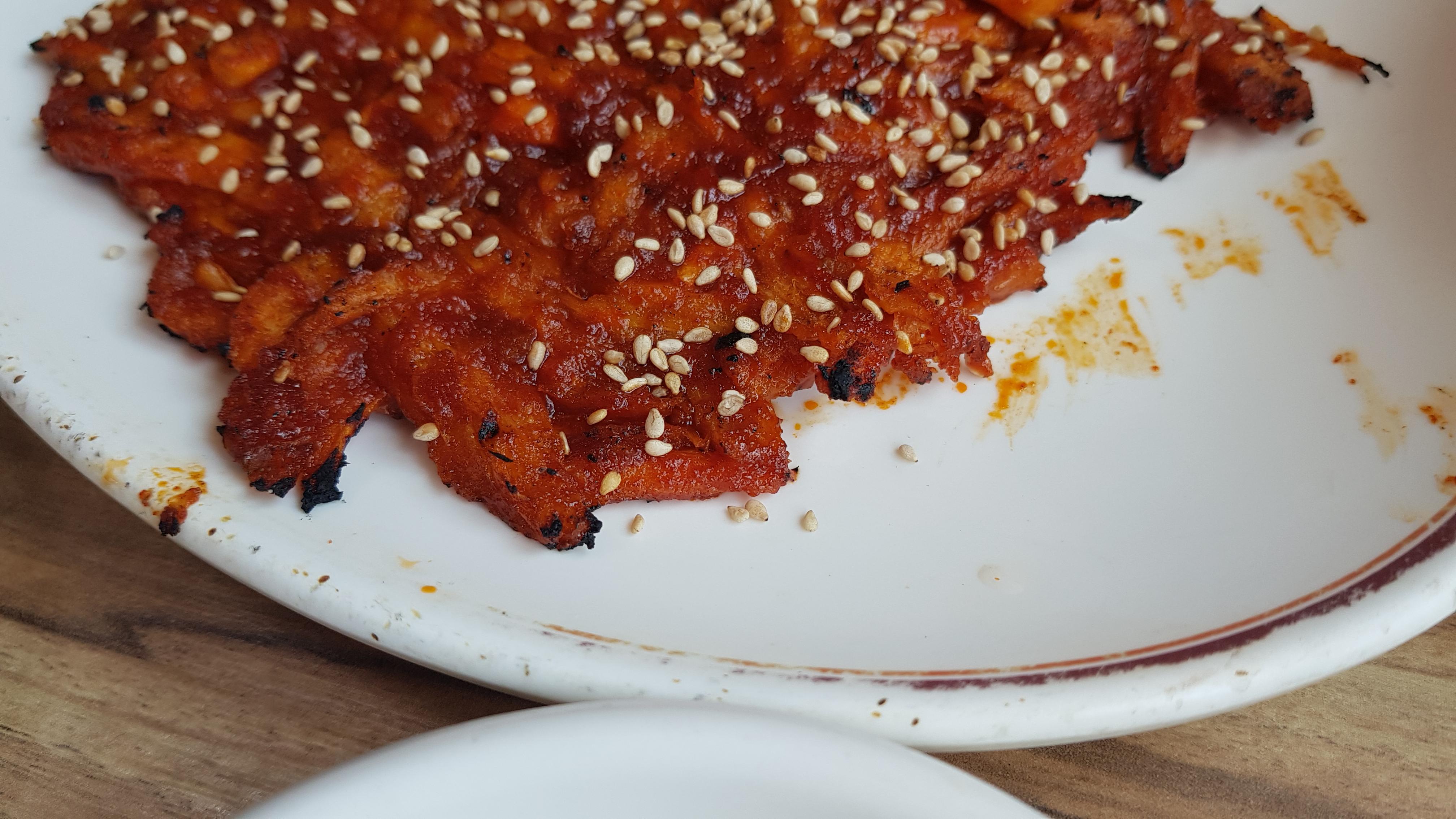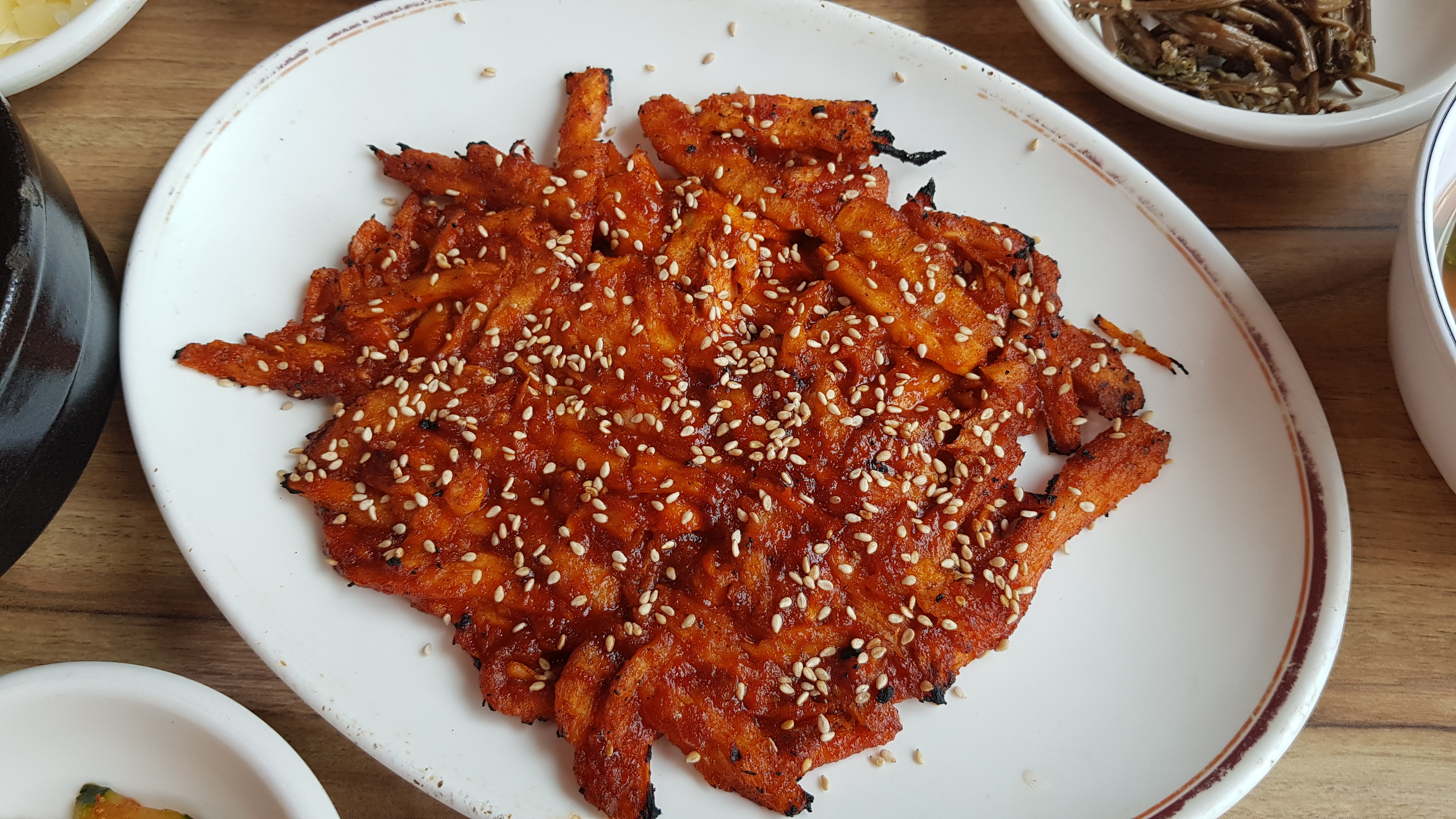 아래는 경기식당에서 맛본 더덕구이 정식 사진이다. 더덕이 직화로 구워져서 나와 끝에 조금씩 탄부분이 있어서 탄 부분은 떼어내고 먹는다. 더덕의 향긋한 향, 쌉싸름 함과 양념의 매콤함 거기에 불향이 더해져 정말 맛있다. 처음 나왔을때 양이 적어보였는데 먹다보니 적지 않은 양이었다. 마지막에 더덕구이가 조금 남아서 필자가 질리도록 먹기위해 열심히 먹었다. 그래도 질리지 않고 맛있다. 필자가 대식가 였으면 좋겠다는 생각이 들었을 정도이다. 밥 한공기 더 시켜서 남은 더덕구이와 반찬들을 먹고 싶었으니 말이다.