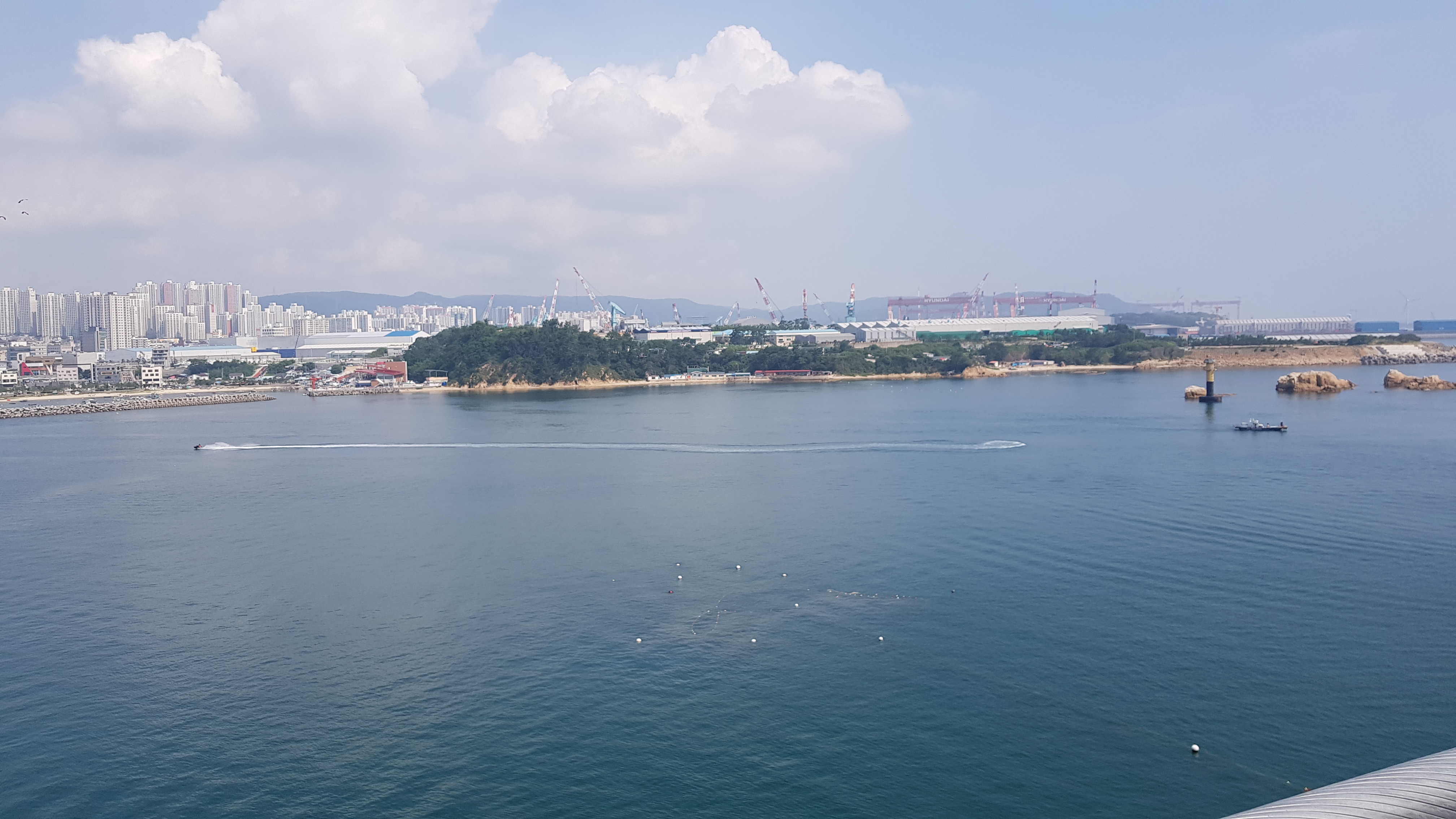 다리를 건너며 왼쪽편으로 시원한 바다와 현대중공업이 보인다. 바다위로 스피드보트가 시원하게 바다를 가르고 있다.