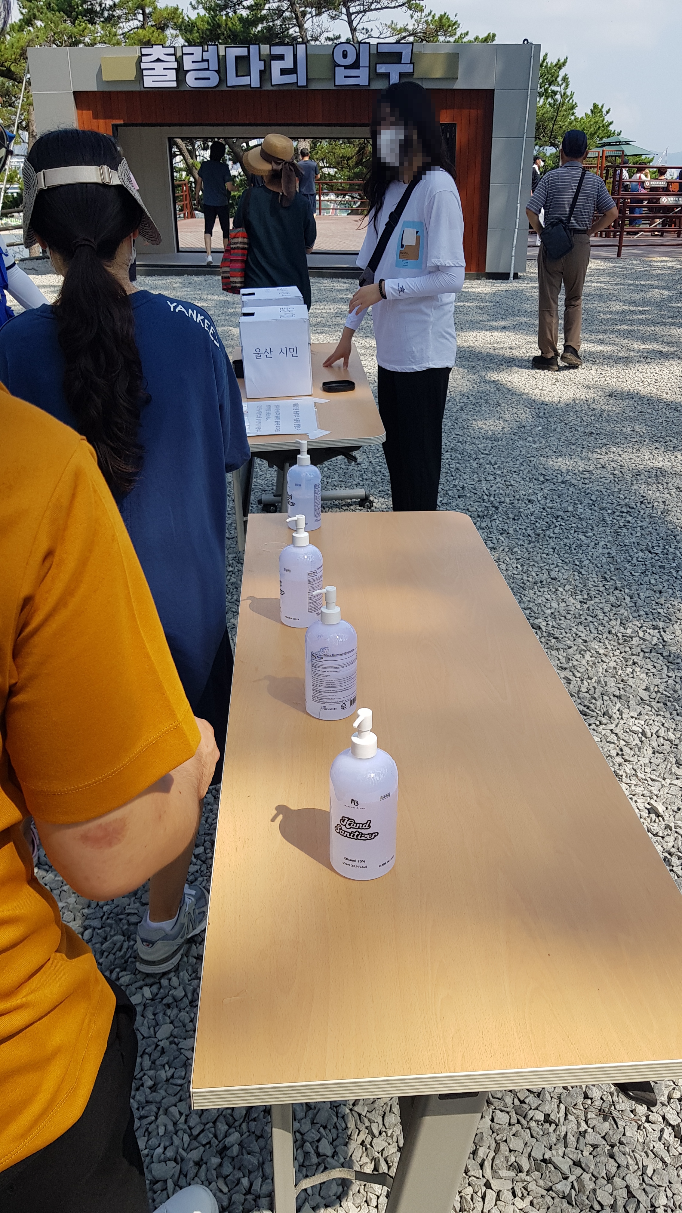 대왕암공원 입구에서부터 약 10분정도 걸으니 출렁다리 입구에 다다랐다. 핸드폰을 손에든 사람들이 파란색 배너앞에서 모여있다.