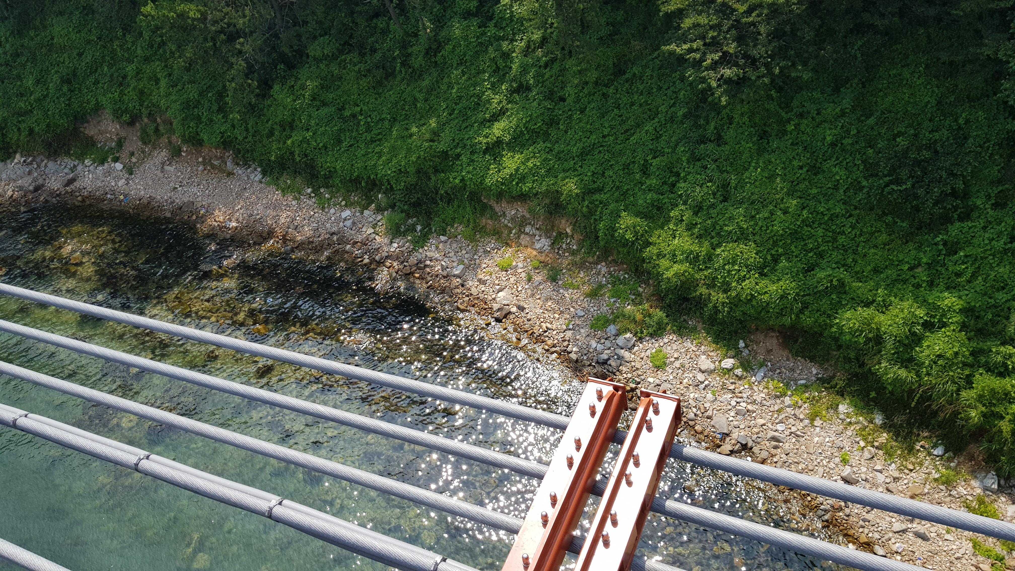 출렁다리의 시작지점은 계단식으로 되어있다. 안전요원이 말을 해주지만 그래도 아래를 잘 보고 발을 디뎌야 넘어지지 않을 것이다.