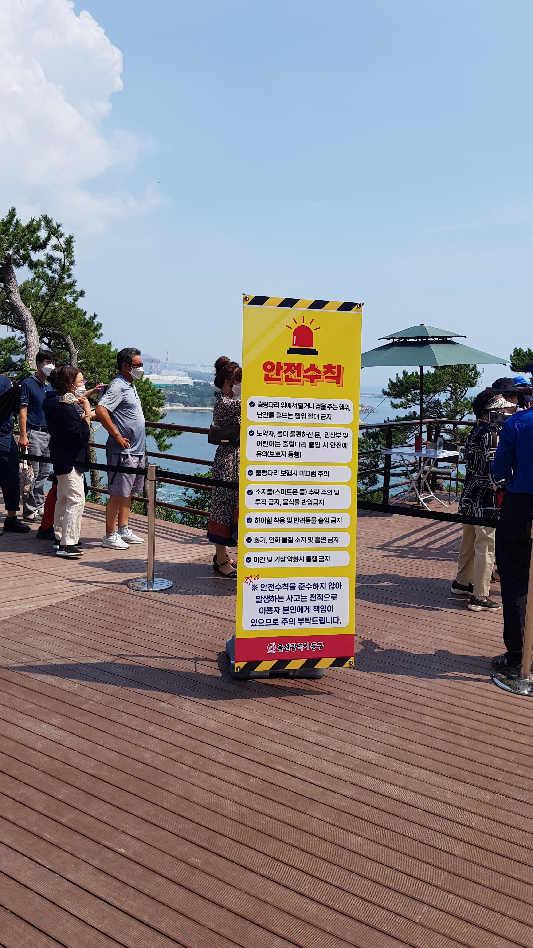안전수칙도 한번 읽어보고 반대편으로 보이는 일산해수욕장 풍경도 보며 조금씩 출렁다리에 다가갔다. 입구에는 안전요원이 방문객 안전을 위해 감시하고 있다. 울산 대왕암공원 출렁다리는 안전상의 이유로 일방통행이다. 건너가다가 도중에 다시 되돌아 나오는 일이 없어야 할 것이나 간혹 생각보다 높아 포기하고 돌아나오는 경우가 있다. 필자가 갔을 때에도 돌아서 나오는 사람들 보았다.