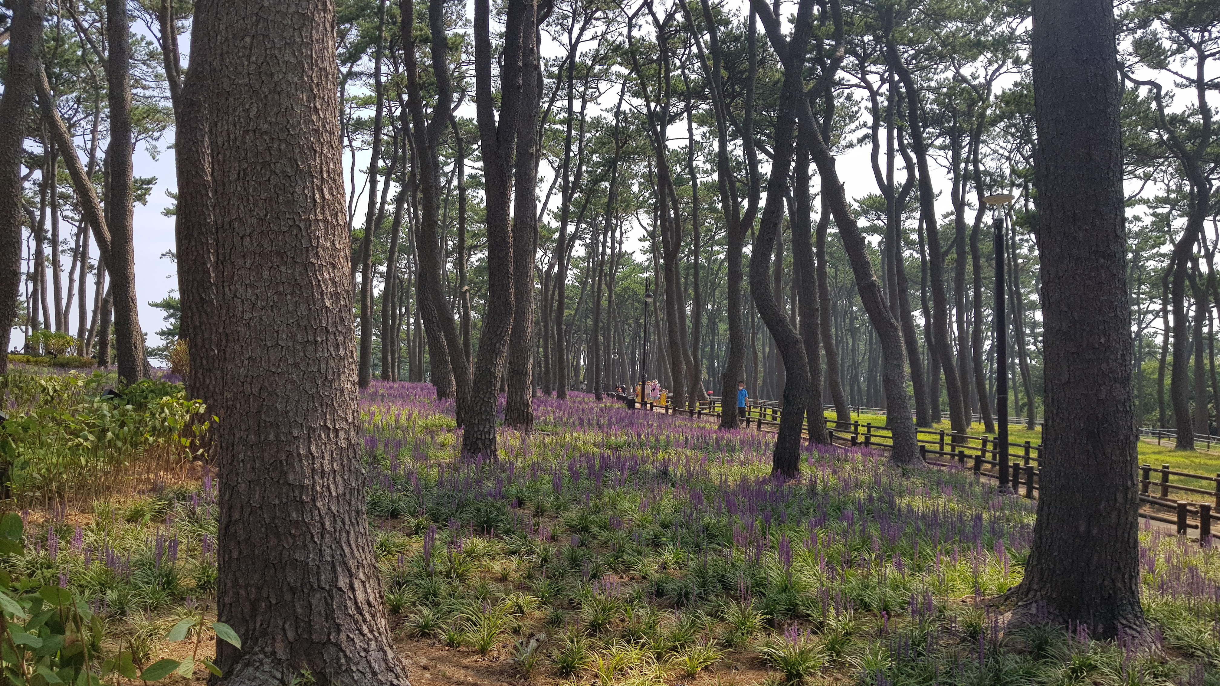 출렁다리를 가는 길에 맥문동이 가득 피어있어 사진찍기 좋다. 사람들이 인적이 드문 길에 서서 사진을 찍는 모습이 보인다.