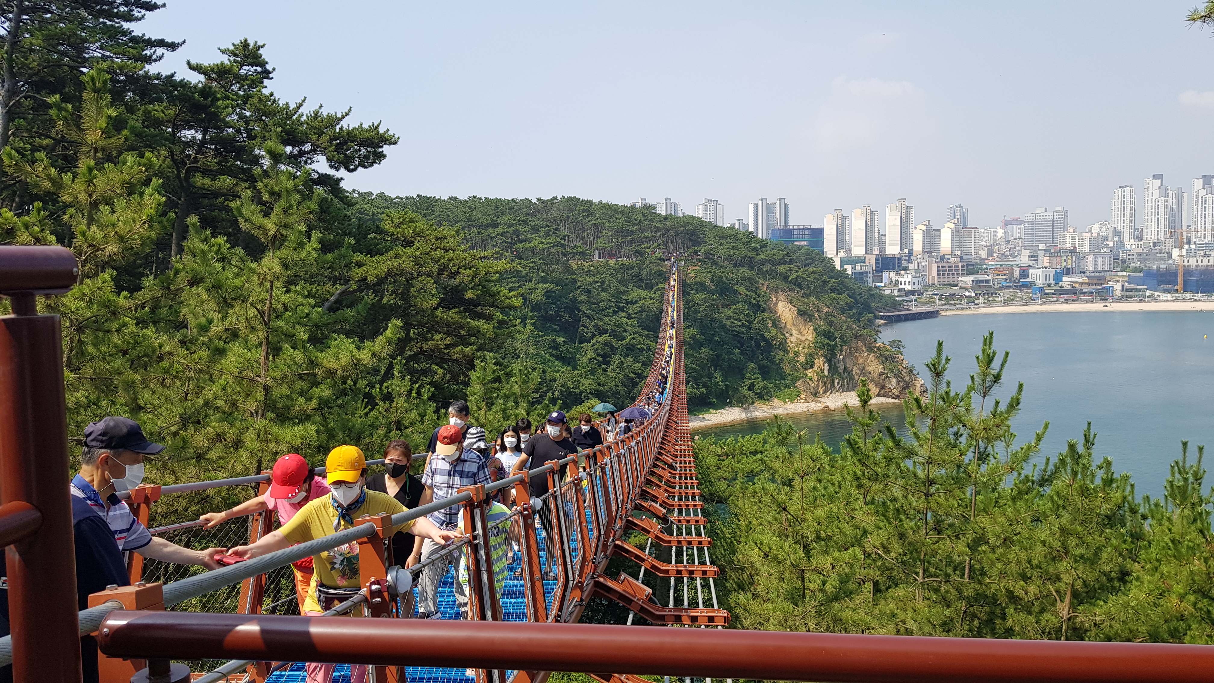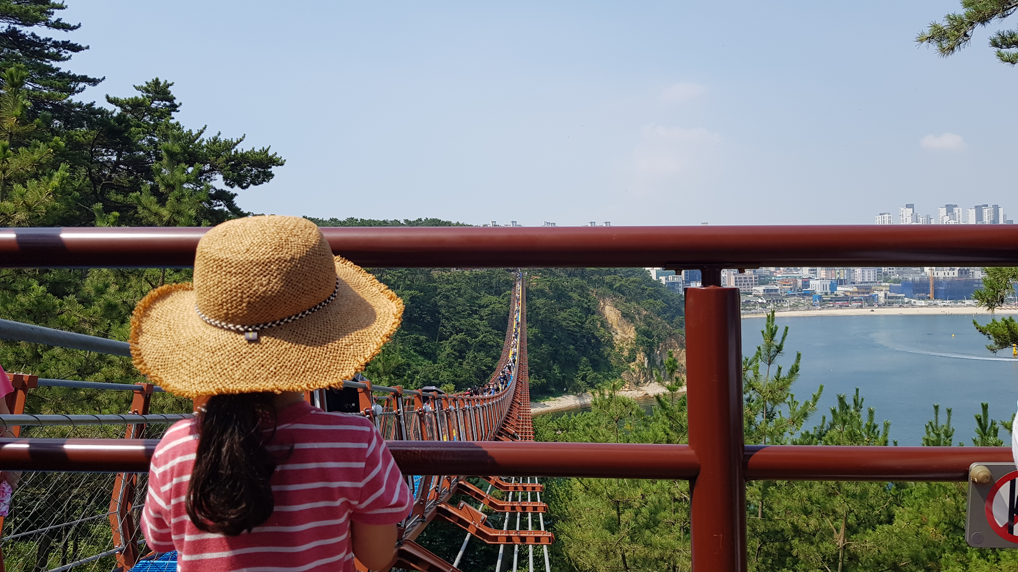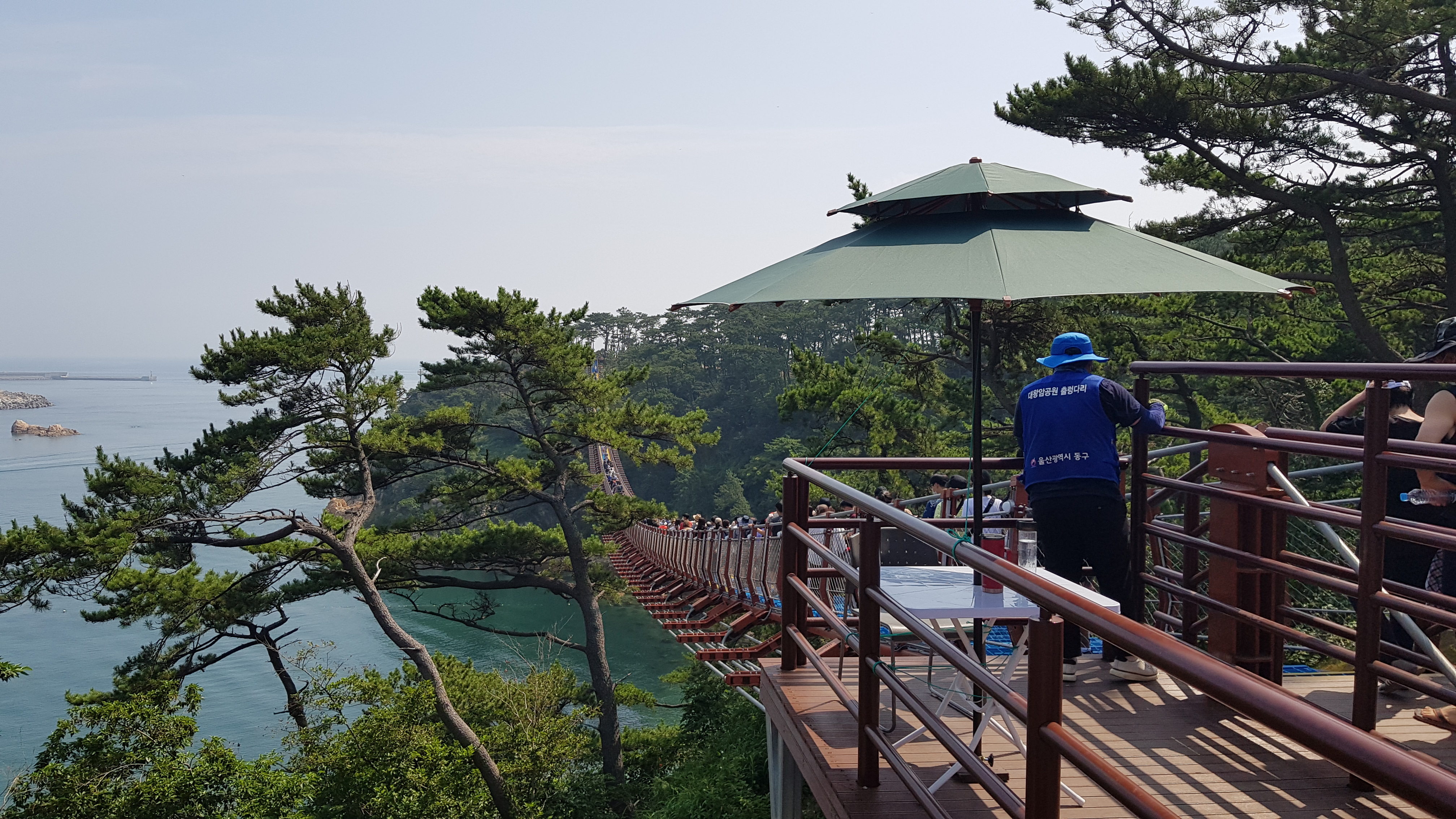 울산 동구에 개장된 대왕암공원 출렁다리가 울산의 떠오르는 명소로 자리매김하고 있는 모양새이다. 7월 15일에 개장하여 19일만에 약 20만 명이 다녀갔다고 한다. 하루 평균 1만명 이상이 다녀간 셈이다. 필자는 개장 소식은 접하긴 했지만 날씨도 덥고 무료 입장 기간이라 사람이 더욱 많을것 같아 엄두를 내지 못 하고 있었다. 그러다 딸아이가 방학을 하고서 가족과 같이 나들이 갈만한 장소를 찾던 중 이곳이 생각났다. 무더운 여름이긴 하지만 이열치열이라는 말이 있지 않던가. 핫한 여름 울산에서 핫한 장소를 가보기로 한다. 출렁다리는 울산 동구 대왕암공원 북측 산책로중 두곳의 돌출지를 연결한 다리로 중간지지대가 없어 흔들흔들, 출렁출렁 거리게 된다. 이 출렁다리는 울산에서는 최초의 출렁다리이며 국내에서는 최장의 길이 이다. 현재는 무료로 운영이 되고 있지만 8월 31일 이후인 9월 1일 부터는 유료화로 운영이 될 예정이라고 한다. 이제부터 가족과 함께 다녀온 후 나들이로 추천하는 출렁다리 이야기를 해보고자 한다.