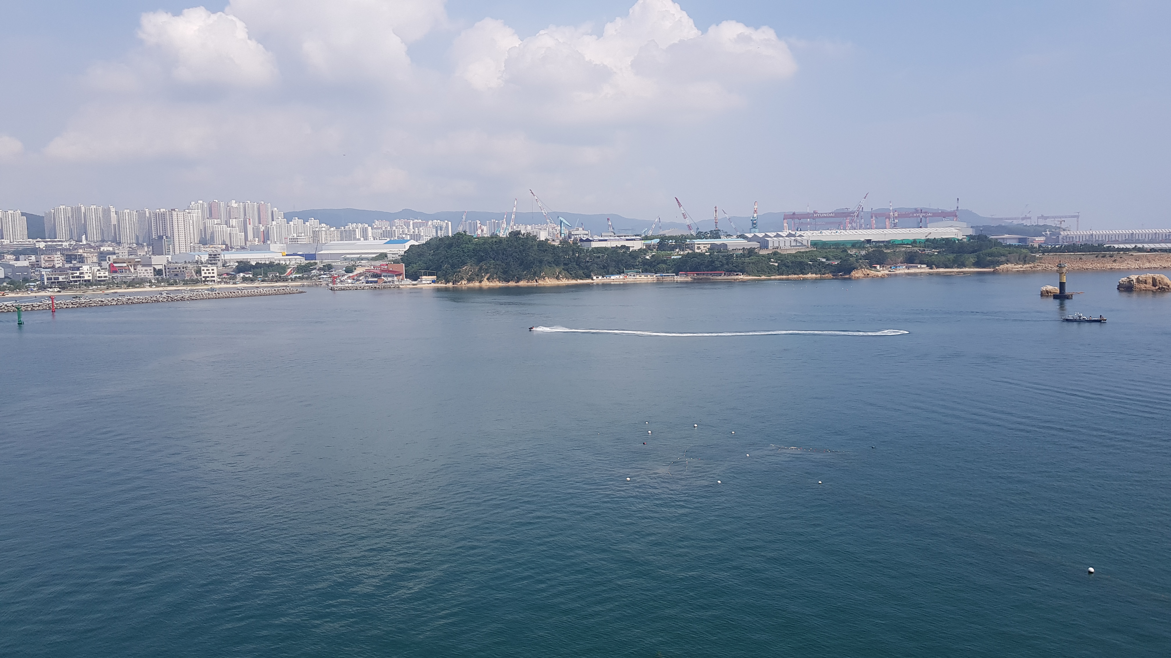 다리를 건너며 왼쪽편으로 시원한 바다와 현대중공업이 보인다. 바다위로 스피드보트가 시원하게 바다를 가르고 있다.