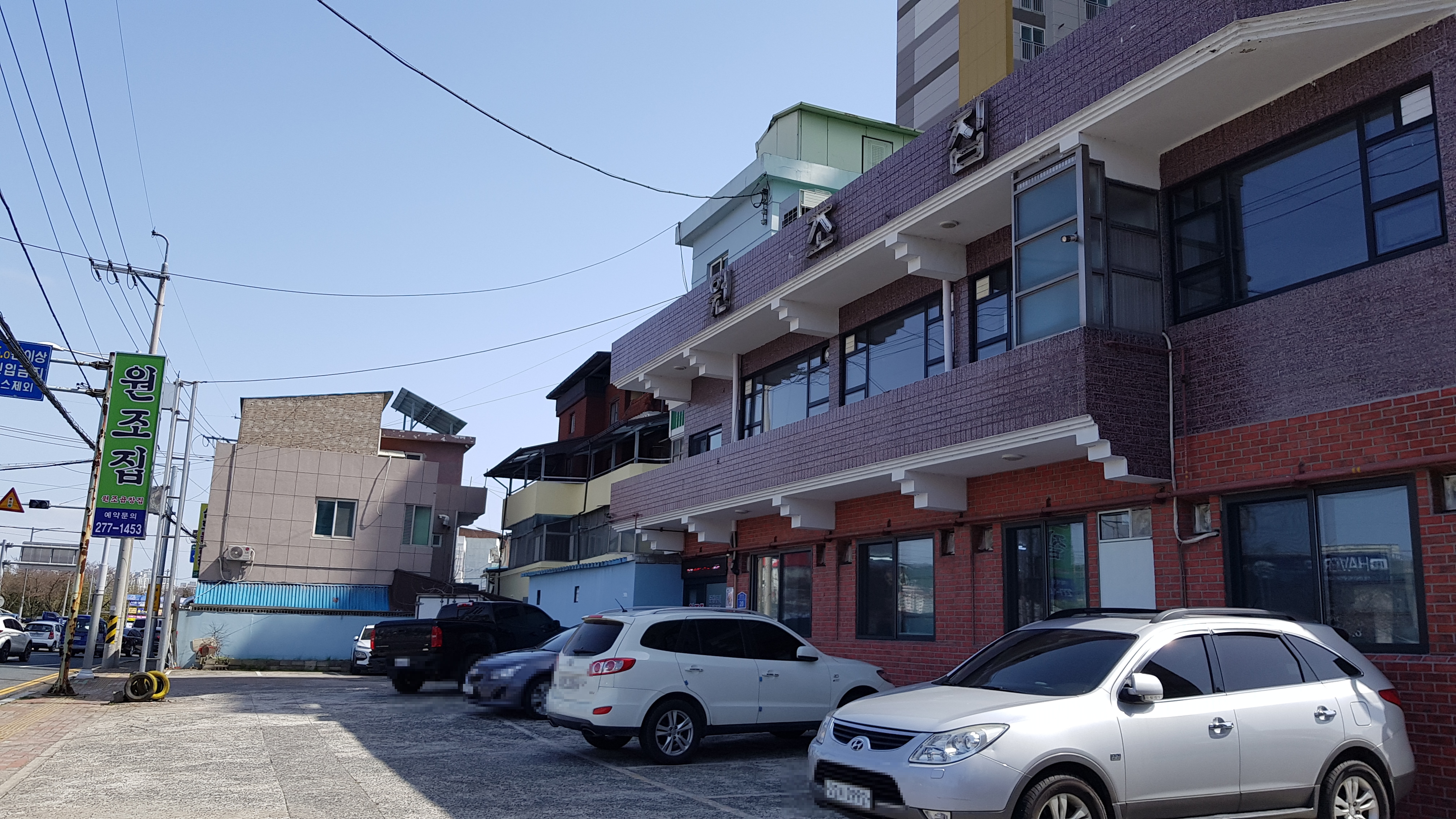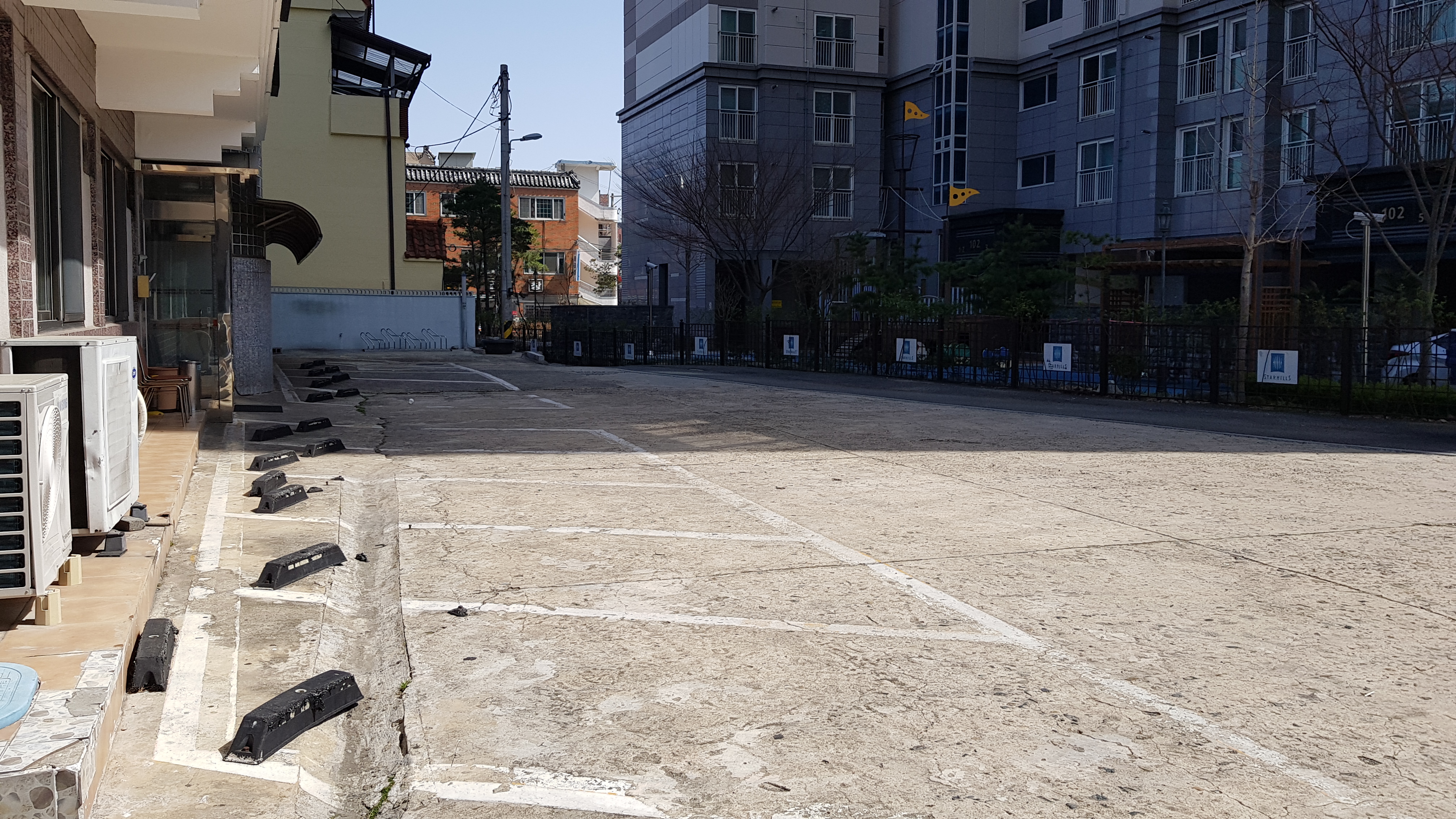 건물 뒷쪽으로 가면 더 넓은 주차장이 있다. 점심시간이 조금 지나서 차가 없다.