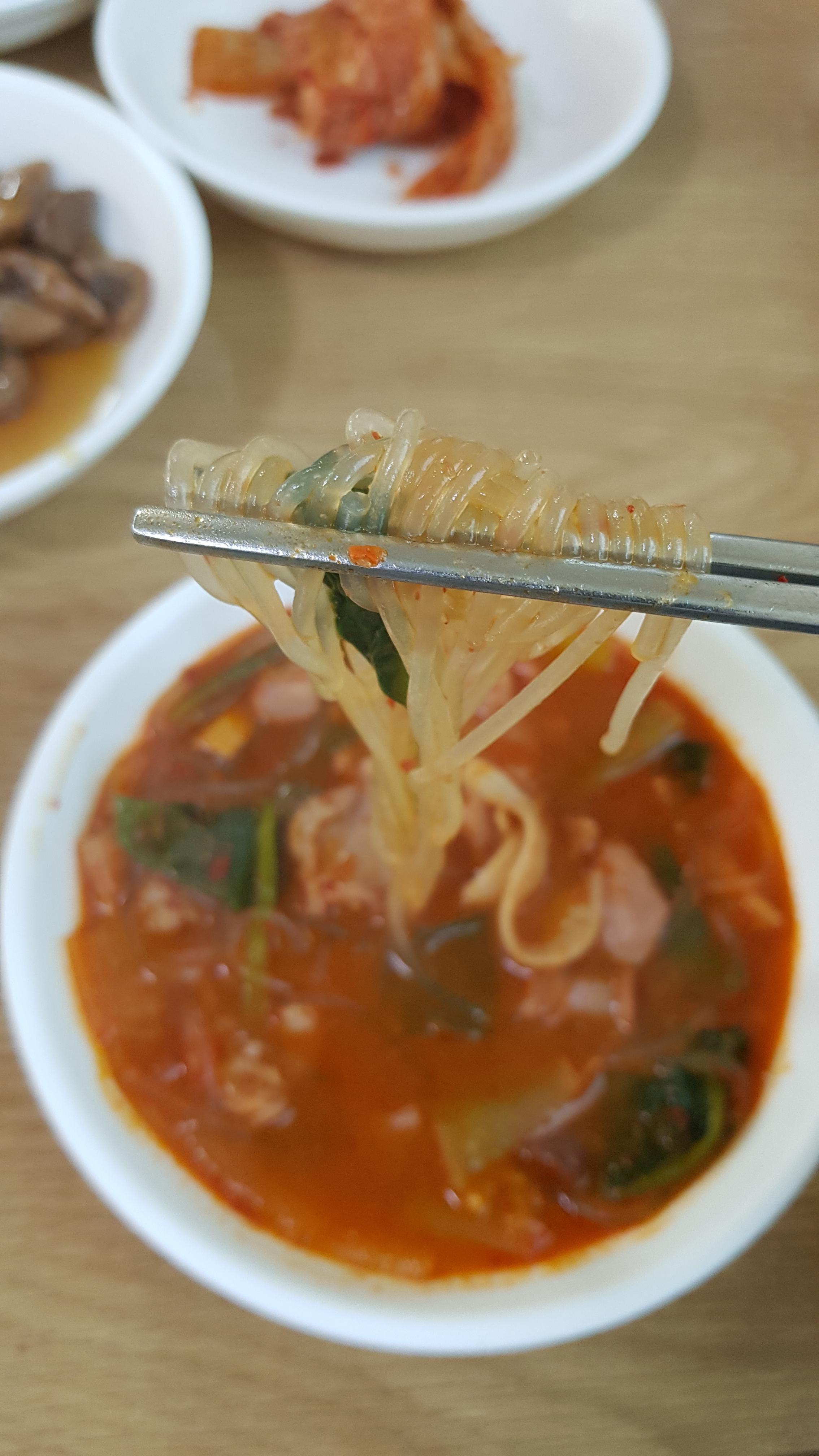 국자로 그릇에 덜어서 국물 한숫갈 떠 마시고 당면을 호로록 먹는다.