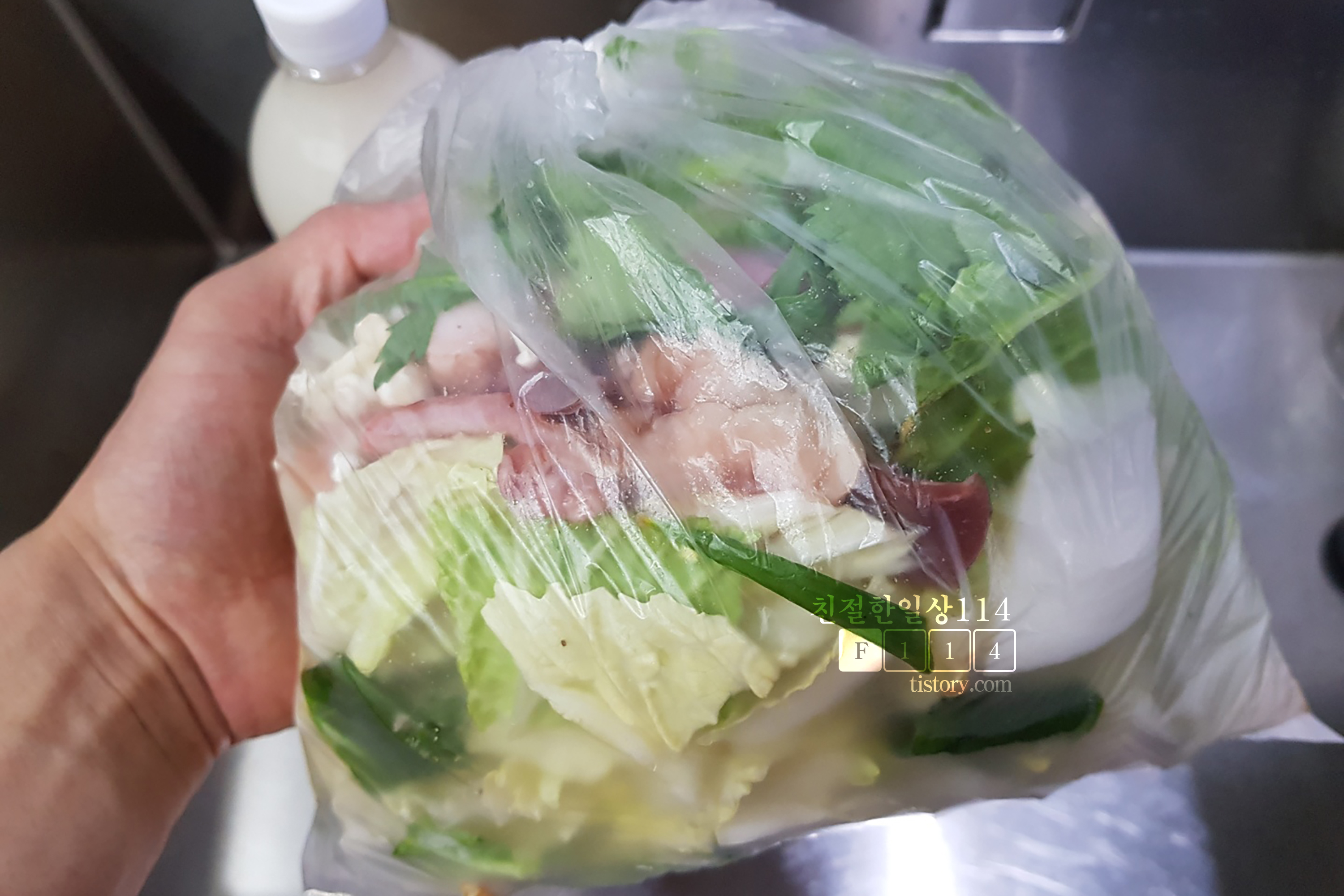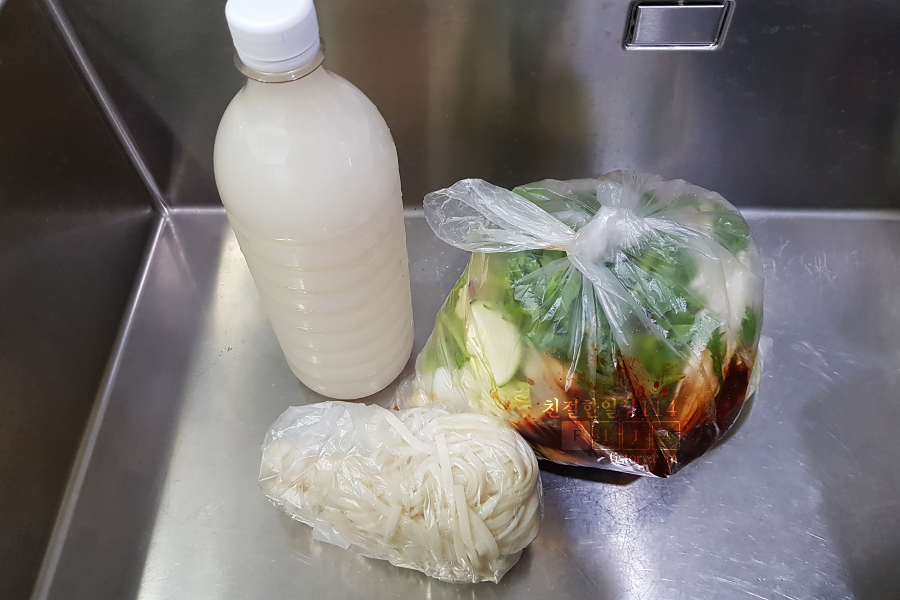 곱창전골 2인분을 포장해왔다. 검은 봉투에 담아주었으며 봉투를 열어보면 야채와 곱창, 양념이 같이 한봉투어 들었고 페트병에 육수 그리고 삶은 칼국수면으로 구성되어 있다. 재래식 밀키트 같다.