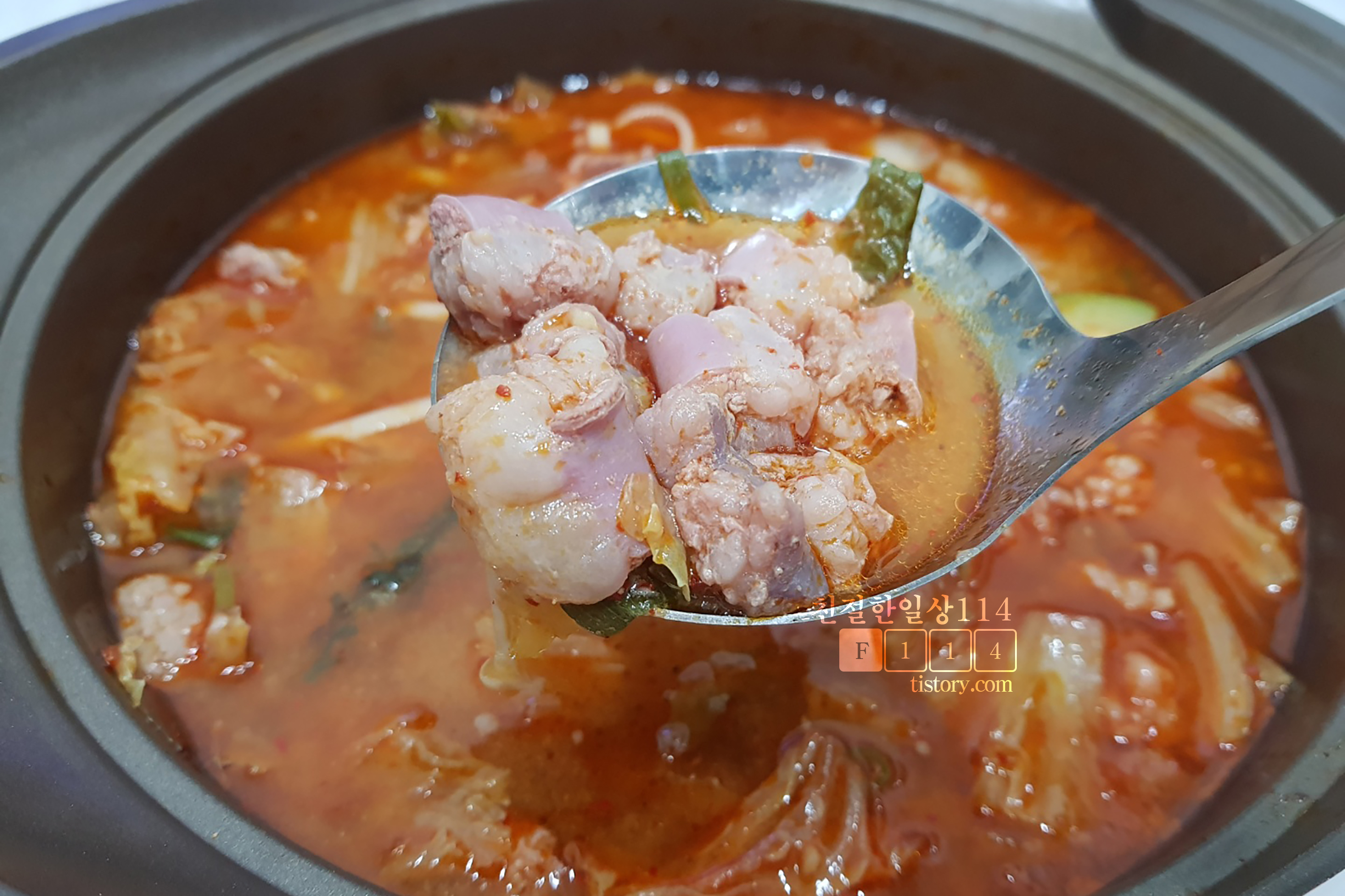 큰 국자로 곱창만 대강 떠 보았다. 토실한 곱창이 먹음직 스럽다. 2인분 치고 곱창양이 그리 많지는 않다.