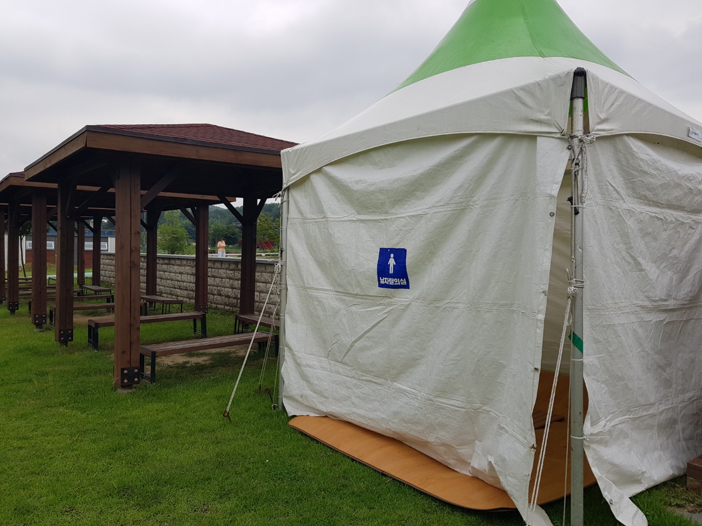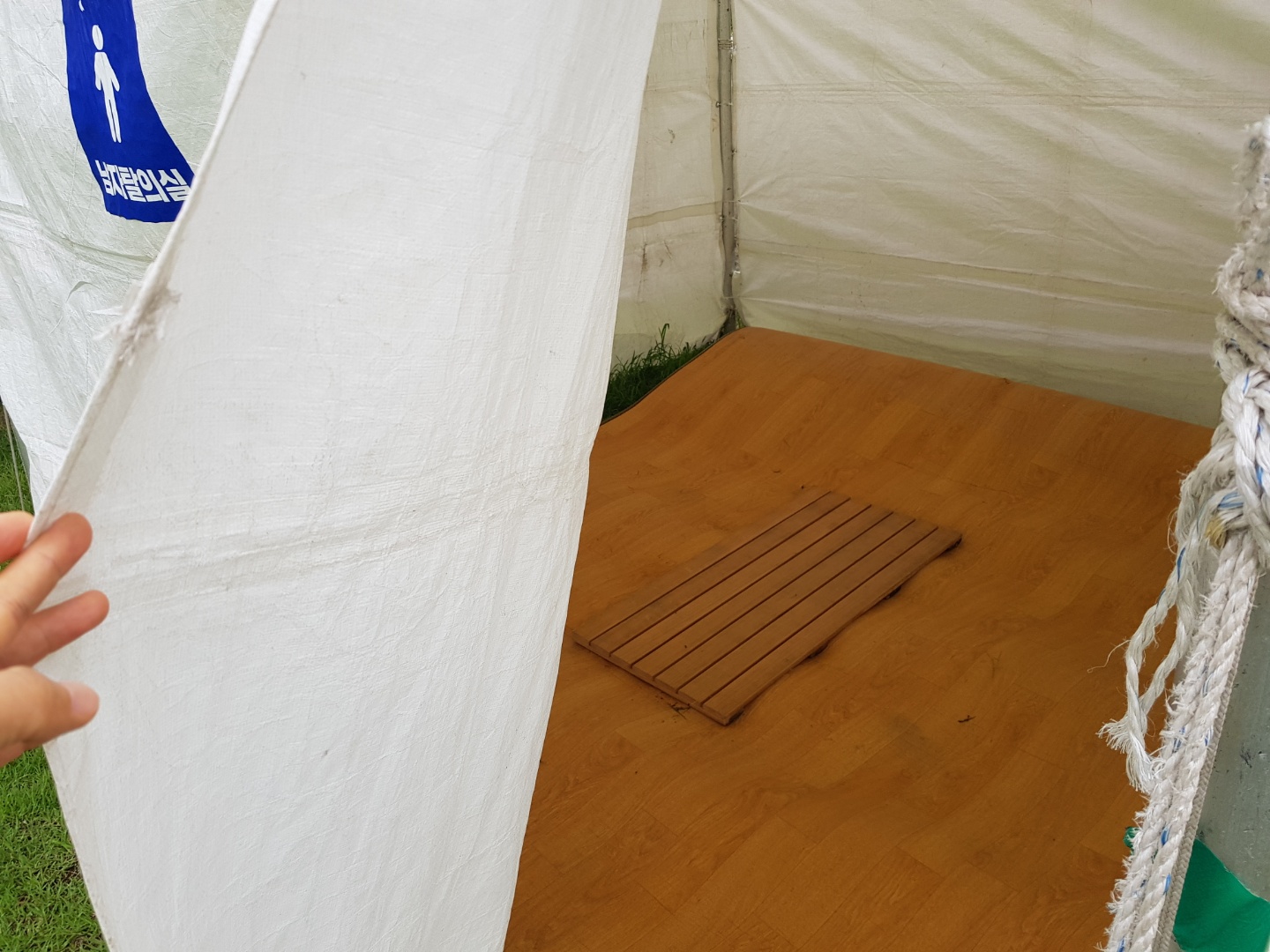 공원에서 물놀이장 입구 계단 양옆쪽에 남/녀 탈의실이 마련되어 있다. 안을 들여다보니 이렇게 장판이 깔려있다.
