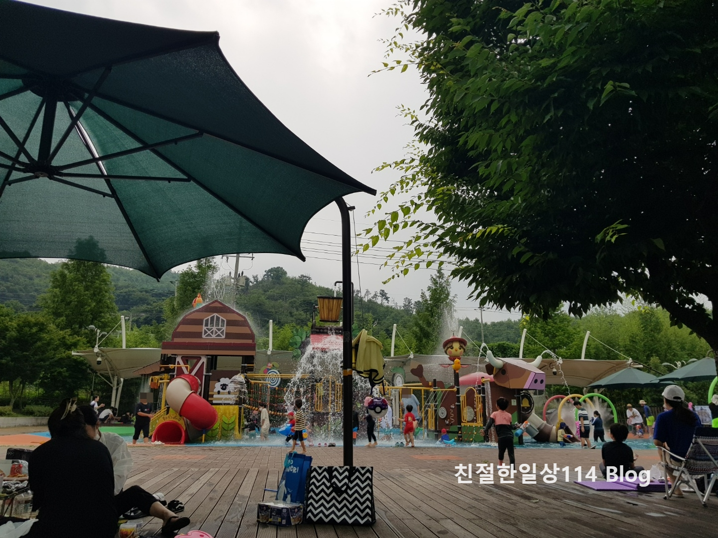 물놀이장 주변에는 데크와 대형파라솔이 설치돼 있어서 물놀이를 하는 아이들 가까이에서 편하게 지켜볼 수 있다.