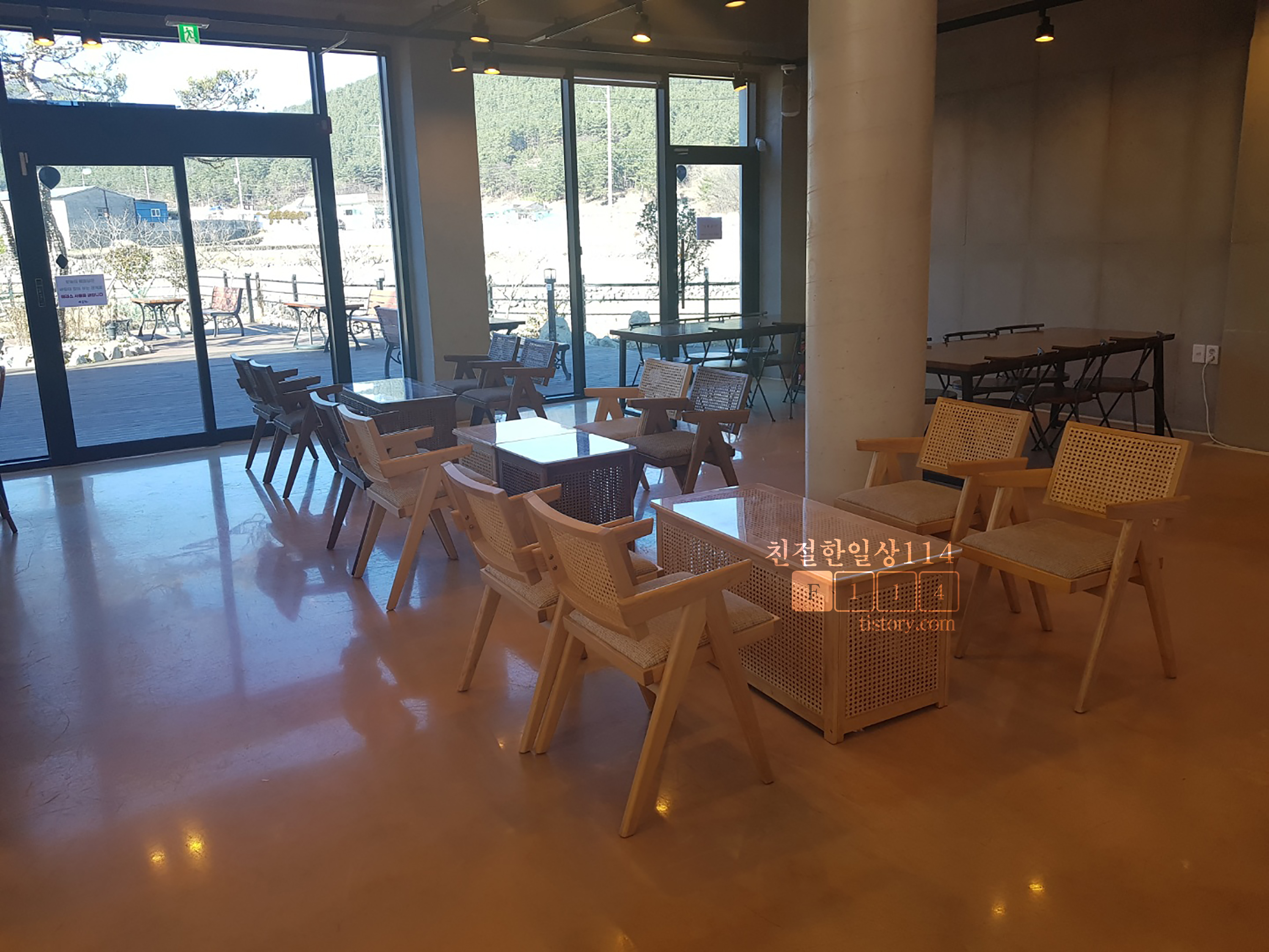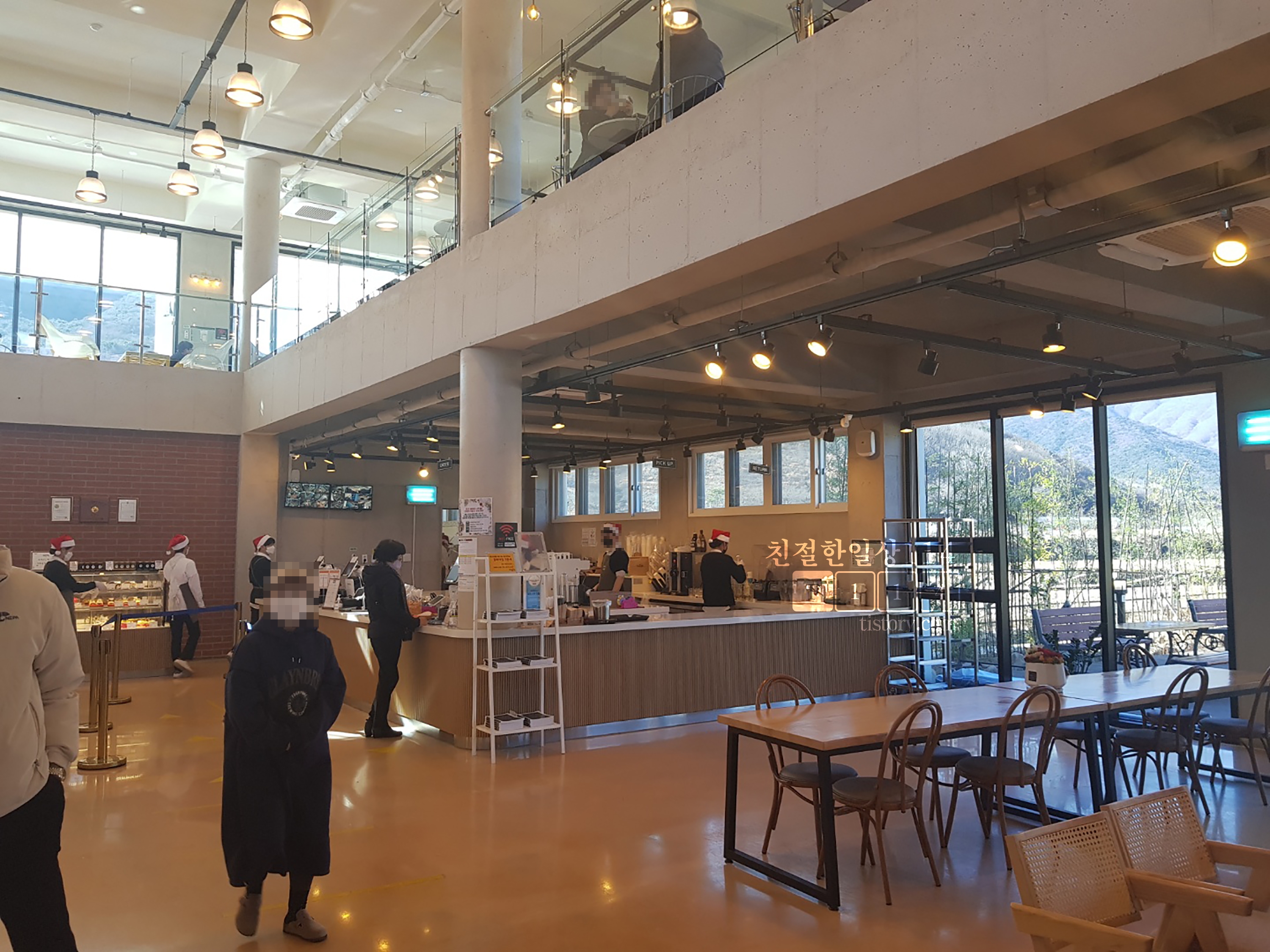 건물 내부 오른쪽 편에는 카운터와 테이블이 마련되어 있다. 바깥 데크에는 야외 테이블이 있었는데 때마침 한파가 닥친 날이라서 2층에는 사람이 가득했지만 야외에는 한명도 없다. 봄, 가을에는 풍경을 구경하며 먹기에 좋을 듯 하다.