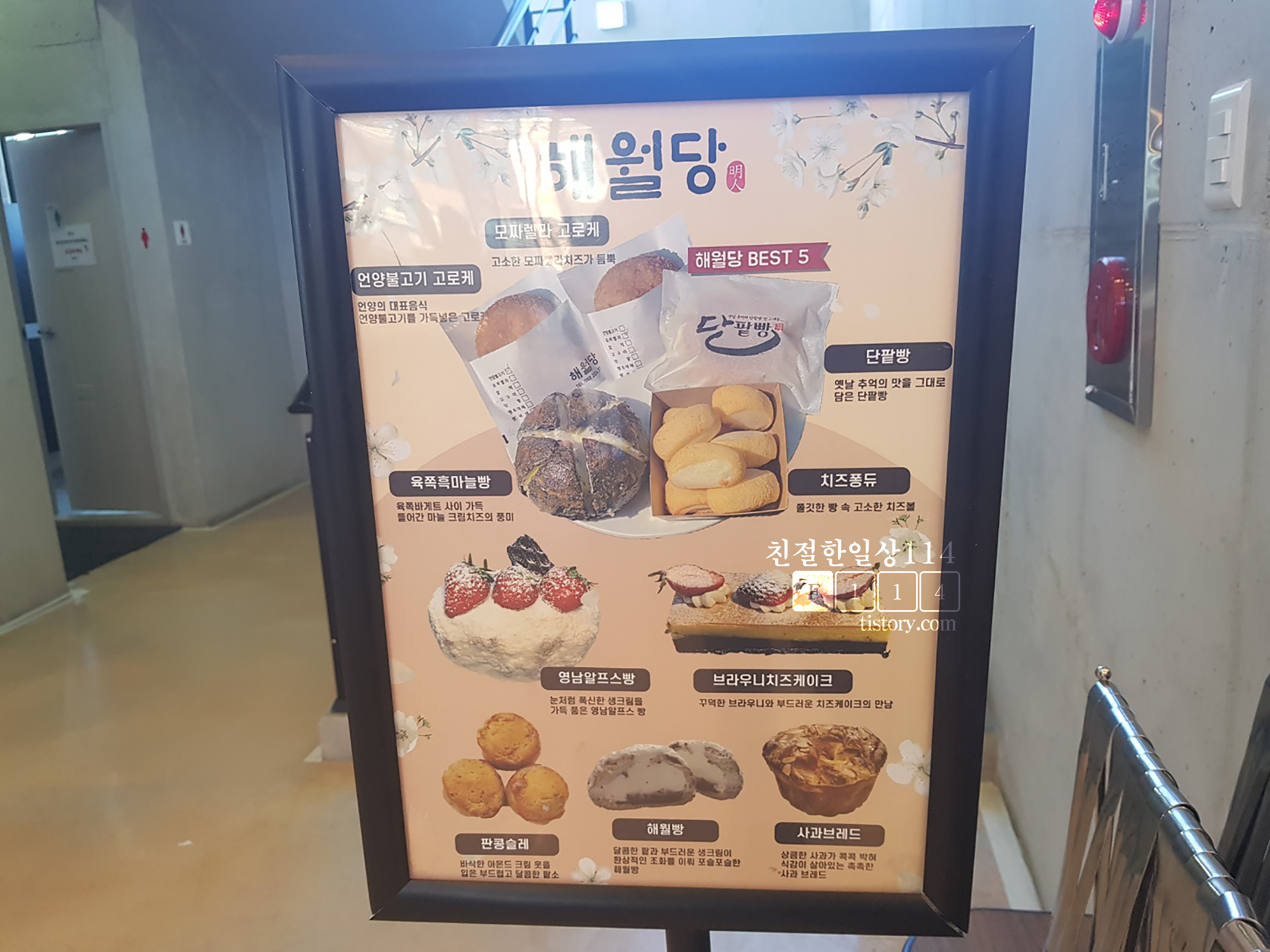 해월당 내부에 들어가면 집게와 트레이가 있는 곳에 이렇게 해월당 베스트 5 빵을 소개하는 포스터가 있다.