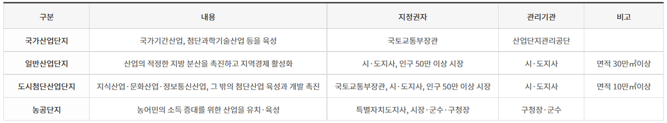 산업단지는 규모와 목적에 따라 국가산업단지, 일반산업단지, 도시첨단산업단지, 농공단지 이렇게 4가지로 구분 한다. 그리고 구분에 따라 지정권자와 관리기관이 정해진다.