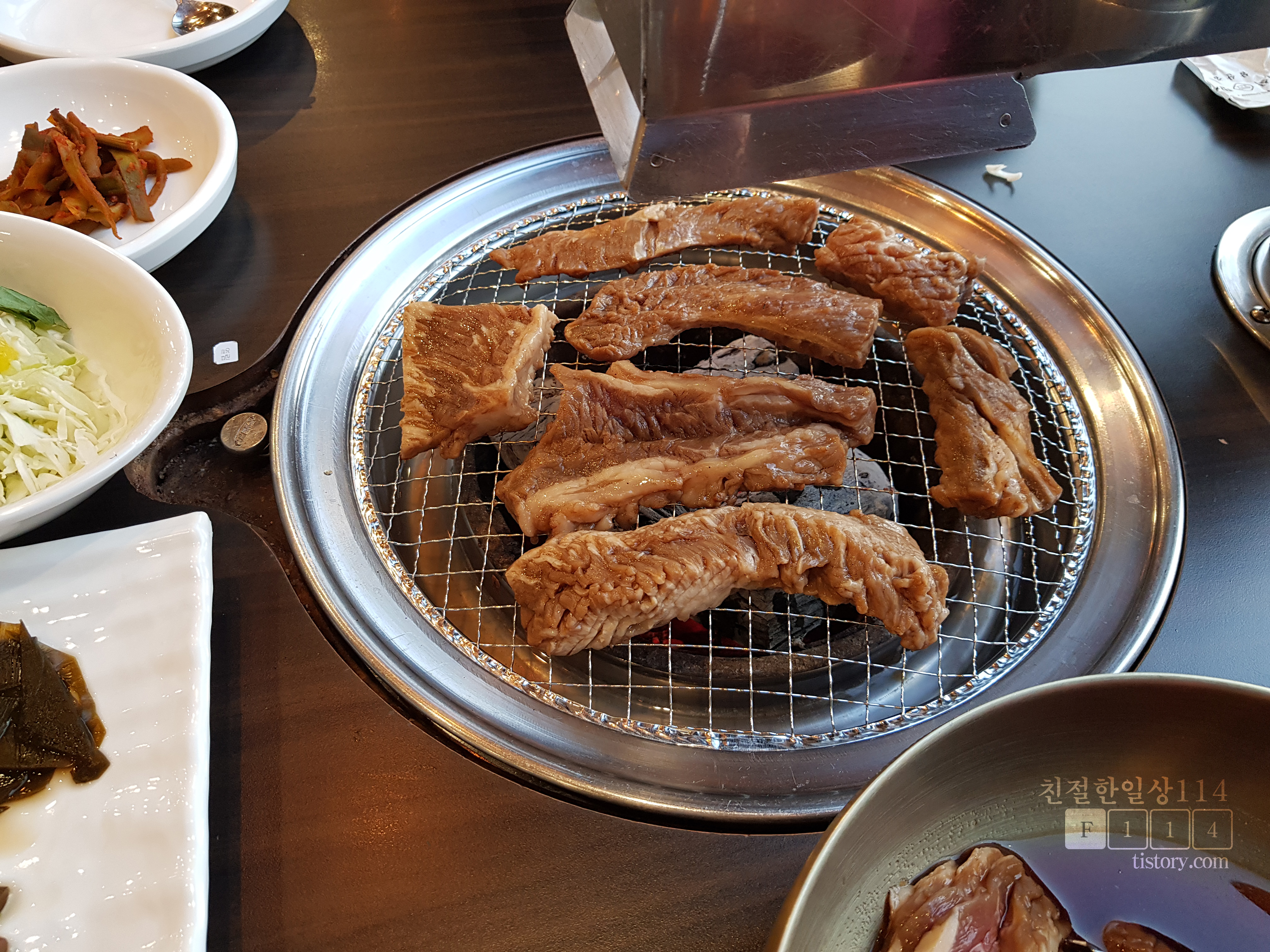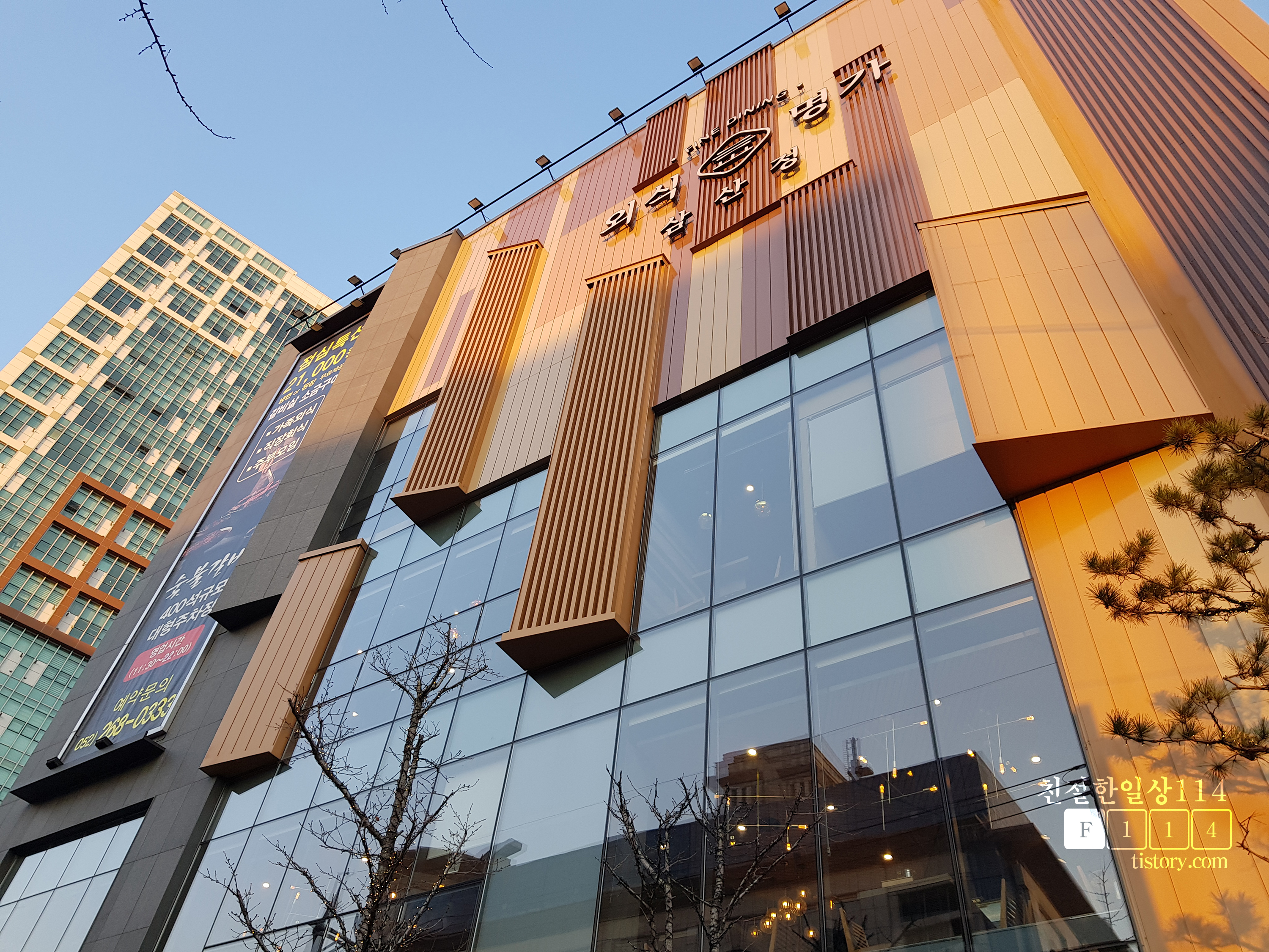 울산 삼산동 롯데백화점에서 볼일을 보고 딸아이가 타고 싶다던 관람차도 탔다. 5시가 조금 못 된시간이었지만 출출함이 느껴져 아내와 아이에게도 물어보니 다들 배가 고프다고 한다. 점심 이후 부지런히 움직인 덕분인 듯 하다. 백화점 안에 있는 식당에서는 구미가 당기는 메뉴가 없어서 근처 맛집으로 찾아본다. 소갈비를 먹을 수 있는 외식명가 삼산정이라는 식당이 맛있다고 해서 위치를 찾아보는데 바로 백화점 길 건너편에 있다. 백화점에서 내려다 보니 도로 건너편에 식당 건물이 보인다. 생긴지 얼마 안된 듯 깨끗하고 멋진 건물이다. 가격대는 있어보이지만 갈비라면 우리 세식구 모두 좋아하기에 메뉴를 확정하고 외식명가로 간다. 처음가본 외식명가에서 갈비살 양념구이와 된장찌개를 주문해서 먹었는데 정말 맛있었다. 입이 짧아 평소 힘들게 떠먹이던 딸아이도 혼자서 숟가락을 들고서 퍼먹게 만들었다. 어른, 아이 입 맛을 사로잡은 갈비 맛집 외식명가 후기를 사진과 함께 남겨본다.
