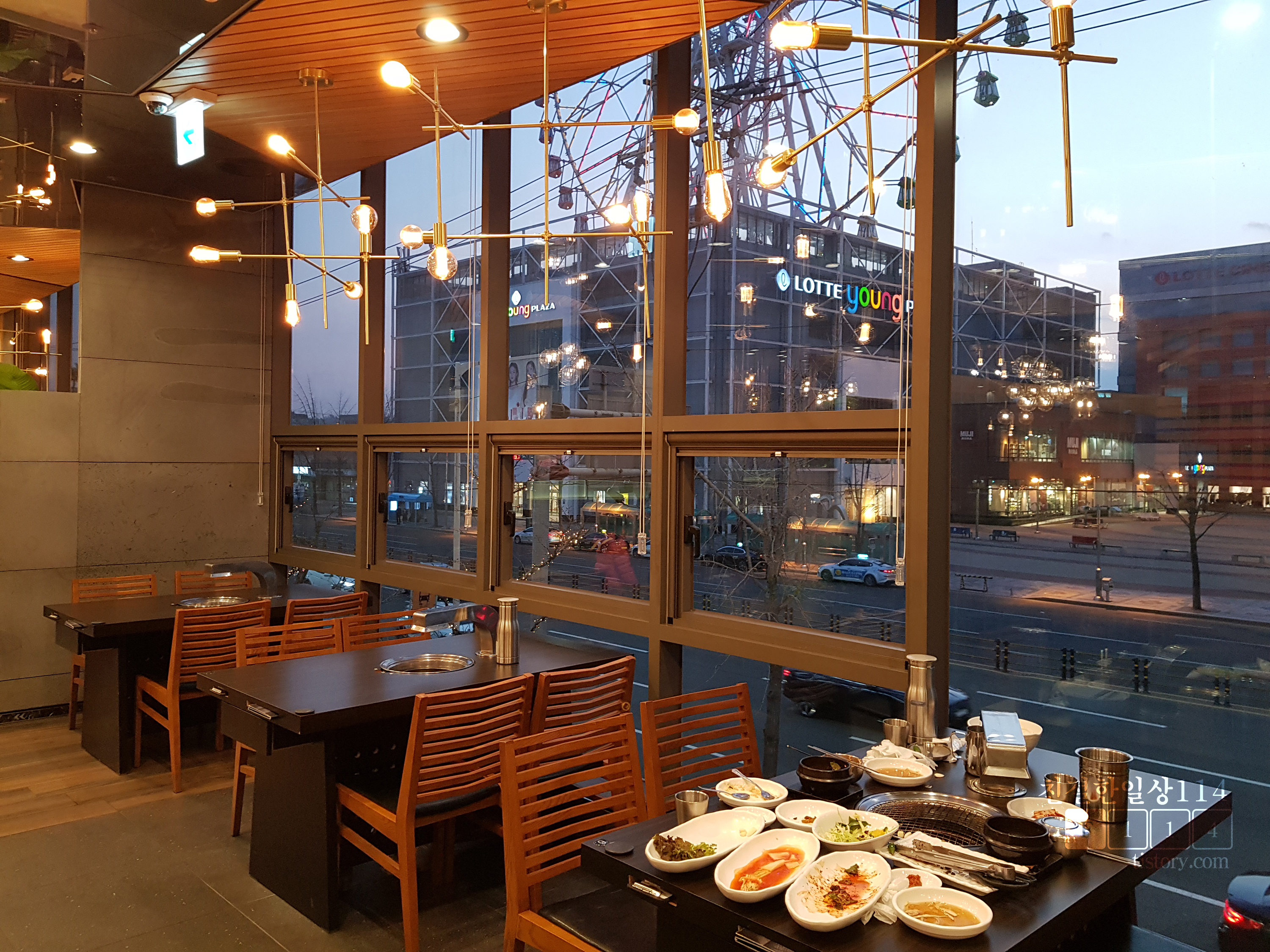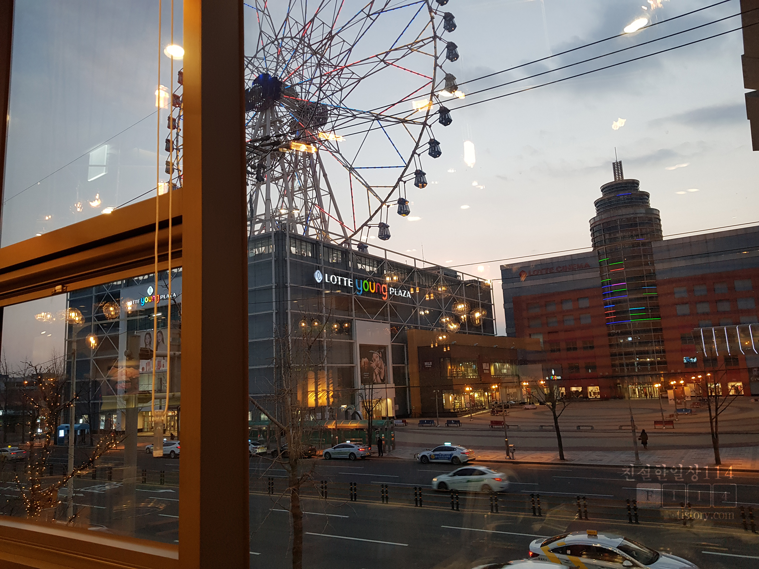상이 차려지길 기다리며 창밖을 보니 롯데시네마와 영플라자가 보인다. 그리고 아까 낮에 탔던 관람차도 보였고 마침 불이 켜지기 시작한다. 완전히 어두워졌을 밤에 온다면 야경 또한 멋질 것 같다.