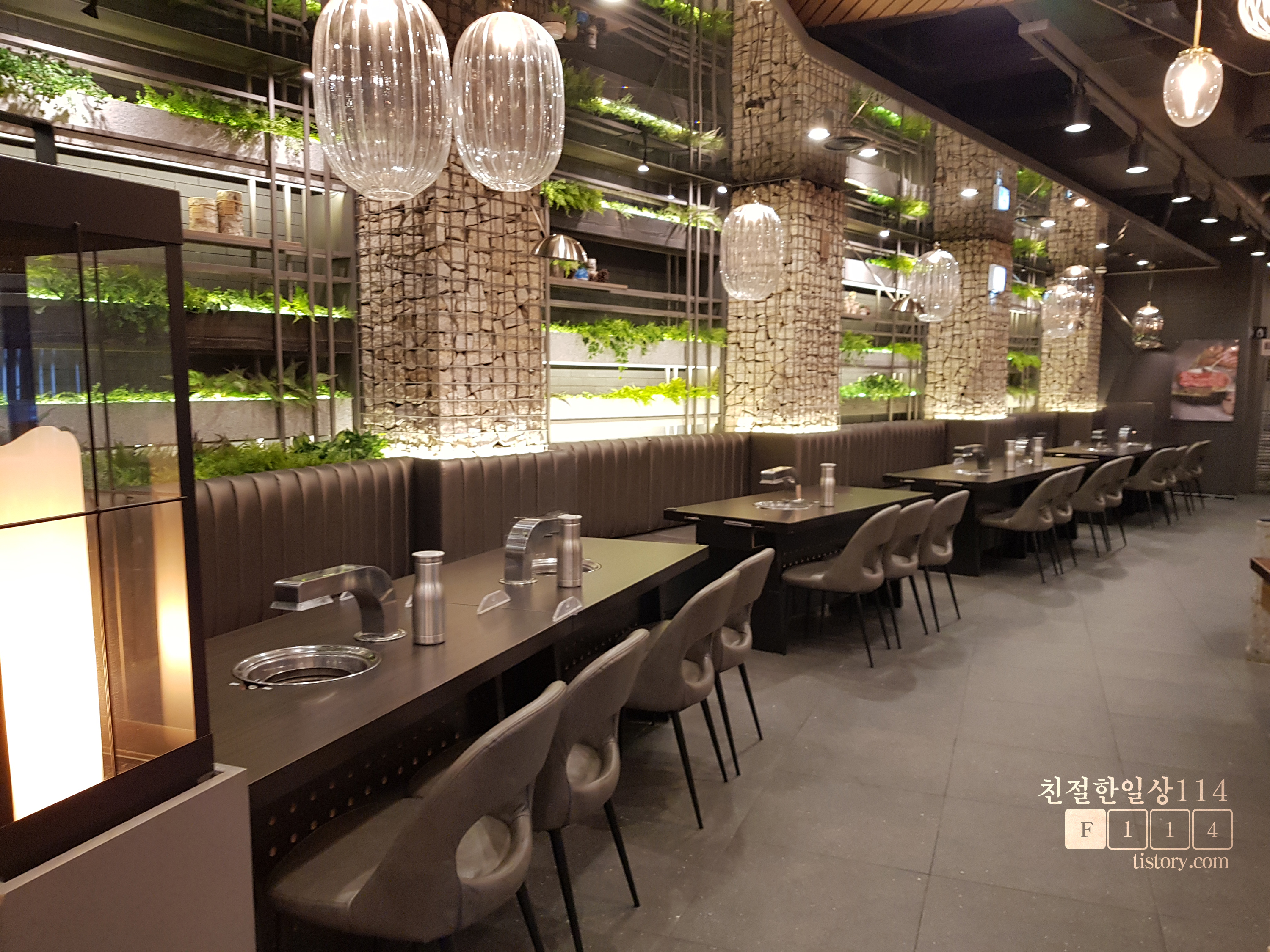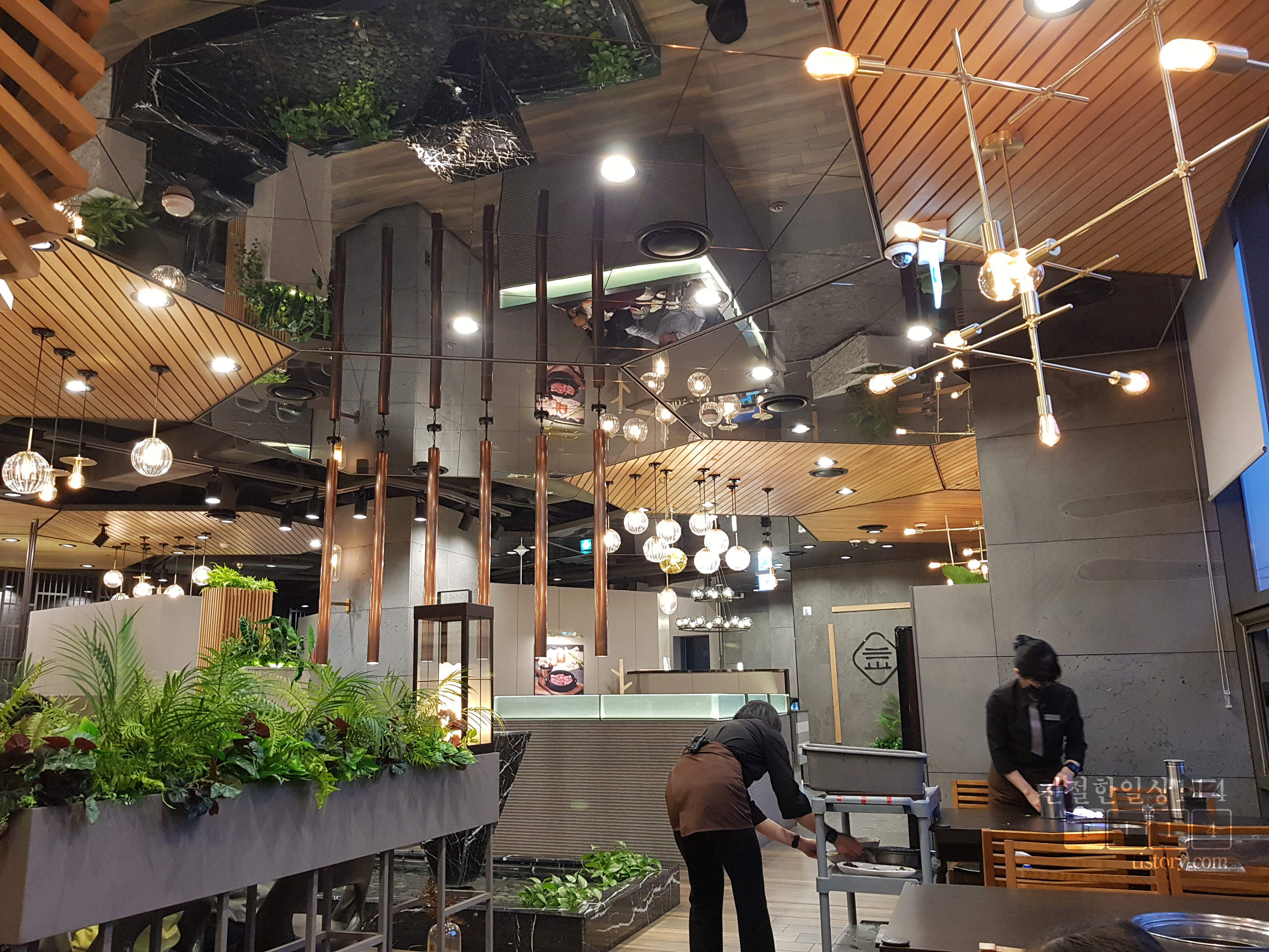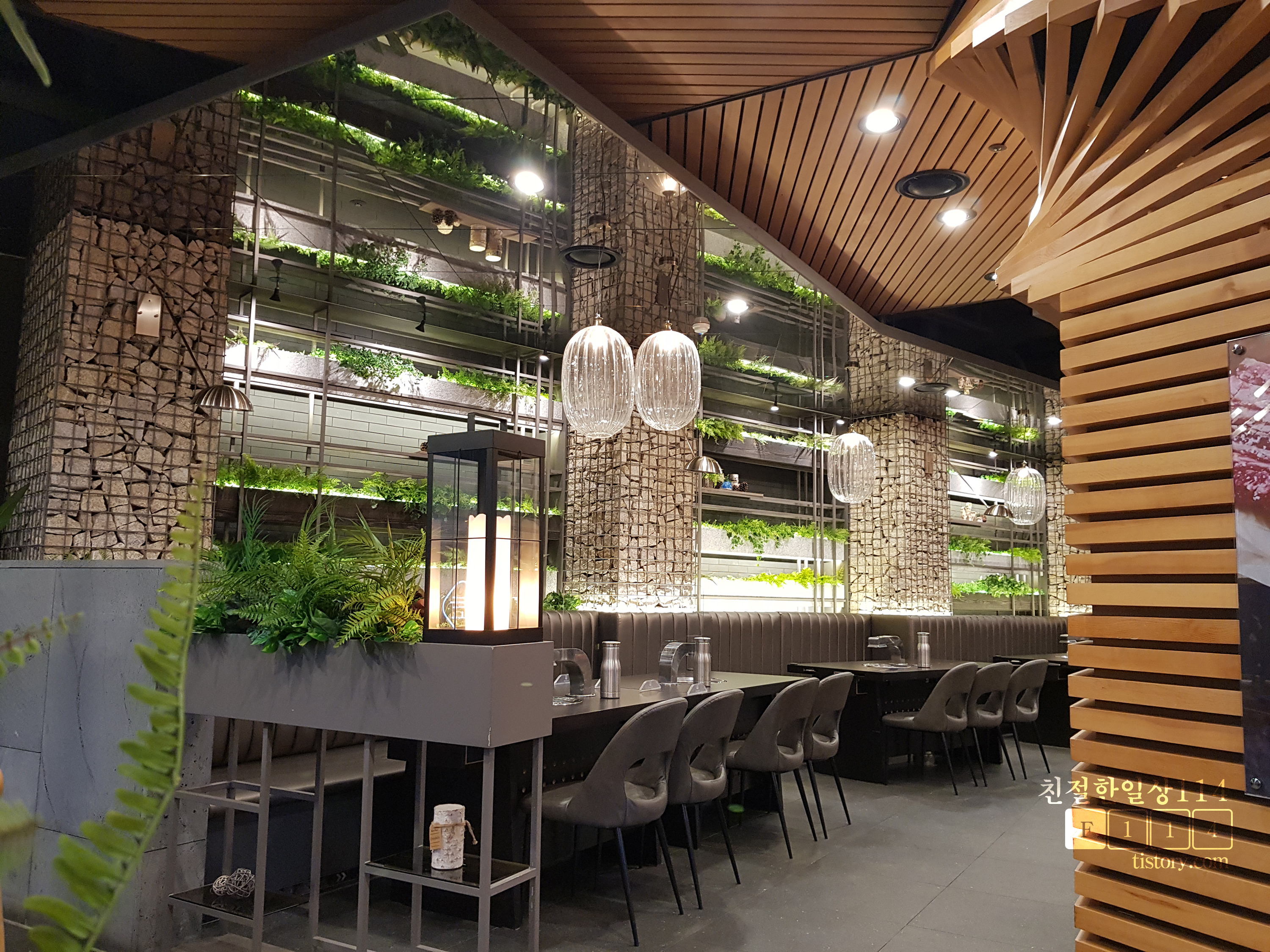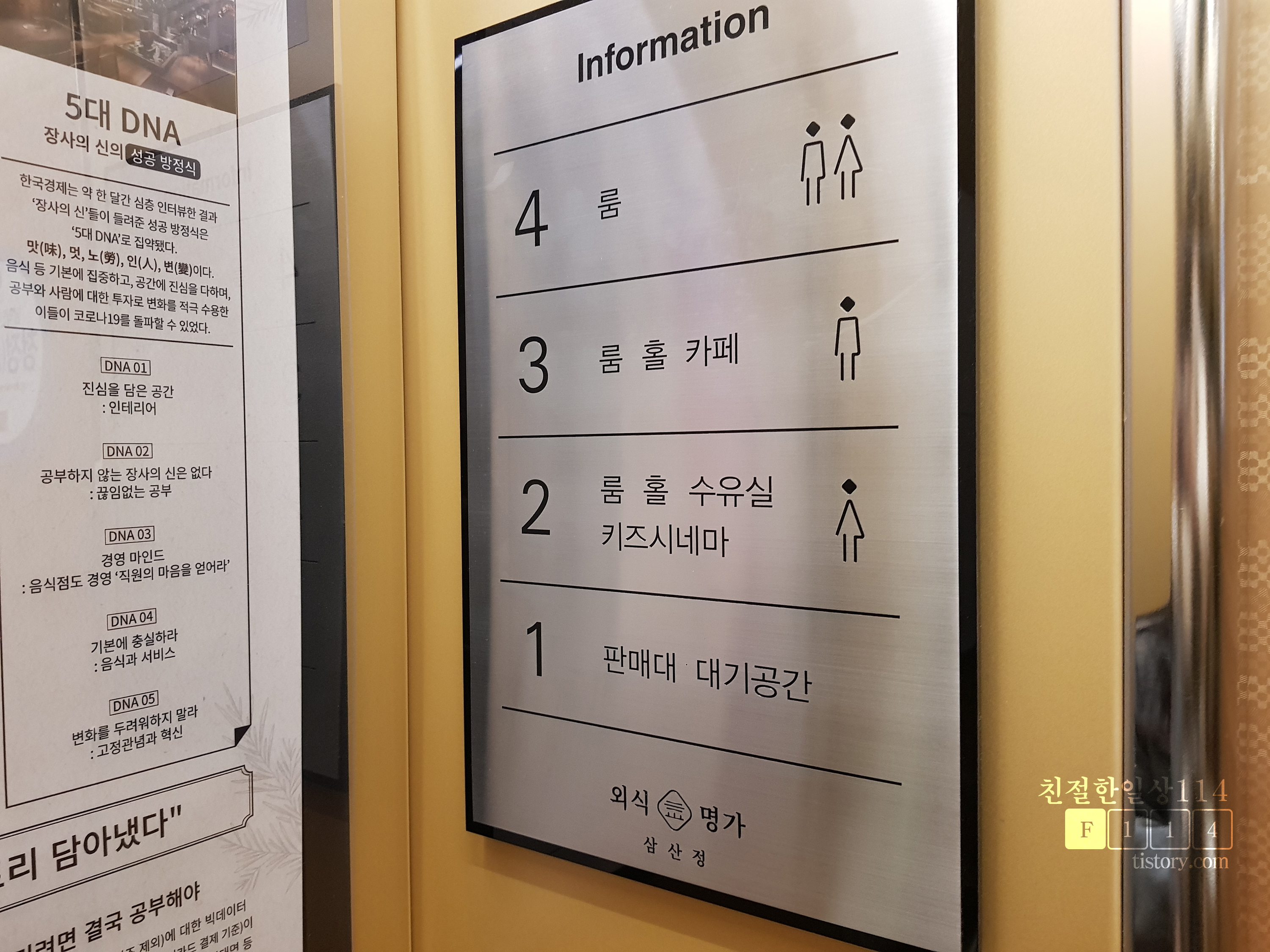 건물로 들어서면 안내데스크?가 있다. 2층으로 안내받았고 엘리베이터를 타고 올라간다. 아이가 있어서 2층으로 안내해준 듯 하다. 3층과 4층에는 룸이 있다고 하는데 프라이빗하게 가족이나 지인과 단독으로 식사하고자 할때 이용하면 좋을 듯 하다. 남자화장실은 3층, 여자화장실은 2층에 있다.
